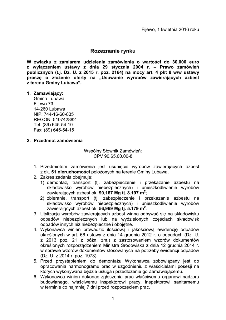 Fijewo, 1 kwietnia 2016 roku Rozeznanie rynku W związku z zamiarem udzielenia zamówienia o wartości do 30.000 euro z wyłączeniem ustawy z dnia 29 stycznia 2004 r. – Prawo zamówień publicznych (t.j. Dz. U. z 2015 r. poz. 2164) na mocy art. 4 pkt 8 w/w ustawy proszę o złożenie oferty na „Usuwanie wyrobów zawierających azbest z terenu Gminy Lubawa”. 1. Zamawiający: Gmina Lubawa Fijewo 73 14-260 Lubawa NIP: 744-16-60-835 REGON: 510742882 Tel. (89) 645-54-10 Fax: (89) 645-54-15 2. Przedmiot zamówienia Wspólny Słownik Zamówień: CPV 90.65.00.00-8 1. Przedmiotem zamówienia jest usunięcie wyrobów zawierających azbest z ok. 51 nieruchomości położonych na terenie Gminy Lubawa. 2. Zakres zadania obejmuje: 1) demontaż, transport (tj. zabezpieczenie i przekazanie azbestu na składowisko wyrobów niebezpiecznych) i unieszkodliwienie wyrobów zawierających azbest ok. 90,167 Mg tj. 8.197 m2; 2) zbieranie, transport (tj. zabezpieczenie i przekazanie azbestu na składowisko wyrobów niebezpiecznych) i unieszkodliwienie wyrobów zawierających azbest ok. 56,969 Mg tj. 5.179 m2. 3. Utylizacja wyrobów zawierających azbest winna odbywać się na składowisku odpadów niebezpiecznych lub na wydzielonych częściach składowisk odpadów innych niż niebezpieczne i obojętne. 4. Wykonawca winien prowadzić ilościową i jakościową ewidencję odpadów określonych w art. 66 ustawy z dnia 14 grudnia 2012 r. o odpadach (Dz. U. z 2013 poz. 21 z późn. zm.) z zastosowaniem wzorów dokumentów określonych rozporządzeniem Ministra Środowiska z dnia 12 grudnia 2014 r. w sprawie wzorów dokumentów stosowanych na potrzeby ewidencji odpadów (Dz. U. z 2014 r. poz. 1973). 5. Przed przystąpieniem do demontażu Wykonawca zobowiązany jest do opracowania harmonogramu prac w uzgodnieniu z właścicielami posesji na których wykonywana będzie usługa i przedłożenie go Zamawiającemu. 6. Wykonawca winien dokonać zgłoszenia prac właściwemu organowi nadzoru budowlanego, właściwemu inspektorowi pracy, inspektorowi sanitarnemu w terminie co najmniej 7 dni przed rozpoczęciem prac. 1 UWAGA: Planowana ilość do usunięcia wyrobów zawierających azbest może ulec pomniejszeniu jeżeli właściciele budynków odstąpią od umowy zawartej z zamawiającym. 3. Opis sposobu obliczania ceny. 1) Cenę należy określić w złotych polskich – PLN, podając cenę brutto (tj. cenę netto + obowiązujący podatek VAT). 2) Podana cena powinna zawierać wszelkie koszty związane z wykonaniem zamówienia. 3) Wszystkie wartości winne być określone do dwóch miejsc po przecinku. 4) Wykonawca określi cenę jednostkową za 1 Mg przedmiotu zamówienia osobno dla każdej pozycji. Wskazaną przez siebie cenę jednostkową przemnoży przez masę azbestu przeznaczonego do utylizacji. Następnie uzyskane w ten sposób wyniki zsumuje i wpisze w pole „RAZEM”. 5) Uzyskana Wartość zamówienia (z pola „RAZEM”) brana będzie do porównania złożonych przez Wykonawców ofert. 6) Cena ofertowa Wykonawcy ustalona jest na okres ważności umowy. 4. Termin realizacji zamówienia. Od dnia zawarcia umowy do dnia 15 października 2016 roku. 5. Warunki płatności. 1) Faktura/Rachunek będzie płatna przelewem w terminie 30 dni od daty prawidłowo wykonanego przedmiotu umowy, na wskazane przez Wykonawcę konto bankowe podane na fakturze/rachunku. 2) Za datę zapłaty uznaje się datę złożenia przez Zamawiającego polecenia przelewu bankowego. 3) Rozliczenie następowało będzie zgodnie z zawartą umową. 6. Rodzaje i opis kryteriów, którymi Zamawiający będzie się kierował przy wyborze oferty, wraz z podaniem znaczenia tych kryteriów i sposobu oceny ofert oraz opis sposobu obliczenia ceny. Przy wyborze ofert Zamawiający będzie się kierował następującymi kryteriami: kryterium: cena – 100% Sposób oceny ofert: Wc = Cn / Cb x 100pkt Wc – wartość punktowa oferowanej ceny oferty Cn – cena najniższa (cena brutto) Cb – cena badana (cena brutto) W przypadku odmowy podpisania umowy przez wybranego wykonawcę umowa zostanie zawarta z kolejnym wykonawcą znajdującym się na liście. W przypadku przekroczenia limitu środków na realizację niniejszego zamówienia Zamawiający zastrzega sobie prawo unieważnienia przedmiotowego postępowania. 2 7. Miejsce, sposób i termin składania ofert. Ofertę należy złożyć w formie pisemnej w zamkniętej kopercie w sekretariacie Urzędu Gminy Lubawa, Fijewo 73, 14-260 Lubawa, z oznaczeniem: Oferta na: „Usuwanie wyrobów zawierających azbest z terenu Gminy Lubawa” Ofertę należy złożyć w terminie do dnia 11.04.2016 r. do godz. 9:00 Otwarcie ofert nastąpi dnia 11.04.2016 r. o godz. 09:30 w Urzędzie Gminy Lubawa, Fijewo 73, 14-260 Lubawa, sala sesyjna Oferty, które wpłyną do Zamawiającego po wyznaczonym terminie składania ofert nie będą brane pod uwagę i pozostaną bez rozpatrzenia. 8. Opis warunków udziału w postępowaniu: O udzielenie zamówienia mogą ubiegać się wykonawcy, którzy: a) posiadają uprawnienia do wykonywania określonej działalności lub czynności, jeżeli przepisy prawa nakładają obowiązek ich posiadania; b) posiadają wiedzę i doświadczenie; c) dysponują odpowiednim potencjałem technicznym oraz osobami zdolnymi do wykonania zamówienia, tj. Wykonawca podsiada dokumenty potwierdzające ukończenie szkolenia/seminarium/kursu w sprawie zasad BHP przy zabezpieczaniu i usuwaniu wyrobów zawierających azbest; d) znajdują się w sytuacji ekonomicznej i finansowej zapewniającej wykonanie zamówienia; 9. Wykaz dokumentów, które należy dołączyć do oferty: 1) formularz ofertowy – zał. nr 1 2) dokumenty potwierdzające ukończenie szkolenia/seminarium/kursu w sprawie zasad BHP przy zabezpieczaniu i usuwaniu wyrobów zawierających azbest 10. Dane do kontaktu: Urząd Gminy Lubawa Fijewo 73, 14-260 Lubawa Łukasz Zieliński – w zakresie procedury udzielenia zamówienia Tel. (89) 645-54-42 Szymon Sza