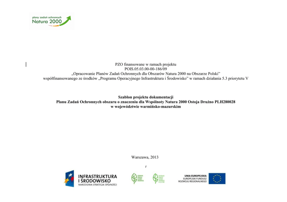 PZO finansowane w ramach projektu POIS.05.03.00-00-186/09 „Opracowanie Planów Zadań Ochronnych dla Obszarów Natura 2000 na Obszarze Polski” współfinansowanego ze środków „Programu Operacyjnego Infrastruktura i Środowisko” w ramach działania 5.3 priorytetu V Szablon projektu dokumentacji Planu Zadań Ochronnych obszaru o znaczeniu dla Wspólnoty Natura 2000 Ostoja DruŜno PLH280028 w województwie warmińsko-mazurskim Warszawa, 2013 1 Spis treści Etap I Wstępny pracy nad Planem........................................................................................................................................................................... 4 1.1 Informacje ogólne .......................................................................................................................................................................................... 4 1.2 Ustalenie terenu objętego Planem .................................................................................................................................................................. 4 1.3. Mapa obszaru Natura 2000 ........................................................................................................................................................................... 5 1.4. Opis załoŜeń do sporządzenia Planu ............................................................................................................................................................. 7 1.5. Ustalenie przedmiotów ochrony objętych Planem ...................................................................................................................................... 10 1.6. Opis procesu komunikacji z róŜnymi grupami interesu. ............................................................................................................................. 11 1.7. Kluczowe instytucje/osoby dla obszaru i zakres ich odpowiedzialności .................................................................................................... 12 1.8. Zespól Lokalnej Współpracy ...................................................................................................................................................................... 14 Etap II Opracowanie projektu Planu ..................................................................................................................................................................... 15 Moduł A................................................................................................................................................................................................................. 15 2.1. Informacja o obszarze i przedmiotach ochrony .......................................................................................................................................... 15 2.2. Ogólna charakterystyka obszaru ................................................................................................................................................................. 18 2.3. Struktura własności i uŜytkowania gruntów ............................................................................................................................................... 21 2.4. Zagospodarowanie terenu i działalność człowieka ..................................................................................................................................... 21 2.5. Istniejące i projektowane plany/programy/projekty dotyczące zagospodarowania przestrzennego ........................................................... 22 2.6. Informacja o przedmiotach ochrony objętych Planem wraz z zakresem prac terenowych – dane zweryfikowane ................................... 23 2.6.1. Typy siedlisk przyrodniczych ............................................................................................................................................................... 25 2.6.3. Gatunki zwierząt i ich siedliska występujące na terenie obszaru ......................................................................................................... 30 Moduł B ............................................................................................................................................................. Błąd! Nie zdefiniowano zakładki. 3. Stan ochrony przedmiotów ochrony objętych Planem ...................................................................................................................................... 32 4. Analiza zagroŜeń ............................................................................................................................................................................................... 46 5. Cele działań ochronnych ................................................................................................................................................................................... 49 Moduł C ................................................................................................................................................................................................................. 50 6. Ustalenie działań ochronnych............................................................................................................................................................................ 50 7. Ustalenie działań w zakresie monitoringu stanu ochrony przedmiotów ochrony ............................................................................................. 59 2 8. Wskazania do dokumentów planistycznych ...................................................................................................................................................... 61 9. Przesłanki sporządzenia planu ochrony............................................................................................................................................................. 61