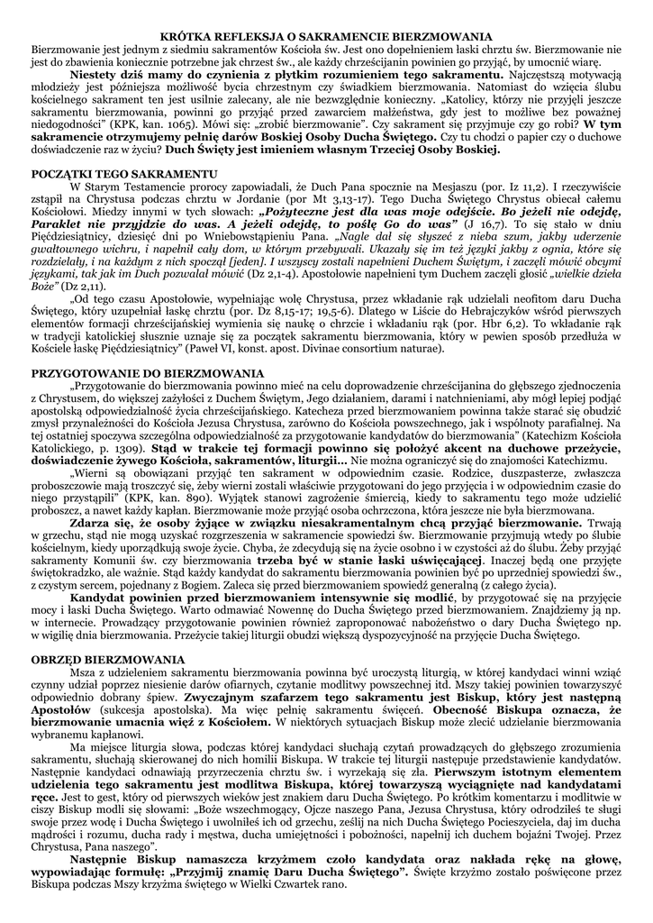 KRÓTKA REFLEKSJA O SAKRAMENCIE BIERZMOWANIA Bierzmowanie jest jednym z siedmiu sakramentów Kościoła św. Jest ono dopełnieniem łaski chrztu św. Bierzmowanie nie jest do zbawienia koniecznie potrzebne jak chrzest św., ale każdy chrześcijanin powinien go przyjąć, by umocnić wiarę. Niestety dziś mamy do czynienia z płytkim rozumieniem tego sakramentu. Najczęstszą motywacją młodzieży jest późniejsza możliwość bycia chrzestnym czy świadkiem bierzmowania. Natomiast do wzięcia ślubu kościelnego sakrament ten jest usilnie zalecany, ale nie bezwzględnie konieczny. „Katolicy, którzy nie przyjęli jeszcze sakramentu bierzmowania, powinni go przyjąć przed zawarciem małżeństwa, gdy jest to możliwe bez poważnej niedogodności” (KPK, kan. 1065). Mówi się: „zrobić bierzmowanie”. Czy sakrament się przyjmuje czy go robi? W tym sakramencie otrzymujemy pełnię darów Boskiej Osoby Ducha Świętego. Czy tu chodzi o papier czy o duchowe doświadczenie raz w życiu? Duch Święty jest imieniem własnym Trzeciej Osoby Boskiej. POCZĄTKI TEGO SAKRAMENTU W Starym Testamencie prorocy zapowiadali, że Duch Pana spocznie na Mesjaszu (por. Iz 11,2). I rzeczywiście zstąpił na Chrystusa podczas chrztu w Jordanie (por Mt 3,13-17). Tego Ducha Świętego Chrystus obiecał całemu Kościołowi. Miedzy innymi w tych słowach: „Pożyteczne jest dla was moje odejście. Bo jeżeli nie odejdę, Paraklet nie przyjdzie do was. A jeżeli odejdę, to poślę Go do was” (J 16,7). To się stało w dniu Pięćdziesiątnicy, dziesięć dni po Wniebowstąpieniu Pana. „Nagle dał się słyszeć z nieba szum, jakby uderzenie gwałtownego wichru, i napełnił cały dom, w którym przebywali. Ukazały się im też języki jakby z ognia, które się rozdzielały, i na każdym z nich spoczął [jeden]. I wszyscy zostali napełnieni Duchem Świętym, i zaczęli mówić obcymi językami, tak jak im Duch pozwalał mówić (Dz 2,1-4). Apostołowie napełnieni tym Duchem zaczęli głosić „wielkie dzieła Boże” (Dz 2,11). „Od tego czasu Apostołowie, wypełniając wolę Chrystusa, przez wkładanie rąk udzielali neofitom daru Ducha Świętego, który uzupełniał łaskę chrztu (por. Dz 8,15-17; 19,5-6). Dlatego w Liście do Hebrajczyków wśród pierwszych elementów formacji chrześcijańskiej wymienia się naukę o chrzcie i wkładaniu rąk (por. Hbr 6,2). To wkładanie rąk w tradycji katolickiej słusznie uznaje się za początek sakramentu bierzmowania, który w pewien sposób przedłuża w Kościele łaskę Pięćdziesiątnicy” (Paweł VI, konst. apost. Divinae consortium naturae). PRZYGOTOWANIE DO BIERZMOWANIA „Przygotowanie do bierzmowania powinno mieć na celu doprowadzenie chrześcijanina do głębszego zjednoczenia z Chrystusem, do większej zażyłości z Duchem Świętym, Jego działaniem, darami i natchnieniami, aby mógł lepiej podjąć apostolską odpowiedzialność życia chrześcijańskiego. Katecheza przed bierzmowaniem powinna także starać się obudzić zmysł przynależności do Kościoła Jezusa Chrystusa, zarówno do Kościoła powszechnego, jak i wspólnoty parafialnej. Na tej ostatniej spoczywa szczególna odpowiedzialność za przygotowanie kandydatów do bierzmowania” (Katechizm Kościoła Katolickiego, p. 1309). Stąd w trakcie tej formacji powinno się położyć akcent na duchowe przeżycie, doświadczenie żywego Kościoła, sakramentów, liturgii… Nie można ograniczyć się do znajomości Katechizmu. „Wierni są obowiązani przyjąć ten sakrament w odpowiednim czasie. Rodzice, duszpasterze, zwłaszcza proboszczowie mają troszczyć się, żeby wierni zostali właściwie przygotowani do jego przyjęcia i w odpowiednim czasie do niego przystąpili” (KPK, kan. 890). Wyjątek stanowi zagrożenie śmiercią, kiedy to sakramentu tego może udzielić proboszcz, a nawet każdy kapłan. Bierzmowanie może przyjąć osoba ochrzczona, która jeszcze nie była bierzmowana. Zdarza się, że osoby żyjące w związku niesakramentalnym chcą przyjąć bierzmowanie. Trwają w grzechu, stąd nie mogą uzyskać rozgrzeszenia w sakramencie spowiedzi św. Bierzmowanie przyjmują wtedy po ślubie kościelnym, kiedy uporządkują swoje życie. Chyba, że zdecydują się na życie osobno i w czystości aż do ślubu. Żeby przyjąć sakramenty Komunii św. czy bierzmowania trzeba być w stanie łaski uświęcającej. Inaczej będą one przyjęte świętokradzko, ale ważnie. Stąd każdy kandydat do sakramentu bierzmowania powinien być po uprzedniej spowiedzi św., z czystym sercem, pojednany z Bogiem. Zaleca się przed bierzmowaniem spowiedź generalną (z całego życia). Kandydat powinien przed bierzmowaniem intensywnie się modlić, by przygotować się na przyjęcie mocy i łaski Ducha Świętego. Warto odmawiać Nowennę do Ducha Świętego przed bierzmowaniem. Znajdziemy ją np. w internecie. Prowadzący przygotowanie powinien również zaproponować nabożeństwo o dary Ducha Świętego np. w wigilię dnia bierzmowania. Przeżycie takiej liturgii obudzi większą dyspozycyjność na przyjęcie Ducha Świętego. OBRZĘD BIERZMOWANIA Msza z udzieleniem sakramentu bierzmowania powinna być uroczystą liturgią, w której kandydaci winni wziąć czynny udział poprzez niesienie darów ofiarnych, czytanie modlitwy powszechnej itd. Mszy takiej powinien towarzyszyć odpowiednio dobrany śpiew. Zwyczajnym szafarzem tego sakramentu jest Biskup, który jest następną Apostołów (sukcesja apostolska). Ma więc pełnię sakramentu święceń. Obecność Biskupa oznacza, że bierzmowanie umacnia więź z Kościołem. W niektórych sytuacjach Biskup może zlecić udzielanie bierzmowania wybranemu kapłanowi. Ma miejsce liturgia słowa, podczas której kandydaci słuchają czytań prowadzących do głębszego zrozumienia sakramentu, słuchają skierowanej do nich homilii Biskupa. W trakcie tej liturgii następuje przedstawienie kandydatów. Następnie kandyd