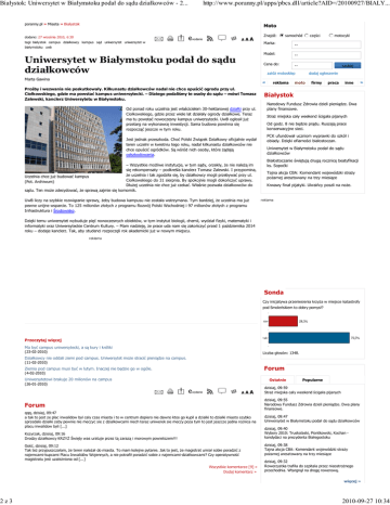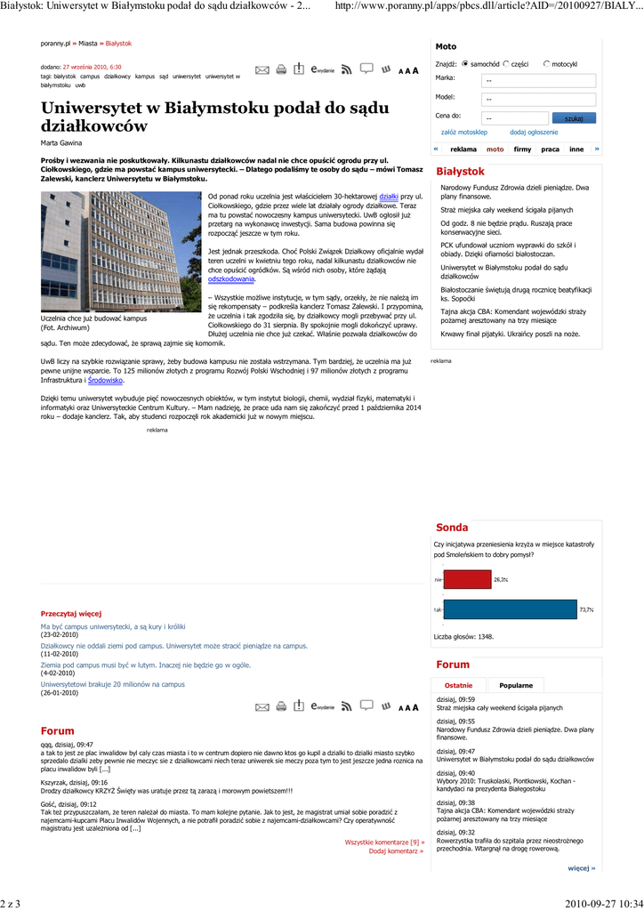 Białystok: Uniwersytet w Białymstoku podał do sądu działkowców - 2... 2z3 http://www.poranny.pl/apps/pbcs.dll/article?AID=/20100927/BIALY... poranny.pl » Miasta » Białystok Moto dodano: 27 września 2010, 6:30 AA tagi: białystok campus działkowcy kampus sąd uniwersytet uniwersytet w A Znajdź: samochód Marka: -- Model: -- Cena do: -- białymstoku uwb Uniwersytet w Białymstoku podał do sądu działkowców części szukaj załóż motosklep Marta Gawina « Prośby i wezwania nie poskutkowały. Kilkunastu działkowców nadal nie chce opuścić ogrodu przy ul. Ciołkowskiego, gdzie ma powstać kampus uniwersytecki. – Dlatego podaliśmy te osoby do sądu – mówi Tomasz Zalewski, kanclerz Uniwersytetu w Białymstoku. Od ponad roku uczelnia jest właścicielem 30-hektarowej działki przy ul. Ciołkowskiego, gdzie przez wiele lat działały ogrody działkowe. Teraz ma tu powstać nowoczesny kampus uniwersytecki. UwB ogłosił już przetarg na wykonawcę inwestycji. Sama budowa powinna się rozpocząć jeszcze w tym roku. Jest jednak przeszkoda. Choć Polski Związek Działkowy oficjalnie wydał teren uczelni w kwietniu tego roku, nadal kilkunastu działkowców nie chce opuścić ogródków. Są wśród nich osoby, które żądają odszkodowania. – Wszystkie możliwe instytucje, w tym sądy, orzekły, że nie należą im się rekompensaty – podkreśla kanclerz Tomasz Zalewski. I przypomina, że uczelnia i tak zgodziła się, by działkowcy mogli przebywać przy ul. Uczelnia chce już budować kampus Ciołkowskiego do 31 sierpnia. By spokojnie mogli dokończyć uprawy. (Fot. Archiwum) Dłużej uczelnia nie chce już czekać. Właśnie pozwała działkowców do sądu. Ten może zdecydować, że sprawą zajmie się komornik. UwB liczy na szybkie rozwiązanie sprawy, żeby budowa kampusu nie została wstrzymana. Tym bardziej, że uczelnia ma już pewne unijne wsparcie. To 125 milionów złotych z programu Rozwój Polski Wschodniej i 97 milionów złotych z programu Infrastruktura i Środowisko. reklama motocykl dodaj ogłoszenie moto firmy praca inne » Białystok Narodowy Fundusz Zdrowia dzieli pieniądze. Dwa plany finansowe. Straż miejska cały weekend ścigała pijanych Od godz. 8 nie będzie prądu. Ruszają prace konserwacyjne sieci. PCK ufundował uczniom wyprawki do szkół i obiady. Dzięki ofiarności białostoczan. Uniwersytet w Białymstoku podał do sądu działkowców Białostoczanie świętują drugą rocznicę beatyfikacji ks. Sopoćki Tajna akcja CBA: Komendant wojewódzki straży pożarnej aresztowany na trzy miesiące Krwawy finał pijatyki. Ukraińcy poszli na noże. reklama Dzięki temu uniwersytet wybuduje pięć nowoczesnych obiektów, w tym instytut biologii, chemii, wydział fizyki, matematyki i informatyki oraz Uniwersyteckie Centrum Kultury. – Mam nadzieję, że prace uda nam się zakończyć przed 1 października 2014 roku – dodaje kanclerz. Tak, aby studenci rozpoczęli rok akademicki już w nowym miejscu. reklama Sonda Czy inicjatywa przeniesienia krzyża w miejsce katastrofy pod Smoleńskiem to dobry pomysł? Przeczytaj więcej Ma być campus uniwersytecki, a są kury i króliki (23-02-2010) Liczba głosów: 1348. Działkowcy nie oddali ziemi pod campus. Uniwersytet może stracić pieniądze na campus. (11-02-2010) Forum Ziemia pod campus musi być w lutym. Inaczej nie będzie go w ogóle. (4-02-2010) Uniwersytetowi brakuje 20 milionów na campus Ostatnie Popularne (26-01-2010) AA A dzisiaj, 09:59 Straż miejska cały weekend ścigała pijanych Forum dzisiaj, 09:55 Narodowy Fundusz Zdrowia dzieli pieniądze. Dwa plany finansowe. qqq, dzisiaj, 09:47 a tak to jest ze plac inwalidow byl caly czas miasta i to w centrum dopiero nie dawno ktos go kupil a dzialki to dzialki miasto szybko sprzedalo dzialki zeby pewnie nie meczyc sie z dzialkowcami niech teraz uniwerek sie meczy poza tym to jest jeszcze jedna roznica na placu inwalidow byli [...] dzisiaj, 09:47 Uniwersytet w Białymstoku podał do sądu działkowców Kszyrzak, dzisiaj, 09:16 Drodzy działkowcy KRZYŻ Święty was uratuje przez tą zarazą i morowym powietszem!!! Gość, dzisiaj, 09:12 Tak też przypuszczałam, że teren należał do miasta. To mam kolejne pytanie. Jak to jest, że magistrat umiał sobie poradzić z najemcami-kupcami Placu Inwalidów Wojennych, a nie potrafił poradzić sobie z najemcami-działkowcami? Czy operatywność magistratu jest uzależniona od [...] Wszystkie komentarze [9] » Dodaj komentarz » dzisiaj, 09:40 Wybory 2010: Truskolaski, Piontkowski, Kochan kandydaci na prezydenta Białegostoku dzisiaj, 09:38 Tajna akcja CBA: Komendant wojewódzki straży pożarnej aresztowany na trzy miesiące dzisiaj, 09:32 Rowerzystka trafiła do szpitala przez nieostrożnego przechodnia. Wtargnął na drogę rowerową. więcej » 2010-09-27 10:34