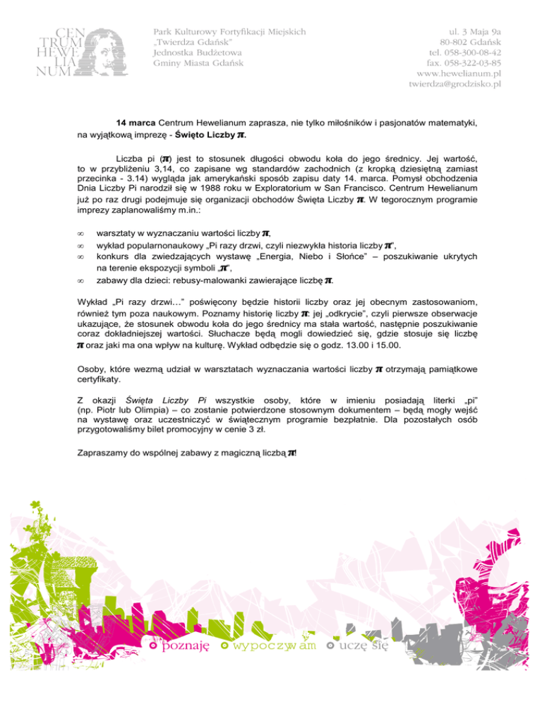 14 marca Centrum Hewelianum zaprasza, nie tylko miłośników i pasjonatów matematyki, na wyjątkową imprezę - Święto Liczby π. Liczba pi (π) jest to stosunek długości obwodu koła do jego średnicy. Jej wartość, to w przybliŜeniu 3,14, co zapisane wg standardów zachodnich (z kropką dziesiętną zamiast przecinka - 3.14) wygląda jak amerykański sposób zapisu daty 14. marca. Pomysł obchodzenia Dnia Liczby Pi narodził się w 1988 roku w Exploratorium w San Francisco. Centrum Hewelianum juŜ po raz drugi podejmuje się organizacji obchodów Święta Liczby π. W tegorocznym programie imprezy zaplanowaliśmy m.in.: • • • • warsztaty w wyznaczaniu wartości liczby π, wykład popularnonaukowy „Pi razy drzwi, czyli niezwykła historia liczby π”, konkurs dla zwiedzających wystawę „Energia, Niebo i Słońce” – poszukiwanie ukrytych na terenie ekspozycji symboli „π”, zabawy dla dzieci: rebusy-malowanki zawierające liczbę π. Wykład „Pi razy drzwi…” poświęcony będzie historii liczby oraz jej obecnym zastosowaniom, równieŜ tym poza naukowym. Poznamy historię liczby π: jej „odkrycie”, czyli pierwsze obserwacje ukazujące, Ŝe stosunek obwodu koła do jego średnicy ma stała wartość, następnie poszukiwanie coraz dokładniejszej wartości. Słuchacze będą mogli dowiedzieć się, gdzie stosuje się liczbę π oraz jaki ma ona wpływ na kulturę. Wykład odbędzie się o godz. 13.00 i 15.00. Osoby, które wezmą udział w warsztatach wyznaczania wartości liczby certyfikaty. π otrzymają pamiątkowe Z okazji Święta Liczby Pi wszystkie osoby, które w imieniu posiadają literki „pi” (np. Piotr lub Olimpia) – co zostanie potwierdzone stosownym dokumentem – będą mogły wejść na wystawę oraz uczestniczyć w świątecznym programie bezpłatnie. Dla pozostałych osób przygotowaliśmy bilet promocyjny w cenie 3 zł. Zapraszamy do wspólnej zabawy z magiczną liczbą π!