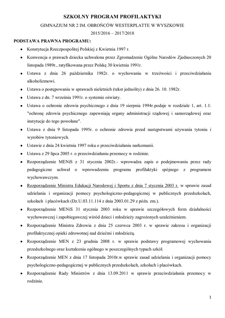 SZKOLNY PROGRAM PROFILAKTYKI GIMNAZJUM NR 2 IM. OBROŃCÓW WESTERPLATTE W WYSZKOWIE 2015/2016 – 2017/2018 PODSTAWA PRAWNA PROGRAMU: Konstytucja Rzeczpospolitej Polskiej z Kwietnia 1997 r. Konwencja o prawach dziecka uchwalona przez Zgromadzenie Ogólne Narodów Zjednoczonych 20 listopada 1989r., ratyfikowana przez Polskę 30 kwietnia 1991r. Ustawa z dnia 26 października 1982r. o wychowaniu w trzeźwości i przeciwdziałaniu alkoholizmowi. Ustawa o postępowaniu w sprawach nieletnich (tekst jednolity) z dnia 26. 10. 1982r. Ustawa z dn. 7 września 1991r. o systemie oświaty. Ustawa o ochronie zdrowia psychicznego z dnia 19 sierpnia 1994r.podaje w rozdziale 1, art. 1.1: "ochronę zdrowia psychicznego zapewniają organy administracji rządowej i samorządowej oraz instytucje do tego powołane". Ustawa z dnia 9 listopada 1995r. o ochronie zdrowia przed następstwami używania tytoniu i wyrobów tytoniowych. Ustawie z dnia 24 kwietnia 1997 roku o przeciwdziałaniu narkomanii. Ustawa z 29 lipca 2005 r. o przeciwdziałaniu przemocy w rodzinie. Rozporządzenie MENiS z 31 stycznia 2002r.- wprowadza zapis o podejmowaniu przez rady pedagogiczne uchwał o wprowadzeniu programu profilaktyki spójnego z programem wychowawczym. Rozporządzenie Ministra Edukacji Narodowej i Sportu z dnia 7 stycznia 2003 r. w sprawie zasad udzielania i organizacji pomocy psychologiczno-pedagogicznej w publicznych przedszkolach, szkołach i placówkach (Dz.U.03.11.114 z dnia 2003.01.29 z późn. zm.). Rozporządzenie MENiS 31 stycznia 2003 roku w sprawie szczegółowych form działalności wychowawczej i zapobiegawczej wśród dzieci i młodzieży zagrożonych uzależnieniem. Rozporządzenie Ministra Zdrowia z dnia 25 czerwca 2003 r. w sprawie zakresu i organizacji profilaktycznej opieki zdrowotnej nad dziećmi i młodzieżą. Rozporządzenie MEN z 23 grudnia 2008 r. w sprawie podstawy programowej wychowania przedszkolnego oraz kształcenia ogólnego w poszczególnych typach szkół. Rozporządzenie MEN z dnia 17 listopada 2010r.w sprawie zasad udzielania i organizacji pomocy psychologiczno-pedagogicznej w publicznych przedszkolach, szkołach i placówkach. Rozporządzenie Rady Ministrów z dnia 13.09.2011 w sprawie przeciwdziałania przemocy w rodzinie. 1 Konwencja o Prawach Dziecka uchwalona przez Zgromadzenie Ogólne Narodów Zjednoczonych 20 listopada 1989r., ratyfikowana przez Polskę 30 kwietnia 1991r. Art. 27. 1. "Państwa - Strony uznają prawo każdego dziecka do poziomu życia odpowiadającego jego rozwojowi fizycznemu, psychicznemu, duchowemu, moralnemu i społecznemu". Statut Gimnazjum nr 2 im. Obrońców Westerplatte w Wyszkowie. ZAŁOŻENIA PROGRAMU PROFILAKTYCZNEGO: Szkolny Program Profilaktyki został opracowany na potrzeby Gimnazjum nr 2 im. Obrońców Westerplatte w Wyszkowie. Profilaktyka to proces wspomagania człowieka w z trudnościami zagrażającymi prawidłowemu radzeniu sobie rozwojowi i zdrowemu życiu, a także ograniczenie i likwidowanie czynników niekorzystnych dla życia i zdrowia jednostki. Głównym założeniem profilaktycznym jest dążenie do wielopoziomowego rozwoju osobistego ucznia poprzez kształtowanie pozytywnych wzorców postaw i zachowań przygotowujących go do uczestnictwa w życiu zawodowym, rodzinnym i kulturalnym. Celem ochrony uczniów przed zakłóceniami w ich rozwoju oraz wyposażeniem młodzieży w mechanizmy radzenia sobie z zagrożeniami współczesnego świata w Szkolnym Programie Profilaktycznym umieszczono również działania, które mają na celu zapobieganie takim zachowaniom jak: agresja, zażywanie środków psychoaktywnych, brak kultury osobistej, zaburzenia odżywiania, brak kultury osobistej oraz cyberprzemoc. Profilaktyka jest chronieniem człowieka w rozwoju przed zagrożeniami i reagowaniem na nie. Jej celem jest ochrona człowieka, ucznia, wychowanka przed wszelkimi zakłóceniami rozwoju. Oddziaływanie profilaktyczne ma szczególne znaczenie w odniesieniu do dzieci i młodzieży w okresie dorastania (10-18 lat). Jest to faza rozwoju stanowiąca pomost pomiędzy dzieciństwem a dorosłością, w czasie której dokonuje się wiele intensywnych, jakościowych zmian w osobowości człowieka. Zmiany te prowokowane intensywnym rozwojem biologicznym, mają swój wyraz w emocjonalności i duchowości, od dążenia do większej samodzielności aż po określenie własnej tożsamości. Jest to czas w rozwoju młodego człowieka podatny na zakłócenia i podejmowanie ryzykownych zachowań. Profilaktyka podejmowana przez szkołę ma za zadanie ochronę młodzieży przed tymi zachowaniami. • Szkoła jest miejscem profilaktyki pierwszorzędowej, skierowanej do grupy niskiego ryzyka. • Profilaktyka pierwszorzędowa polega na promowaniu zdrowego stylu życia i zapobieganiu zagrożeniom, w szczególności na rozwijaniu umiejętności radzenia sobie z wymogami życia. Jej celem jest opóźnienie inicjacji lub zachęcanie do abstynencji. • Szkolny Program Profilaktyki obejmuje działania podejmowane w trakcie realizacji programów nauczania i Programu Wychowawczego Gimnazjum nr 2 w Wyszkowie. 2 CEL GŁÓWNY: Ochronić ucznia przed zakłóceniami w jego rozwoju. CELE SZCZEGÓŁOWE: Wskazują nam, w jaką wiedzę wyposażyć uczniów, jakich umiejętności życiowych uczyć i jakie postawy preferować, aby zminimalizować zakłócenia w ich rozwoju: • Rozwijanie ważnych umiejętności interpersonalnych. • Poszerzanie wiedzy na temat zaburzeń odżywiania. • Kształtowanie umiejętności adekwatnej samooceny i pozytywnego myślenia. • Uczenie zachowań sprzyjających kształtowaniu właściwych postaw społecznych i budowaniu własnego systemu wartości. • Wdrażanie do umiejętności, rozwiązywania problemów podejmowania decyzji i przewidywania konsekwencji własnych zachowań. • Wdrażanie do umiejętności radzenia sobie sytuacjach trudnych. • Podnoszenie świadomości prozdrowotnej. STRUKTURA ODDZIAŁYWAŃ PROFILAKTYCZNYCH RADA PEDAGOGICZNA: