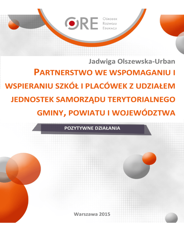 Jadwiga Olszewska-Urban PARTNERSTWO WE WSPOMAGANIU I WSPIERANIU SZKÓŁ I PLACÓWEK Z UDZIAŁEM JEDNOSTEK SAMORZĄDU TERYTORIALNEGO GMINY, POWIATU I WOJEWÓ DZTWA POZYTYWNE DZIAŁANIA Warszawa 2015 Creative Commons - Uznanie autorstwa-Użycie niekomercyjne-Na tych samych warunkach 3.0 Polska J. Olszowska-urban • Partnerstwo we wspomaganiu i wspieraniu szkół… • Redakcja Projekt graficzny i skład Łukasz Kluz Wykorzystano elementy projektu Studia Kreatywnego Małgorzaty Barskiej Ośrodek Rozwoju Edukacji Warszawa 2014 Udostępnianie Ośrodek Rozwoju Edukacji 00-478 Warszawa Aleje Ujazdowskie 28 www.ore.edu.pl Materiał przygotowany w ramach programu System doskonalenia nauczycieli oparty na ogólnodostępnym kompleksowym wspomaganiu szkół, realizowanego przez Ośrodek Rozwoju Edukacji. Projekt współfinansowany przez Unię Europejską w ramach środków Europejskiego Funduszu Społecznego. Projekt jest współfinansowany przez Unię Europejską w ramach środków Europejskiego Funduszu Społecznego 2 J. Olszowska-urban • Partnerstwo we wspomaganiu i wspieraniu szkół… • Wprowadzana obecnie nowa formuła doskonalenia nauczycieli opiera się na kilku podstawowych założeniach: wspomaganie jest adresowane do szkoły, nie zaś wyłącznie do poszczególnych osób lub grup, takich jak dyrektor czy nauczyciele; wspomaganie pomaga szkole w rozwiązywaniu własnych problemów, a co za tym idzie – nie wyręcza jej i nie narzuca rozwiązań; wspomaganie wynika z analizy indywidualnej sytuacji szkoły i odpowiada na jej specyficzne potrzeby; wspomaganie jest procesem, czyli odchodzi od pojedynczych, samodzielnych form doskonalenia1. Zgodnie z zapisami rozporządzenia MEN dnia 26 października 2012 r. zmieniającego rozporządzenie w sprawie placówek doskonalenia nauczycieli; rozporządzenia MEN z dnia 1 lutego 2013 r. w sprawie szczegółowych zasad działania publicznych poradni psychologicznopedagogicznych, w tym publicznych poradni specjalistycznych oraz rozporządzenia MEN z dnia 28 lutego 2013 r. w sprawie szczegółowych zasad działania publicznych bibliotek pedagogicznych wspomaganie przedszkoli, szkół i placówek obejmuje: 1/ pomoc w diagnozowaniu potrzeb przedszkola, szkoły lub placówki; 2/ ustalenie sposobów działania prowadzących do zaspokojenia potrzeb przedszkola, szkoły lub placówki; 3/ zaplanowanie form wspomagania i ich realizację; 4/ wspólną ocenę efektów i opracowanie wniosków z realizacji zaplanowanych form wspomagania. Zmiany w podejściu do doskonalenia nauczycieli – poprzez wprowadzenie kompleksowego wspomagania szkół – powodują, że szkoła/placówka jako organizacja ucząca i doskonaląca się ma szansę wykorzystać wszelkiego rodzaju możliwości do rozwoju i podnoszenia jakości kształcenia. W doskonaleniu nauczycieli następuje zmiana paradygmatu, która angażuje we wspomaganie szkoły i placówki szerokie grono partnerów lokalnych: samorząd terytorialny, placówki doskonalenia nauczycieli, biblioteki pedagogiczne, poradnie psychologicznopedagogiczne, rodziców, organizacje pozarządowe i inne instytucje samorządu terytorialnego, które mogą wesprzeć szkoły i placówki w diagnozie potrzeb oraz w rozwiązywaniu problemów i wdrażaniu nowych rozwiązań. Wspomaganie jest procesem adresowanym do szkoły/placówki, a nie zaś wyłącznie do poszczególnych osób lub grup, czyli odchodzi od pojedynczych form doskonalenia na rzecz 1 Zob. System doskonalenia nauczycieli oparty na ogólnodostępnym kompleksowym wspomaganiu szkół [online, dostęp dn. 16.02.2015]. Projekt jest współfinansowany przez Unię Europejską w ramach środków Europejskiego Funduszu Społecznego 3 J. Olszowska-urban • Partnerstwo we wspomaganiu i wspieraniu szkół… • długofalowych form pomocy. Szkoła bierze odpowiedzialność za wybór sposobu realizowania wspomagania, motywowanie nauczycieli do samodzielnej refleksji nad własną pracą. Ważne jest, że wspomaganie wynika z analizy indywidualnej sytuacji szkoły/placówki i odpowiada na jej specyficzne potrzeby, pozwala dopasować ofertę i przebieg procesu doskonalenia do aktualnych potrzeb konkretnej szkoły; towarzyszyć szkole w całym procesie doskonalenia – od diagnozy potrzeb po monitorowanie efektów wprowadzanych zmian. W procesie wspomagania uwzględnia się efekty kształcenia, w szczególności wyniki ewaluacji zewnętrznej i wewnętrznej szkoły lub placówki, oraz wyniki sprawdzianu i egzaminów zewnętrznych. Dlatego w kompleksowym wspomaganiu szkół należy wykorzystać ideę partnerstwa, współpracy, dialogu do planowania: rozwoju ucznia, nauczyciela, dyrektora, szkoły, środowiska lokalnego. Partnerstwo to platforma współpracy pomiędzy różnymi partnerami lokalnymi, którzy wspólnie, w sposób systematyczny, trwały i z wykorzystaniem innowacyjnych metod i środków, realizują określone działania na rzecz zbiorowości lokalnej, rozwoju lokalnego, edukacji, rynku pracy, rozwoju społeczno-gospodarczego w gminie, powiecie, województwie. Partnerstwo lokalne w gminie, powiecie, województwie polega na współpracy, łączeniu swoich lokalnych zasobów przy realizacji zadań publicznych samorządu lokalnego i rozwiązywaniu problemów z zakresu rozwoju lokalnego, regionalnego, edukacji, rynku pracy i pomocy społecznej, przeciwdziałania ubóstwu i biedzie itp. Wspomaganie w systemie oświaty odgrywa ogromną rolę kształceniu i kształtowaniu obywatela, pracownika, pracodawcy, mieszkańca, rozwoju społeczeństwa obywatelskiego i rozwoju społeczno-gospodarczego. W partnerstwie zostaje wypracowany system trwałych więzi i relacji łączących poszczególnych partnerów wspierających działania różnorodnych jednostek, organizacji, firm, sektorów. Wspomaganie i wspieranie to wspólna sprawa jednostek samorządu terytorialnego i partnerów lokalnych na poziomie gminy i powiatu, gdyż: pozwala wykorzystywać potencjał różnych instytucji, które świadczą 