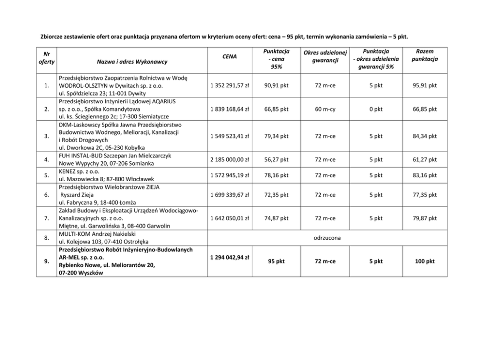 Zbiorcze zestawienie ofert oraz punktacja przyznana ofertom w kryterium oceny ofert: cena – 95 pkt, termin wykonania zamówienia – 5 pkt. Nr oferty 1. 2. 3. 4. 5. 6. 7. 8. 9. Nazwa i adres Wykonawcy Przedsiębiorstwo Zaopatrzenia Rolnictwa w Wodę WODROL-OLSZTYN w Dywitach sp. z o.o. ul. Spółdzielcza 23; 11-001 Dywity Przedsiębiorstwo Inżynierii Lądowej AQARIUS sp. z o.o., Spółka Komandytowa ul. ks. Ściegiennego 2c; 17-300 Siemiatycze DKM-Laskowscy Spółka Jawna Przedsiębiorstwo Budownictwa Wodnego, Melioracji, Kanalizacji i Robót Drogowych ul. Dworkowa 2C, 05-230 Kobyłka FUH INSTAL-BUD Szczepan Jan Mielczarczyk Nowe Wypychy 20, 07-206 Somianka KENEZ sp. z o.o. ul. Mazowiecka 8; 87-800 Włocławek Przedsiębiorstwo Wielobranżowe ZIEJA Ryszard Zieja ul. Fabryczna 9, 18-400 Łomża Zakład Budowy i Eksploatacji Urządzeń WodociągowoKanalizacyjnych sp. z o.o. Miętne, ul. Garwolińska 3, 08-400 Garwolin MULTI-KOM Andrzej Nakielski ul. Kolejowa 103, 07-410 Ostrołęka Przedsiębiorstwo Robót Inżynieryjno-Budowlanych AR-MEL sp. z o.o. Rybienko Nowe, ul. Meliorantów 20, 07-200 Wyszków CENA Punktacja - cena 95% Okres udzielonej gwarancji Punktacja - okres udzielenia gwarancji 5% Razem punktacja 1 352 291,57 zł 90,91 pkt 72 m-ce 5 pkt 95,91 pkt 1 839 168,64 zł 66,85 pkt 60 m-cy 0 pkt 66,85 pkt 1 549 523,41 zł 79,34 pkt 72 m-ce 5 pkt 84,34 pkt 2 185 000,00 zł 56,27 pkt 72 m-ce 5 pkt 61,27 pkt 1 572 945,19 zł 78,16 pkt 72 m-ce 5 pkt 83,16 pkt 1 699 339,67 zł 72,35 pkt 72 m-ce 5 pkt 77,35 pkt 1 642 050,01 zł 74,87 pkt 72 m-ce 5 pkt 79,87 pkt 5 pkt 100 pkt odrzucona 1 294 042,94 zł 95 pkt 72 m-ce 10. 11. 12. 13. 14. 15. 16. 17. 18. 19. Konsorcjum firm: 1. Wodociągi Wiejskie sp. z o.o. w Łomży ul. Akademicka 18, 18-402 Łomża - lider 2. Przedsiębiorstwo Handlowo-Usługowe HYDROTECH Bernard Zbigniew Krajewski ul. Słoneczna 17; 18-400 Stara Łomża przy szosie Przedsiębiorstwo Budownictwa Inżynieryjnego MELBUD sp. z o.o. ul. Karowa 25; 08-110 Siedlce Przedsiębiorstwo Budownictwa Ogólnego i Robót Inżynieryjnych Inżynieria sp. z o.o. ul. Mazowiecka 9; 09-100 Płońsk Konsorcjum firm: 1. PLAST-BUD Zofia i Kazimierz Olszewscy sp. jawna - lider ul. Bielińska 2, 06-400 Ciechanów 2. Przedsiębiorstwo Robót Wodno-Inżynieryjnych MELWOBUD sp. z o.o. ul. Niechodzka 7; 06-400 Ciechanów Przedsiębiorstwo Budowlano-Handlowe Z. Niziński Zdzisław Niziński ul. Serocka 11A, 07-200 Wyszków SANPROD sp. z o.o. ul. Zawadzkiego "Zośki" 8, 07-410 Ostrołęka PARSTER sp. z o.o. ul. Mickiewicza 32, 21-200 Parczew Przedsiębiorstwo Robót Inżynieryjnych Budownictwa sp. z o.o. ul. Cementowa 3, 10-429 Olsztyn Zakład Usługowy WOD-BUD Zdzisław Kliński Nasiegniewo 62A, 87-811 Fabianki Przedsiębiorstwo Instalacyjne PRIM S.A. Ul. Suwalska 84, 19-300 Ełk 1 888 207,96 zł 65,11 pkt 60 m-cy 0 pkt 70,11 pkt 1 902 369,65 zł 64,63 pkt 60 m-cy 0 pkt 64,63 pkt 3 037 060,64 zł 40,48 pkt 72 m-ce 5 pkt 45,48 pkt 1 819 873,39 zł 67,55 pkt 72 m-ce 5 pkt 72,55 pkt 1 722 505,17 zł 71,37 pkt 72 m-ce 5 pkt 76,37 pkt 5 pkt 90,38 pkt 60 m-cy 0 pkt 82,18 pkt 72 m-ce 5 pkt 99,60 pkt odrzucona 1 439 917,83 zł 85,38 pkt 72 m-ce odrzucona 1 495 973,32 zł 1 299 507,30 zł 82,18 pkt 94,60 pkt