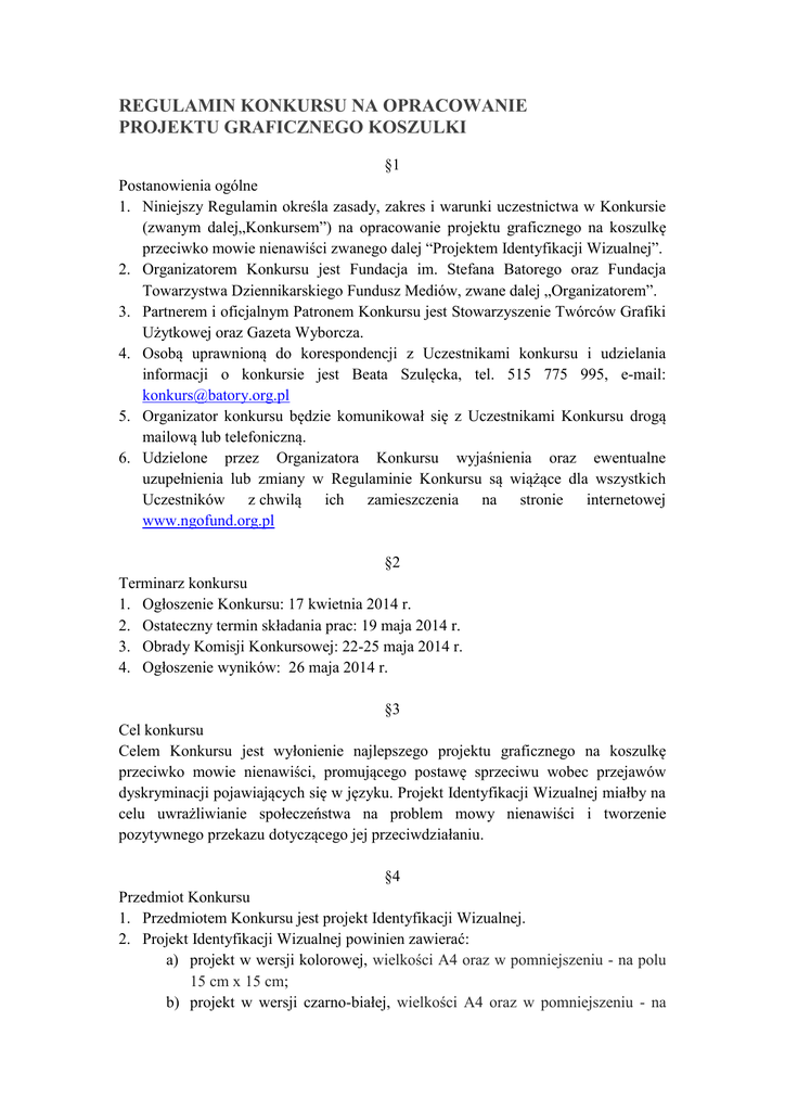 REGULAMIN KONKURSU NA OPRACOWANIE PROJEKTU GRAFICZNEGO KOSZULKI §1 Postanowienia ogólne 1. Niniejszy Regulamin określa zasady, zakres i warunki uczestnictwa w Konkursie (zwanym dalej„Konkursem”) na opracowanie projektu graficznego na koszulkę przeciwko mowie nienawiści zwanego dalej “Projektem Identyfikacji Wizualnej”. 2. Organizatorem Konkursu jest Fundacja im. Stefana Batorego oraz Fundacja Towarzystwa Dziennikarskiego Fundusz Mediów, zwane dalej „Organizatorem”. 3. Partnerem i oficjalnym Patronem Konkursu jest Stowarzyszenie Twórców Grafiki Użytkowej oraz Gazeta Wyborcza. 4. Osobą uprawnioną do korespondencji z Uczestnikami konkursu i udzielania informacji o konkursie jest Beata Szulęcka, tel. 515 775 995, e-mail: [email protected] 5. Organizator konkursu będzie komunikował się z Uczestnikami Konkursu drogą mailową lub telefoniczną. 6. Udzielone przez Organizatora Konkursu wyjaśnienia oraz ewentualne uzupełnienia lub zmiany w Regulaminie Konkursu są wiążące dla wszystkich Uczestników z chwilą ich zamieszczenia na stronie internetowej www.ngofund.org.pl §2 Terminarz konkursu 1. Ogłoszenie Konkursu: 17 kwietnia 2014 r. 2. Ostateczny termin składania prac: 19 maja 2014 r. 3. Obrady Komisji Konkursowej: 22-25 maja 2014 r. 4. Ogłoszenie wyników: 26 maja 2014 r. §3 Cel konkursu Celem Konkursu jest wyłonienie najlepszego projektu graficznego na koszulkę przeciwko mowie nienawiści, promującego postawę sprzeciwu wobec przejawów dyskryminacji pojawiających się w języku. Projekt Identyfikacji Wizualnej miałby na celu uwrażliwianie społeczeństwa na problem mowy nienawiści i tworzenie pozytywnego przekazu dotyczącego jej przeciwdziałaniu. §4 Przedmiot Konkursu 1. Przedmiotem Konkursu jest projekt Identyfikacji Wizualnej. 2. Projekt Identyfikacji Wizualnej powinien zawierać: a) projekt w wersji kolorowej, wielkości A4 oraz w pomniejszeniu - na polu 15 cm x 15 cm; b) projekt w wersji czarno-białej, wielkości A4 oraz w pomniejszeniu - na 3. 4. 5. 6. 7. polu 15 cm x 15 cm; Projekt Identyfikacji Wizualnej może zawierać obraz, napis lub obraz i napis. Projekt Identyfikacji Wizualnej powinien być dostarczony w wersji elektronicznej w formacie pliku pdf, wysłany jako załącznik do e-maila, zgodnie z § 9 pkt. 1-3. Projekt powinien umożliwiać jego wykorzystanie w formie nadruku na koszulkę jak i na przedmiotach, w wydawnictwach, materiałach promocyjnych, w materiałach elektronicznych, prezentacjach, grafice internetowej oraz podczas wydarzeń promocyjnych i informacyjnych, w różnych formatach i rozmiarach. Projekty nie mogą naruszać dobrych obyczajów, powszechnie obowiązującego prawa, praw osób trzecich oraz winny być wolne od wad prawnych. Projekty naruszające ww. prawa nie będą brane pod uwagę w Konkursie. W Konkursie nie mogą brać udziału projekty, które w całości lub w części były zgłaszane na inny konkurs, otrzymały nagrodę lub były publikowane w jakiejkolwiek postaci. §5 Charakter i uczestnicy konkursu 1. Konkurs skierowany jest do studentów i absolwentów uczelni artystycznych oraz osób zajmujących się zawodowo projektowaniem graficznym (powyżej 18 roku życia). 2. Konkurs odbywa się jednoetapowo. 3. Każdy uczestnik Konkursu może zgłosić maksymalnie 3 projekty Identyfikacji Wizualnej. 4. Dopuszcza się udział w Konkursie prac wykonanych indywidualnie lub zespołowo. 5. W Konkursie nie mogą brać udziału członkowie Komisji Konkursowej oraz ich najbliższa rodzina: małżonkowie, zstępni, wstępni oraz rodzeństwo. 6. Uczestnik Konkursu oświadcza i zapewnia, iż jako autor dzieła, jest wyłącznym posiadaczem osobistych i majątkowych praw autorskich do Identyfikacji Wizualnej i wchodzących w jego skład materiałów dostarczonych Organizatorowi w ramach Konkursu, nie wymienionych szczegółowo, którymi to prawami może swobodnie rozporządzać i korzystać. 7. Uczestnicy wyrażają zgodę na podanie swojego imienia i nazwiska oraz publikację złożonego w Konkursie projektu Identyfikacji Wizualnej, w przypadku publikacji wyników Konkursu oraz ewentualnej wystawy pokonkursowej, w publikacjach i prezentacjach Organizatora, Partnera oraz w mediach. 8. Wszelkie koszty związane z uczestnictwem w Konkursie oraz przygotowaniem projektu Identyfikacji Wizualnej ponosi uczestnik Konkursu. §6 Warunki konkursu 1. Warunkiem uczestnictwa w Konkursie jest: a) akceptacja i przestrzeganie Regulaminu Konkursu; b) dostarczenie pracy konkursowej zgodnie z wymaganiami, o których mowa w § 4 i 9; c) dostarczenie w terminie składania prac konkursowych oraz prawidłowo wypełnionego formularza zgłoszeniowego, stanowiącego załącznik nr 1 do Regulaminu. 2. Nadesłanie prac konkursowych jest równoznaczne z akceptacją warunków Konkursu określonych Regulaminem. §7 Przebieg konkursu 1. Uczestnicy przesyłają przygotowane prace konkursowe oraz formularz zgłoszeniowy w terminie określonym w §2 pkt. 2 Regulaminu Konkursu. 2. Każda praca konkursowa będzie oznaczona przez Organizatora czterocyfrowym numerem identyfikacyjnym, który zostanie umieszczony w protokole przyjęcia prac konkursowych według kolejności ich wpływu. Do czasu rozstrzygnięcia Konkursu Komisji Konkursowej nie mogą być ujawnione dane personalne autorów poszczególnych prac. 3. Komisja Konkursowa, powołana przez Organizatora wybierze Laureata Konkursu (autora najlepszego projektu Identyfikacji Wizualnej) i przyzna mu nagrodę pieniężną. 4. Rozkodowanie pracy, która otrzymała nagrodę, nastąpi po wyborze zwycięskiego projektu. 5. Wyłoniony drogą niniejszego Konkursu zwycięski projekt Identyfikacji Wizualnej stanie się własnością Fundacji im. Stefana Batorego. Sposób przekazania praw własności oraz wypłacenia nagrody określa §11. 6. Organizator powiadomi Laureata Konkursu pisemnie. Dodatkowo możliwe jest powiadomienie telefoniczne oraz drogą mailową. §8 Warunki dostarczenia prac konkursowych 1. Pro