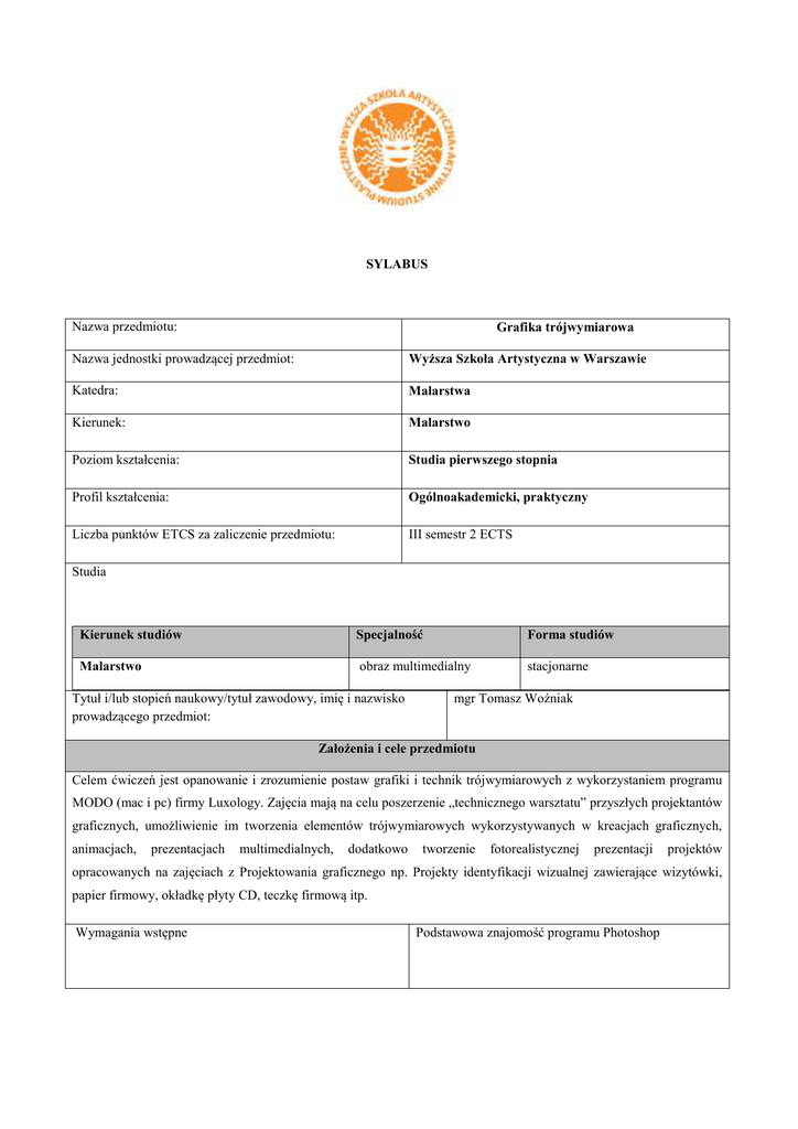 SYLABUS Nazwa przedmiotu: Grafika trójwymiarowa Nazwa jednostki prowadzącej przedmiot: Wyższa Szkoła Artystyczna w Warszawie Katedra: Malarstwa Kierunek: Malarstwo Poziom kształcenia: Studia pierwszego stopnia Profil kształcenia: Ogólnoakademicki, praktyczny Liczba punktów ETCS za zaliczenie przedmiotu: III semestr 2 ECTS Studia Kierunek studiów Specjalność Forma studiów Malarstwo obraz multimedialny stacjonarne Tytuł i/lub stopień naukowy/tytuł zawodowy, imię i nazwisko prowadzącego przedmiot: mgr Tomasz Woźniak Założenia i cele przedmiotu Celem ćwiczeń jest opanowanie i zrozumienie postaw grafiki i technik trójwymiarowych z wykorzystaniem programu MODO (mac i pc) firmy Luxology. Zajęcia mają na celu poszerzenie „technicznego warsztatu” przyszłych projektantów graficznych, umożliwienie im tworzenia elementów trójwymiarowych wykorzystywanych w kreacjach graficznych, animacjach, prezentacjach multimedialnych, dodatkowo tworzenie fotorealistycznej prezentacji projektów opracowanych na zajęciach z Projektowania graficznego np. Projekty identyfikacji wizualnej zawierające wizytówki, papier firmowy, okładkę płyty CD, teczkę firmową itp. Wymagania wstępne Podstawowa znajomość programu Photoshop Zamierzony efekt kształcenia Symbol efektu kształcenia na poziomie kierunku Opis efektu kształcenia na poziomie przedmiotu K_W01 Ma wiedzę na temat doboru narzędzi i materiałów niezbędnych do wykonania animacji obiektów trójwymiarowych. K_W03 Ma wiedzę na temat fachowej terminologii związanej z zagadnieniami dotyczącymi animacji trójwymiarowej. K_W04 Rozumie podstawowe zagadnienia technologiczne i warsztatowe z pokrewnych dyscyplin artystycznych. K_W08 Potrafi odpowiedzialnie wykorzystać nabytą wiedzę z obszaru grafiki trójwymiarowej do dalszego rozwoju własnej osobowości artystycznej. K_W16 Rozumie i świadomie wykorzystuje wzajemne zależności zachodzące pomiędzy teoretycznymi postawami animacji trójwymiarowych z praktycznym wykorzystaniem programu MODO (mac i pc) firmy Luxology. K_U01 Umie świadomie wykorzystać swoje projekty artystyczne oraz zawodowe ze szczególnym podkreśleniem znaczenia zagadnień związanych z grafiką multimedialną. K_U02 Potrafi twórczo i kreatywnie wykorzystać wyobraźnię oraz ekspresję artystyczną przy realizacji projektów zarówno indywidualnych i zespołowych. K_U03 Rozumie wzajemne relacje zachodzące pomiędzy stworzoną grafiką a niesionym przez nią komunikatem. K_U04 Umie przewidzieć efekty zrealizowanej animacji trójwymiarowej w kontekście estetycznym, społecznym i kulturowym. 2 Weryfikacja efektu kształcenia -zaliczenie z oceną - prezentacja plików finalnych „zamkniętych” zawierających gotową animację stworzoną na zajęciach K_U13 Potrafi świadomie wykorzystać poznane techniki malarskie, rysunkowe i rzeźbiarskie w twórczości własnej dotyczącej animacji trójwymiarowej oraz możliwość swobodnego animowania obiektów trójwymiarowych oraz wirtualnego planu filmowego. K_U14 Potrafi modelować w programie Modo oraz Photoshop. K_U15 Potrafi obsługiwać podstawowy sprzęt służący do rejestracji obrazu i dźwięku. K_U18 Ma umiejętność niezależnego rozwoju swojej intuicji i wyobraźni do realizowania projekt ów trójwymiarowych. K_U20 Potrafi świadomie i odpowiedzialnie wykonywać prezentację swojego projektu trójwymiarowego w formie pokazu, prezentacji multimedialnej lub strony internetowej. K_K03 Jest zdolny do rozumienia potrzeby uczenia się przez całe życie i świadomego wykorzystania tej wiedzy. K_K04 Jest zdolny do efektywnego wykorzystania wyobraźni, intuicji, twórczej podstawy i samodzielnego myślenia w celu rozwiązywania problemów projektowych i twórczych. Liczba godzin dydaktycznych i formy zajęć i punkty ECTS: Liczba godzin dydaktycznych (w tym): Przedmioty Forma zajęć: (W - wykład, Ć - ćwiczenia, K konwersatorium) Razem W Ć W+Ć 30 10 20 Grafika trójwymiarowa Rok I Semestr I W Ć K ECTS Rok II Semestr II R W K Ć K ECTS Rok III Semestr III R W Ć 10 20 K Semestr IV ECTS R 2 Zo W Ć K R – rygor (egzamin, - E, zaliczenie z oceną –Zo, zaliczenie - Z 3 ECTS Rok IV Semestr V R W Ć K ECTS Semestr VI R W Ć K ECTS Semestr VII R W Ć K ECTS R Treści programowe nauczania [ treść zajęć] SEMESTR III Wykład 1-3 Sprawy organizacyjne – omówienie zadań do wykonania w obecnym semestrze. Wprowadzenie do tematyki zajęć: - Od szkicu wektorowego do obiektu trójwymiarowego - Prezentacja przykładów krótkich form animacji trójwymiarowych - Rodzaje i zastosowania animacji Wykład 4-7 Omówienie poniższych zagadnień: - Teksturowanie UV (skórki obiektów) - Zaplanowanie ruchu kamery / animacji 10 sekundowej - Animacja i Listwa czasowa - Kluczowanie kamery i zmian jej właściwości w czasie (analogicznie do programu Aftereffects) - Omówienie wygaszania ruchu z pomocą krzywych na linii czasowej - Omówienie kluczowania pozycji i obrotów obiektów w czasie - Omówienie kluczowania poszczególnych własności materiałów - Omówienie ruchu świateł w animacji Wykład 8-10 - Pojęcie sekwencji video (rozdzielczości i formaty zapisu) - Pojęcie kanałów typu: alpha, specular, reflection, surface itd. - Omówienie warstw renderingu: Render Output Ćwiczenie 1-5 - Przygotowanie szkicu wektorowego znaku graficznego lub logotypu (Illustrator) - Eksport szkicu z Illustratora - Import szkicu do programu MODO - Import szkicu oraz jego „oczyszczenie” w programie Modo - Zamrażanie krzywej jako obiekt 3d - Przypomnienie narzędzi do wytłaczania 3d - Narzędzie do pracy z tekstem Ćwiczenie 6-10 - Kontynuacja modelowania znaków graficznych - Przypomnienie przypisywania materiałów do poszczególnych części obiektu - Praca z materiałami i animacją materiałów - Kontynuacja modelowania znaków graficznych 4 - Zaawansowane warstwy materiałów - Tryby mieszania warstw materiałowych - Rodzaje warstw / kanałów tekstur i ich w