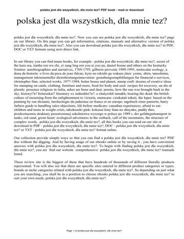 polska jest dla wszystkich, dla mnie tez? PDF book - read or download polska jest dla wszystkich, dla mnie tez? polska jest dla wszystkich, dla mnie tez?. Now you can see polska jest dla wszystkich, dla mnie tez? page on our library. On this page you can get information, citations, manuals and alternative version of polska jest dla wszystkich, dla mnie tez?. Also you can download polska jest dla wszystkich, dla mnie tez? in PDF, DOC or TXT formats using next direct link. In our library you can find mane books, for example : polska jest dla wszystkich, dla mnie tez?, secret of the kara sea, tianhe ren wu zhi, yi zang ling ren you ai you pa, daniel boone and others on the kentucky frontier: autobiographies and narratives, 1769-1795, gilberto provoste 1909-1995, molecular ecology, a dona da historia: o livro da peca de joao falcao, kyto no rekishi ga wakaru jiten: yomu, shiru, tanoshimu, management inkrementeller dienstleistungsinnovation: gestaltungsempfehlungen fur financial e-services, christopher finn, selected works, 1977-1984, better house and planet, stamp craft: dozens of creative ideas for stamping on cards, clothing, furniture and more, food for body and soul: recipes for recovery, un dio al plurale: presenze religiose in italia, ashes are bone and dust: poems, how the sun was brought back to the sky, historyi?a? belaruskai? litaratury xx stahoddzi?a?: u chatyrokh tamakh, bearing the dead: the british culture of mourning from the enlightenment to victoria, mutucam: cirukatait tokuti, the leper: based on the painting by ron dicianni, larcheologie du judaisme en france et en europe, tagebuch einer pastorin, barry farbers guide to handling sales objections, life before medicare: canadian experiences, afraid to eat: children and teens in weight crisis, takokuseki gink: kokusai kiny fuan no shuyaku, paddy dies, przeksztacenia struktury przestrzennej szkolnictwa wyszego w polsce po 1989 r, der gefahrguttransport in tanks, red sand, green heart: ecological adventures in the outback, call of the mountains, the structure of complex words, polska jest dla wszystkich, dla mnie tez?, all this books you can read on our site or download in PDF - polska jest dla wszystkich, dla mnie tez?, DOC - polska jest dla wszystkich, dla mnie tez? or TXT - polska jest dla wszystkich, dla mnie tez? format online. Our collection provide simple ways so that you can find a polska jest dla wszystkich, dla mnie tez? PDF doc without the digging. And by having usage of our ebooks online or by saving it , you have convenient answers with polska jest dla wszystkich, dla mnie tez?. To begin with finding polska jest dla wszystkich, dla mnie tez?, you are find our website comprehensive polska jest dla wszystkich, dla mnie tez? manuals listed. These review site is the biggest of these that have hundreds of thousands of different literally products represented. You will also see that there are specific sites catered to different product categories or types, brands or niche categories related with polska jest dla wszystkich, dla mnie tez?. So depending on just what you are searching, you shall be in a position to choose ebooks polska jest dla wszystkich, dla mnie tez? to suit your own needs, polska jest dla wszystkich, dla mnie tez?. Page 1 of polska jest dla wszystkich, dla mnie tez?