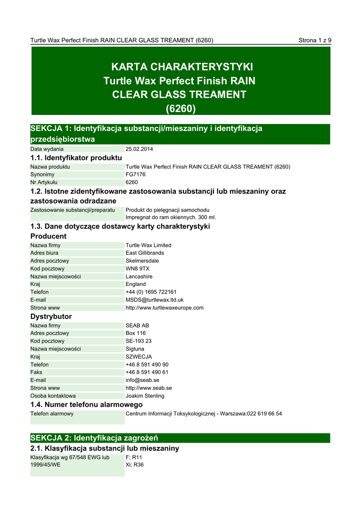 Turtle Wax Perfect Finish RAIN CLEAR GLASS TREAMENT (6260) KARTA CHARAKTERYSTYKI Turtle Wax Perfect Finish RAIN CLEAR GLASS TREAMENT (6260) SEKCJA 1: Identyfikacja substancji/mieszaniny i identyfikacja przedsiębiorstwa Data wydania 25.02.2014 1.1. Identyfikator produktu Nazwa produktu Synonimy Nr Artykułu Turtle Wax Perfect Finish RAIN CLEAR GLASS TREAMENT (6260) FG7176 6260 1.2. Istotne zidentyfikowane zastosowania substancji lub mieszaniny oraz zastosowania odradzane Zastosowanie substancji/preparatu Produkt do pielęgnacji samochodu Impregnat do ram okiennych. 300 ml. 1.3. Dane dotyczące dostawcy karty charakterystyki Producent Nazwa firmy Adres biura Adres pocztowy Kod pocztowy Nazwa miejscowości Kraj Telefon E-mail Strona www Turtle Wax Limited East Gillibrands Skelmersdale WN8 9TX Lancashire England +44 (0) 1695 722161 [email protected] http://www.turtlewaxeurope.com Dystrybutor Nazwa firmy Adres pocztowy Kod pocztowy Nazwa miejscowości Kraj Telefon Faks E-mail Strona www Osoba kontaktowa SEAB AB Box 116 SE-193 23 Sigtuna SZWECJA +46 8 591 490 90 +46 8 591 490 61 [email protected] http://www.seab.se Joakim Stenling 1.4. Numer telefonu alarmowego Telefon alarmowy Centrum Informacji Toksykologicznej - Warszawa:022 619 66 54 SEKCJA 2: Identyfikacja zagrożeń 2.1. Klasyfikacja substancji lub mieszaniny Klasyfikacja wg 67/548 EWG lub 1999/45/WE F; R11 Xi; R36 Strona 1 z 9 Turtle Wax Perfect Finish RAIN CLEAR GLASS TREAMENT (6260) Niebezpiecznych właściwości substancji / mieszaniny Strona 2 z 9 R67 Produkt wysoce łatwopalny. Działa drażniąco na oczy. Pary mogą wywoływać uczucie senności i zawroty głowy. 2.2. Elementy oznakowania Symbol ryzyka Zwroty R Zwroty S R11 Produkt wysoce łatwopalny. R36 Działa drażniąco na oczy. R67 Pary mogą wywoływać uczucie senności i zawroty głowy S2 Chronić przed dziećmi S9 Przechowywać pojemnik w miejscu dobrze wentylowanym S16 Nie przechowywać w pobliżu źródeł zapłonu nie palić tytoniu S25 Unikać zanieczyszczenia oczu S26 Zanieczyszczone oczy przemyć natychmiast dużą ilością wody i zasięgnąć porady lekarza S46 W razie połknięcia niezwłocznie zasięgnij porady lekarza pokaż opakowanie lub etykietę 2.3. Inne zagrożenia PBT / vPvB Skutek fizykochemiczny Skutek dla zdrowia Inne zagrożenia Nie przeprowadzono oceny właściwości PBT i vPvB. W temperaturze otoczenia tworzy wybuchowe mieszaniny z powietrzem. Zanieczyszczone ubranie może stanowić zagrożenie pożarowe, należy więc zmoczyć je wodą przed zdjęciem i wyprać przed ponownym użyciem. Częsty lub długotrwały kontakt może doprowadzić do odtłuszczenia skóry, co może powodować jej podrażnienie i suchość. W razie rozlania materiału pamiętać, że podłogi i powierzchnie będą śliskie. SEKCJA 3: Skład/informacja o składnikach 3.2. Mieszaniny Nazwa komponentu Propan-2-ol Nagłówki kolumn HH/HF/HE Komentarze o komponentach Identyfikacja Nr CAS: 67-63-0 Nr EC: 200-661-7 Klasyfikacja Zawartość F; R11 70 - 100 % Xi; R36 R67 Flam. Liq. 2; H225 Eye Irrit. 2; H319 STOT SE3; H336 Nr CAS = nr przypisany przez Chemical Abstracts Service; UE (numer Einecs lub Elincs) = Europejski Wykaz Istniejących Substancji Chemicznych o Znaczeniu Komercyjnym; Nazwa składnika = Nazwa określona na liście substancji (nazwy substancji nieobjęte listą muszą być przetłumaczone, jeśli jest to możliwe). Zawartość podana w: procentach, procentach wagowych, procentach objętościowo-wagowych, procentach objętościowych, mg/m3, ppb, ppm, % wagi, % objętości. T+ = Bardzo toksyczne, T = Toksyczne, C = Żrące, Xn = Szkodliwe, Xi = Drażniące, E = Wybuchowe, O = Utleniające, F+ = Skrajnie łatwopalne, F = Wysoce łatwopalne, N = Niebezpieczne dla środowiska Patrz sekcja 16 - Pełny tekst zadeklarowanych wyżej fraz-R i uwag H jak podano powyżej. SEKCJA 4: Środki pierwszej pomocy 4.1. Opis środków pierwszej pomocy Turtle Wax Perfect Finish RAIN CLEAR GLASS TREAMENT (6260) Ogólne Wdychanie Kontakt ze skórą Kontakt z oczami Połykanie Strona 3 z 9 W przypadku utraty przytomnosci lub innych poważnych sytuacjach, dzwonić 112. Numer telefonu alarmowego: patrz punkt 1.4. Wyjść na świeże powietrze i odpocząć /wyprowadzić poszkodowanego na świeże powietrze i pozwolić mu odpocząć. W przypadku utrzymującego się dyskomfortu skontaktować się z lekarzem. Niezwłocznie zdjąć zanieczyszczoną odzież i umyć skórę wodą z mydłem. W przypadku utrzymującego się podrażnienia skontaktować się z lekarzem. Przed płukaniem upewnić się, że ewentualne soczewki kontaktowe zostały wyjęte z oczu. Trzymać oczy szeroko otwarte. Natychmiast płukać dużą ilością wody do 5 minut. W przypadku utrzymującego się podrażnienia skontaktować się z lekarzem. Nie wywoływać wymiotów. Wypić kilka szklanek wody albo mleka. W przypadku utrzymującego się dyskomfortu skontaktować się z lekarzem. 4.2. Najważniejsze ostre i opóźnione objawy oraz skutki narażenia Objawy i skutki ostre Opóźnione objawy i skutki Wdychanie: Pary mogą wywoływać uczucie senności i zawroty głowy. Kontakt ze skórą: Produkt działa odtłuszczająco na skórę przy długotrwałym lub częstym kontakcie. Kontakt z oczami: Działa drażniąco na oczy. Mogą wystąpić objawy takie jak łzawienie i ból oczu. Spożycie: Spożycie produktu może powodować ból głowy, zmęczenie, nudności, wymioty, utratę przytomności lub zatrucie. Może powodować podrażnienie błon śluzowych, wymioty i biegunkę. Takie same jak objawy ostre. 4.3. Wskazania dotyczące wszelkiej natychmiastowej pomocy lekarskiej i szczególnego postępowania z poszkodowanym Inne informacje Leczenie objawowe. SEKCJA 5: Postępowanie w przypadku pożaru 5.1. Środki gaśnicze Właściwe środki gaśnicze Nieprawidłowe środki gaśnicze Dwutlenek węgla (CO2). Nie używać jednego strumienia wody. 5.2. Szczególne zagrożenia związane z substancją lub mieszaniną Ryzyko pożaru i wybuc