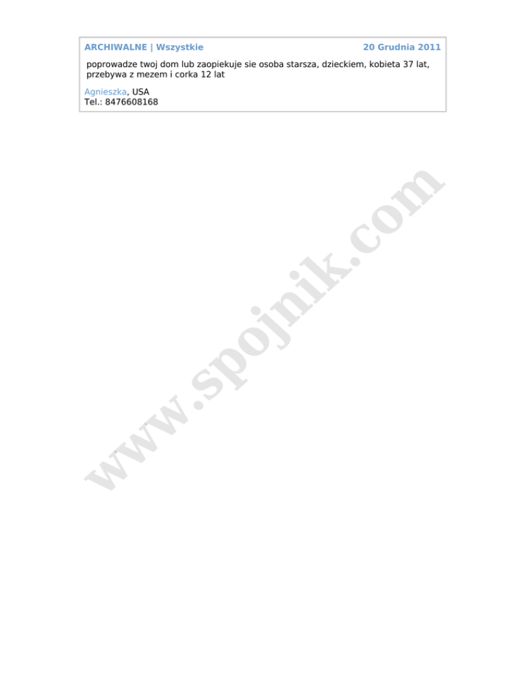 ARCHIWALNE | Wszystkie 20 Grudnia 2011 poprowadze twoj dom lub zaopiekuje sie osoba starsza, dzieckiem, kobieta 37 lat, przebywa z mezem i corka 12 lat w w w .s po jn ik .c o m Agnieszka, USA Tel.: 8476608168