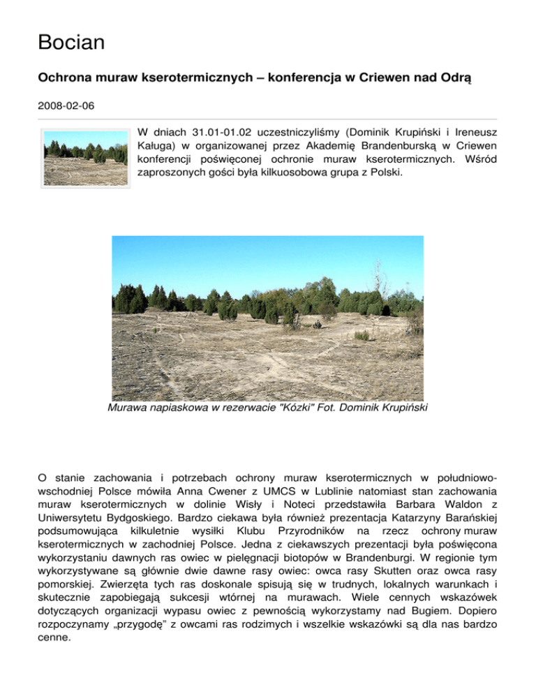Bocian Ochrona muraw kserotermicznych – konferencja w Criewen nad Odrą 2008-02-06 W dniach 31.01-01.02 uczestniczyliśmy (Dominik Krupiński i Ireneusz Kaługa) w organizowanej przez Akademię Brandenburską w Criewen konferencji poświęconej ochronie muraw kserotermicznych. Wśród zaproszonych gości była kilkuosobowa grupa z Polski. Murawa napiaskowa w rezerwacie "Kózki" Fot. Dominik Krupiński O stanie zachowania i potrzebach ochrony muraw kserotermicznych w południowowschodniej Polsce mówiła Anna Cwener z UMCS w Lublinie natomiast stan zachowania muraw kserotermicznych w dolinie Wisły i Noteci przedstawiła Barbara Waldon z Uniwersytetu Bydgoskiego. Bardzo ciekawa była również prezentacja Katarzyny Barańskiej podsumowująca kilkuletnie wysiłki Klubu Przyrodników na rzecz ochrony muraw kserotermicznych w zachodniej Polsce. Jedna z ciekawszych prezentacji była poświęcona wykorzystaniu dawnych ras owiec w pielęgnacji biotopów w Brandenburgi. W regionie tym wykorzystywane są głównie dwie dawne rasy owiec: owca rasy Skutten oraz owca rasy pomorskiej. Zwierzęta tych ras doskonale spisują się w trudnych, lokalnych warunkach i skutecznie zapobiegają sukcesji wtórnej na murawach. Wiele cennych wskazówek dotyczących organizacji wypasu owiec z pewnością wykorzystamy nad Bugiem. Dopiero rozpoczynamy „przygodę” z owcami ras rodzimych i wszelkie wskazówki są dla nas bardzo cenne. Konferencje uważam za bardzo udaną, spotkanie przyczyniło się do wymiany informacji, spostrzeżeń oraz uwag. Co prawda nasi zachodni sąsiedzi mogą się pochwalić lepszymi rezultatami z zakresu czynnej ochrony muraw kserotermicznych, to jednak mogliśmy się przekonać, że i w Niemczech przyrodnicy napotykają na cala masę trudności. Zasadniczym problem w ochronie muraw kserotermicznych jest zazwyczaj ich niewielka powierzchnia, duże rozproszenie stanowisk oraz wysokość nakładów, które trzeba ponieść w celu przywrócenia ekstensywnego wypasu. Tylko ekstensywny wypas (najlepiej owiec i kóz) jest bowiem skutecznym sposobem ochrony muraw kserotermicznych jak i psammofilnych. Koszenie (w niektórych przypadkach łatwiejsze i wygodniejsze) nie przynosi tak dobrych rezultatów. Dodatkowym utrudnieniem jest wciąż niewielka opłacalność (mimo dopłat rolnośrodowiskowych) hodowli owiec. Miejmy nadzieję, że w najbliższych latach nam jak również naszym zachodnim sąsiadom uda się jednak wypracować taki model działania, który pozwoli zachować te jedne z najbardziej cennych i zagrożonych siedlisk przyrodniczych w Europie. Dominik Krupiński