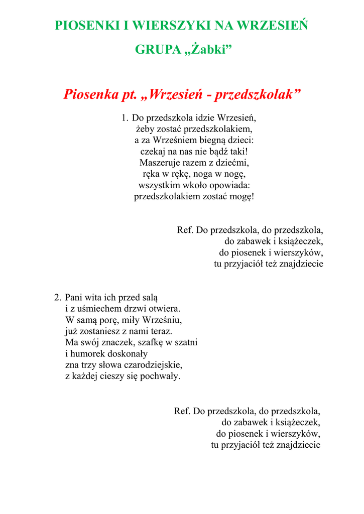 PIOSENKI I WIERSZYKI NA WRZESIEŃ GRUPA „Żabki” Piosenka pt. „Wrzesień - przedszkolak” 1. Do przedszkola idzie Wrzesień, żeby zostać przedszkolakiem, a za Wrześniem biegną dzieci: czekaj na nas nie bądź taki! Maszeruje razem z dziećmi, ręka w rękę, noga w nogę, wszystkim wkoło opowiada: przedszkolakiem zostać mogę! Ref. Do przedszkola, do przedszkola, do zabawek i książeczek, do piosenek i wierszyków, tu przyjaciół też znajdziecie 2. Pani wita ich przed salą i z uśmiechem drzwi otwiera. W samą porę, miły Wrześniu, już zostaniesz z nami teraz. Ma swój znaczek, szafkę w szatni i humorek doskonały zna trzy słowa czarodziejskie, z każdej cieszy się pochwały. Ref. Do przedszkola, do przedszkola, do zabawek i książeczek, do piosenek i wierszyków, tu przyjaciół też znajdziecie Piosenka pt. „Grzeczne słówka” Dziękuję, przepraszam i proszę. Trzy słówka za trzy małe grosze. I grzeczny królewicz I grzeczna królewna Znają te słówka, na pewno. Ref. Trzy słówka za małe trzy grosze. Dziękuję, przepraszam i proszę. To przecież niewiele kosztuje, Gdy powiesz uprzejmie dziękuję. Korona ci z głowy Nie spadnie na pewno. Nawet, gdy jesteś królewną. Ref. Trzy słówka za małe trzy grosze. Dziękuję, przepraszam i proszę. Wiersz " Obowiązki dyżurnych " Dyżurny ma obowiązków wiele, podczas obiadu i podczas śniadania. Rozdaje sztućce, odkłada talerze, To są naprawdę niełatwe zadania. Sprawdza czy klocki są w pojemnikach, Rozdaje karty, kredki rozkłada, W sali porządek zawsze być musi, Taka dyżurnych ważna zasada! Piosenka „Pamiątki z wakacji” Skąd te śmiechy, skąd te piski? To plecaki i walizki zgromadziły się na stacji, bo już wracać czas z wakacji. Ref: Muszelki, bursztyny, z kory łódeczka kamyki i szyszki, śmieszne kubeczki. Latawce bez sznurka, wędki składane, koszulki ze zdjęciem, piłki dmuchane. Wszyscy dobrze wiedzą o tym, że najmilsze są powroty. A radości więcej mamy, gdy jedziemy z pamiątkami. Ref: Muszelki, bursztyny... Położymy je w szufladach, będą chętnie opowiadać o słoneczku, plaży, lesie, kiedy przyjdzie słotna jesień. Ref: Muszelki, bursztyny… Wiersz „Ośmiornica” Jedna ośmiornica była, bo się w wodzie zagubiła. Daleko została mama, a ona pływała sama. Plusk, plusk, rybki pluskały, ale bawić się z nią nie chciały. Tylko jedna rybka mała z ośmiornicą bawić się chciała. Plum, plum, razem się kręciły, hop, hop, wesoło tańczyły. Wiersz " Gdy zamierzasz przejść ulicę" Na chodniku przystań bokiem. Popatrz w lewo bystrym wzrokiem. Skieruj w prawo wzrok sokoli Znów na lewo spójrz powoli. Jezdnia wolna – więc swobodnie mogą przez nią przejść przechodnie. (…) Piosenka „Piosenka sygnalizatora” I. Maszerują buty po chodniku prawą stroną, grzecznie, w równym szyku i pytają sygnalizatora, czy przez jezdnię już przechodzić pora. Ref: Jestem z tego dobrze znany, że wciąż migam światełkami. Kiedy światło mam zielone, możesz przejść na drugą stronę. I spokojnie idź po pasach , bo na pasach się nie hasa. A gdy błysnę na czerwono, stój, nie przechodź , zabroniono! II. Pan sygnalizator mruga okiem: czy są jezdnie wąskie, czy szerokie, stoję dla was co dzień jak na warcie, więc zasady moje pamiętajcie. Ref: Jestem z tego dobrze znany…