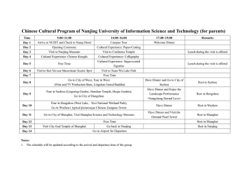 Chinese Cultural Program of Nanjing University of Information Science and Technology (for parents) Time 9:00~11:00 14:00~16:00 17:00~19:00 Day 1 Arrive at NUIST and Check in Nanqi Hotel Campus Tour Welcome Dinner Day 2 Opening Ceremony Cultural Experience: Paper-Cutting Day 3 Visit to Nanjing Museum Visit to Confucius Temple Day 4 Cultural Experience: Chinese Kungfu Cultural Experience: Calligraphy Day 5 Free Time Cultural Experience: Sugar-coated Figurine Day 6 Visit to Sun Yat-sen Mausoleum Scenic Spot Visit to Xuan Wu Lake Park Remarks Lunch during the visit is offered Lunch during the visit is offered Free Time Day 7 Day 8 Go to City of Wuxi, Tour in Wuxi (Film and TV Production Base, Lingshan Grand Buddha) Have Dinner and Go to City of Suzhou Rest in Suzhou Day 9 Tour in Suzhou (Lingering Garden, Hanshan Temple, Huqiu Garden), Go to City of Hangzhou Have Dinner and Enjoy the Landscape Performance <Songcheng Eternal Love> Rest in Hangzhou Day 10 Tour in Hangzhou (West Lake, Xixi National Wetland Park), Go to Wuzhen ( typical picturesque Chinese Jiangnan Town) Have Dinner Rest in Wuzhen Day 11 Go to City of Shanghai, Visit Shanghai Science and Technology Museum Have Dinner and Visit the Oriental Pearl Tower Rest in Shanghai Free Time Day 12 Day 13 Day 14 Visit City God Temple of Shanghai Go back to Nanjing Go to Airport for Departure Notes: 1. The schedule will be updated according to the arrival and departure time of the group. Rest in Shanghai Rest in Nanjing 2. 3. a. b. c. d. e. f. The city tour may be adjusted to the plan of travel agency according to weather conditions and other considerations for better arrangements. The price for each member of a group of 10 to 15 is 4,200 RMB per person, including: Pick up service in Nanjing and send parents to Airport for departure at last. Hostel fee (Nanqi Hotel on campus and hotel fees during visit in other cities, double room). Tuition for cultural classes. Insurance fee. Nanjing city tour (2 days’ bus service, tickets and lunch). Touring in Wuxi, Suzhou, Hangzhou, Wuzhen and Shanghai. Language course (for students) For two weeks’ language course for beginners (a group of 10-15 students), the price is 3000 RMB per person. The fees include: 1. Pick up service in Nanjing and send students to Nanjing Airport for departure at last day 2. Hostel fee (School Hotel on campus, double room) 3. Tuition (every day 4 hours learning of Chinese: 2 hours in the morning and 2 hours in the afternoon from Monday to Friday) 4. Insurance 5. Nanjing city tour (2 days’ city tour in Nanjing at weekends, including bus service, tickets and lunch). Some of the language courses can also change to culture class, such as paper cutting, calligraphy or martial arts. The price is the same.