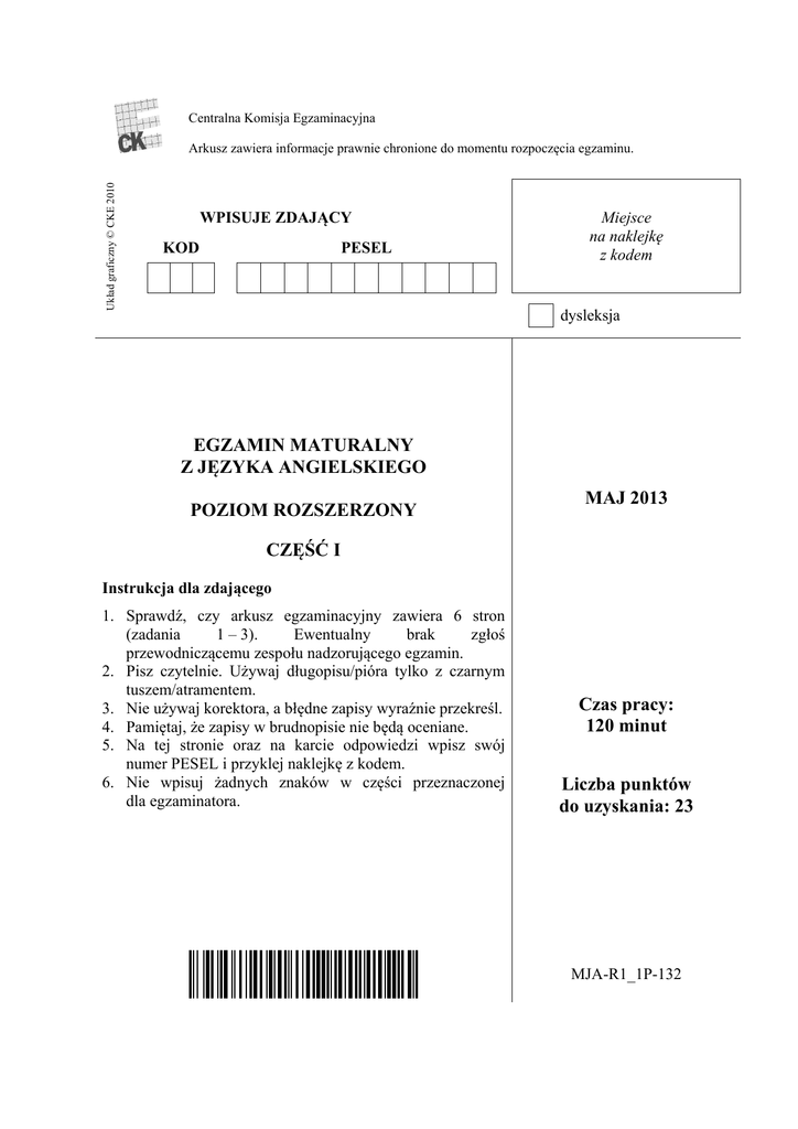 Centralna Komisja Egzaminacyjna Układ graficzny © CKE 2010 Arkusz zawiera informacje prawnie chronione do momentu rozpoczęcia egzaminu. WPISUJE ZDAJĄCY KOD PESEL Miejsce na naklejkę z kodem dysleksja EGZAMIN MATURALNY Z JĘZYKA ANGIELSKIEGO POZIOM ROZSZERZONY MAJ 2013 CZĘŚĆ I Instrukcja dla zdającego 1. Sprawdź, czy arkusz egzaminacyjny zawiera 6 stron (zadania 1 – 3). Ewentualny brak zgłoś przewodniczącemu zespołu nadzorującego egzamin. 2. Pisz czytelnie. Używaj długopisu/pióra tylko z czarnym tuszem/atramentem. 3. Nie używaj korektora, a błędne zapisy wyraźnie przekreśl. 4. Pamiętaj, że zapisy w brudnopisie nie będą oceniane. 5. Na tej stronie oraz na karcie odpowiedzi wpisz swój numer PESEL i przyklej naklejkę z kodem. 6. Nie wpisuj żadnych znaków w części przeznaczonej dla egzaminatora. Czas pracy: 120 minut Liczba punktów do uzyskania: 23 MJA-R1_1P-132 2 Egzamin maturalny z języka angielskiego Poziom rozszerzony – część I STOSOWANIE STRUKTUR LEKSYKALNO-GRAMATYCZNYCH Zadanie 1. (2,5 pkt) Uzupełnij każdą lukę (1.1.–1.5.) jednym wyrazem, przekształcając wyraz podany w nawiasie, tak aby otrzymać logiczny i gramatycznie poprawny tekst. Wymagana jest pełna poprawność ortograficzna wpisywanych wyrazów. Za każde poprawne rozwiązanie otrzymasz 0,5 punktu. AIRBAGS FOR MOBILES Jeff Bezos has applied for a patent for airbags for mobile phones. We are all familiar with airbag technology in cars. We could soon see them as 1.1. (OPTION) __________________ add-ons when we buy a new mobile or smartphone. Mr Bezos says the tiny airbags inside the phones would offer maximum protection for a cell phone if someone dropped it. The airbags would deploy 1.2. (AUTOMATIC) __________________ after the phone’s built-in accelerometer detected that it was falling. The patent submitted by Mr Bezos contains other 1.3. (SAFE) __________________ features. He suggests using a laser or radar to work out the distance between the phone and the ground to determine when to deploy the airbags. Other 1.4. (SUGGEST) __________________ include springs that would be released from the phone so that the phone would bounce when it hit the ground, and a gyroscope that controls tiny jets of compressed air that would change the angle of the device in mid-air. This would 1.5. (ABLE) __________________ the phone to change its ‘flight path’ to ensure a smoother landing on impact. adapted from www.breakingnewsenglish.com Zadanie 2. (2,5 pkt) Wykorzystując wyrazy podane drukowanymi literami, uzupełnij każde zdanie z luką, tak aby zachować sens zdania wyjściowego (2.1.–2.5.). Wymagana jest pełna poprawność ortograficzna i gramatyczna wpisywanych fragmentów zdań. Uwaga: nie zmieniaj formy podanych wyrazów. Za każde poprawne rozwiązanie otrzymasz 0,5 punktu. 2.1. The students couldn’t concentrate fully because of the noise coming from the street. HARD The noise from the street ______________________________________________ the students to concentrate fully. 2.2. It was a serious mistake to allow Mike to go to the party on his own. SHOULD We _______________________________________ Mike to go to the party on his own. 2.3. Could you carry that large bag for me? MIND Would _______________________________________________ that large bag for me? 2.4. People say that New York is a city that never sleeps. SAID New York ___________________________________________ a city that never sleeps. 2.5. “Why aren’t you listening when I’m talking to you?” said the teacher. ATTENTION The teacher accused me of ________________________________________ to her when she was talking to me. Egzamin maturalny z języka angielskiego Poziom rozszerzony – część I 3 WYPOWIEDŹ PISEMNA Zadanie 3. (18 pkt) Wypowiedz się na jeden z trzech poniższych tematów. Wypowiedź powinna zawierać od 200 do 250 słów i spełniać wszystkie wymogi typowe dla formy wskazanej w poleceniu. Zaznacz wybrany temat, zakreślając jego numer. 1. Coraz więcej osób, zamiast gotować obiady w domu, korzysta z gotowych dań kupionych w supermarketach. Napisz rozprawkę, w której przedstawisz wady i zalety takiego rozwiązania. 2. Napisz opowiadanie o dwóch nastolatkach, którzy podczas zwiedzania starego zamku dokonują niezwykłego odkrycia, dzięki czemu stają się sławni. 3. Opisz znaną Ci imprezę, która łączy ideę współzawodnictwa z popularyzacją integracji z osobami niepełnosprawnymi. Uwaga: jeśli praca będzie zawierać więcej niż 300 słów, otrzymasz za jej kompozycję 0 punktów. CZYSTOPIS ..................................................................................................................................... ..................................................................................................................................... ..................................................................................................................................... ..................................................................................................................................... ..................................................................................................................................... ..................................................................................................................................... ..................................................................................................................................... ..................................................................................................................................... ..................................................................................................................................... ..................................................................................................................................... ..........................................................................