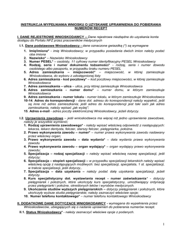 INSTRUKCJA WYPEŁNIANIA WNIOSKU O UZYSKANIE UPRAWNIENIA DO POBIERANIA NUMERÓW RECEPT I. DANE REJESTROWE WNIOSKODAWCY – Dane rejestrowe niezbędne do uzyskania konta dostępu do Portalu NFZ przez pracowników medycznych I.1. Dane podstawowe Wnioskodawcy - dane oznaczone gwiazdką (*) są wymagane 1. Imię/imiona* - imię Wnioskodawcy; w przypadku posiadania dwóch imion należy podać oba imiona 2. Nazwisko* – Nazwisko Wnioskodawcy 3. Numer PESEL* – osobisty, 11 cyfrowy numer identyfikacyjny PESEL Wnioskodawcy 4. Rodzaj, seria i numer dokumentu tożsamości* - rodzaj, seria i numer dowodu osobistego albo paszportu, w przypadku braku numeru PESEL 5. Adres zamieszkania – miejscowość* – miejscowość, w której zamieszkuje Wnioskodawca, do wyboru z udostępnionej listy 6. Adres zamieszkania - kod pocztowy* – kod pocztowy miejscowości, w której zamieszkuje Wnioskodawca 7. Adres zamieszkania – ulica – ulica, przy której zamieszkuje Wnioskodawca 8. Adres zamieszkania - numer domu* – numer domu, w którym zamieszkuje Wnioskodawca 9. Adres zamieszkania - numer lokalu - numer lokalu, w którym zamieszkuje Wnioskodawca 10-14. Adres do korespondencji - dane dot. adresu do korespondencji należy wypełnić, jeśli są inne niż adres zamieszkania; jeśli adres do korespondencji jest taki sam jak adres zamieszkania, należy wpisać „jak wyżej”; 15. Adres e-mail - adres poczty elektronicznej Wnioskodawcy, jeżeli dotyczy. I.2. Uprawnienia zawodowe – jeśli wnioskodawca ma więcej niż jedno uprawnienie zawodowe, należy je wszystkie wymienić; 1. Rodzaj uprawnienia zawodowego* - należy wpisać właściwą odpowiedź z następujących: lekarza, lekarz dentysta, felczer, starszy felczer, pielęgniarka, położna. 2. Prawo wykonywania zawodu – numer* – numer prawa wykonywania zawodu nadawany przez właściwy organ; 3. Prawo wykonywania zawodu – data wydania* – data wydania prawa wykonywania zawodu 4. Prawo wykonywania zawodu – organ wydający* – organ wydający prawo wykonywania zawodu; 5. Specjalizacja – rodzaj specjalizacji – należy wpisać właściwą nazwę specjalizacji, jeśli dotyczy; 6. Specjalizacja – stopień specjalizacji – w przypadku specjalizacji lekarskich należy wpisać właściwą opcję z następujących możliwych: bez specjalizacji, specjalista, 1 st. specjalizacji, w trakcie specjalizacji, jeśli dotyczy,. 7. Specjalizacja – data uzyskania – należy podać datę uzyskania specjalizacji, jeżeli dotyczy. 8. Kurs specjalistyczny dot. wystawiania recept - numer zaświadczenia* - dotyczy pielęgniarek i położnych, które ukończyły kurs specjalistyczny, umożliwiający ordynację przez pielęgniarki i położne, określonych leków i wyrobów medycznych. 9. Ukończenie studiów wyższych pielęgniarskich – dotyczy pielęgniarek i położnych, które ukończyły wyższe studia pielęgniarskie; należy zaznaczyć właściwe opcje; 10. Numer telefonu kontaktowego* – numer telefonu kontaktowego Wnioskodawcy II. DODATKOWE DANE DOTYCZĄCE WNIOSKODAWCY - wymagana do wypełnienia przez Wnioskodawców, ubiegających się o nadanie uprawnień do pobierania numerów recept. II.1. Status Wnioskodawcy* - należy zaznaczyć właściwe opcje z podanych. 1 II.2. Dane dotyczące wykonywanej działalności leczniczej – dotyczy Wnioskodawców wykonujących działalność leczniczą oraz Wnioskodawców wykonujących zawód lekarza/felczera/pielęgniarki/położnej na podstawie umowy o pracę lub umowy cywilnoprawnej w podmiocie leczniczym, który nie zawarł z Funduszem umowy o udzielanie świadczeń opieki zdrowotnej, czyli przy wyborze opcji nr 3 i 4 w pkt II.1 ; należy podać informacje dotyczące wszystkich prowadzonych form działalności leczniczej, które Wnioskodawca osobiście wykonuje, II. 2.1-2.2 Forma działalności leczniczej - kod i nazwa – należy podać właściwy kod i nazwę właściwej formy działalności leczniczej, o których mowa w art. 5 ustawy z dn.15 kwietnia 2011 r. o działalności leczniczej (Dz.U.2015.618) – należy wybrać właściwą pozycję ze słownika form działalności leczniczej1(kol 3 i 4), załączonego do niniejszej Instrukcji. II.3. Dane rejestrowe dotyczące wykonywanej działalności leczniczej 1. Nazwa firmy – nazwa podmiotu wykonującego działalność leczniczą albo imię i nazwisko podmiotu leczniczego, zgodnie z wpisem w publicznym rejestrze przedsiębiorców (KRS lub CEIDG) i wpisem w rejestrze podmiotów wykonujących działalność leczniczą (RPWDL); 2. Organ rejestrujący działalność leczniczą – należy wpisać nazwę organu rejestrującego działalność leczniczą, w przypadku praktyk zawodowych należy wpisać nazwę okręgowej izby lekarskiej, właściwej dla miejsca wykonywania praktyki zawodowej lekarza/lekarza dentysty lub nazwę okręgowej izby pielęgniarek i położnych właściwej dla miejsca wykonywania praktyki zawodowej pielęgniarki/położnej; 3. Nr wpisu do rejestru działalności leczniczej – numer księgi rejestrowej w rejestrze podmiotów wykonujących działalność leczniczą. II.4. Dane rejestrowe dotyczące prowadzonej działalności gospodarczej - Ta sekcja danych dotyczy Wnioskodawców, którzy prowadzą działalność gospodarczą związaną z wykonywaniem działalności leczniczej, czyli przy wyborze opcji 4 w pkt II.1; 1. Forma organizacyjno-prawna działalności gospodarczej - należy podać właściwy kod i nazwę formy organizacyjno-prawnej działalności gospodarczej wybraną ze słownika form organizacyjno-prawnych działalności gospodarczej2 (kol 5 i 6); 2. Organ rejestrujący działalność gospodarczą – nazwa organu rejestrującego działalność gospodarczą - rodzaj publicznego rejestru przedsiębiorców - Krajowy Rejestr Sądowy (KRS) lub Centralna Ewidencja i Informacja o Działalności Gospodarczej (CEIDG); 3. Nr wpisu do rejestru działalności gospodarczej – wymagany w przypadku wpisu w KRS, nie wymagany w przypadku wpisu w