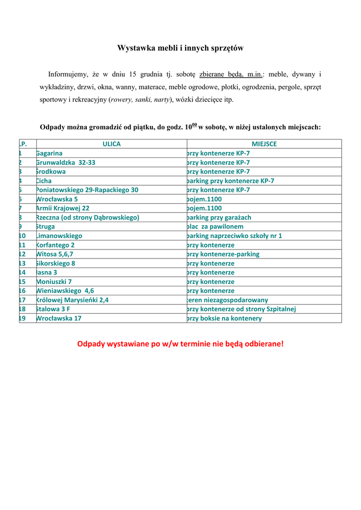 Wystawka mebli i innych sprzętów Informujemy, że w dniu 15 grudnia tj. sobotę zbierane będą, m.in.: meble, dywany i wykładziny, drzwi, okna, wanny, materace, meble ogrodowe, płotki, ogrodzenia, pergole, sprzęt sportowy i rekreacyjny (rowery, sanki, narty), wózki dziecięce itp. Odpady można gromadzić od piątku, do godz. 1000 w sobotę, w niżej ustalonych miejscach: LP. 1 2 3 4 5 6 7 8 9 10 11 12 13 14 15 16 17 18 19 ULICA Gagarina Grunwaldzka 32-33 Środkowa Cicha Poniatowskiego 29-Rapackiego 30 Wrocławska 5 Armii Krajowej 22 Rzeczna (od strony Dąbrowskiego) Struga Limanowskiego Korfantego 2 Witosa 5,6,7 Sikorskiego 8 Jasna 3 Moniuszki 7 Wieniawskiego 4,6 Królowej Marysieńki 2,4 Stalowa 3 F Wrocławska 17 MIEJSCE przy kontenerze KP-7 przy kontenerze KP-7 przy kontenerze KP-7 parking przy kontenerze KP-7 przy kontenerze KP-7 pojem.1100 pojem.1100 parking przy garażach plac za pawilonem parking naprzeciwko szkoły nr 1 przy kontenerze przy kontenerze-parking przy kontenerze przy kontenerze przy kontenerze przy kontenerze teren niezagospodarowany przy kontenerze od strony Szpitalnej przy boksie na kontenery Odpady wystawiane po w/w terminie nie będą odbierane!