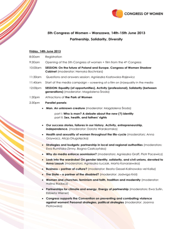5th Congress of Women – Warszawa, 14th-15th June 2013 Partnership, Solidarity, Diversity Friday, 14th June 2013 8:00am Registration 9:30am Opening of the 5th Congress of women + film from the 4th Congress 10:00am SESSION: On the future of Poland and Europe. Congress of Women Shadow Cabinet (moderator: Henryka Bochniarz) 11:30am Questions and answers session: Agnieszka Kozłowska-Rajewicz 11:45am Start of the media campaign – screening of a film on (in)equality in the media 12:00pm SESSION: Equality (of opportunities), Activity (professional), Solidarity (between generations) (moderator: Magdalena Środa) 1:30pm Attractions of the Park of Women 2:30pm Parallel panels: Man. An unknown creature (moderator: Magdalena Środa) part I: Who is man? A debate about the new (?) identity part II: Sex, health, and fathers’ rights Our success stories, failures in our history. Activity, entrepreneurship, independence. (moderator: Dorota Warakomska) Health and sexuality of women throughout the life-cycle (moderators: Anna Grzywacz, Alicja Długołęcka) Strategies and budgets: partnership in local and regional authorities (moderators: Ewa Rumińska-Zimny, Bogna Czałczyńska) Why do media enforce sexmission? (moderators: Agnieszka Graff, Piotr Pacewicz) Look into the wardrobe! On gender identity, solidarity, and civil unions, devoted to Anna Laszuk (moderators: Agnieszka Łuczak, Marta Konarzewska) Business – partner of culture? (moderator: Beata Gessel-Kalinowska vel Kalisz) The State – a partner of the disabled? (moderator: Jadwiga Król) Women and churches, feminism and faith, tradition and modernity (moderator: Halina Radacz) Partnerships for climate and energy. Energy of partnership (moderators: Ewa Sufin, Elżbieta Wiener) Congress supports the Convention on preventing and combating violence against women! Personal strategies, political strategies (moderator: Joanna Piotrowska) Leader and mentor: light management in heavy industry (moderator: Bogusława Matuszewska) Education vs. labour markets (moderator: Krystyna Boczkowska) Women in uniformed services: successes, prospects, partnerships (moderators: Danuta Waniek, Kamila Zimoń) About the girls (moderator: Magdalena Milewska) Eastern feminism, Western feminism (moderator: Karolina Wigura) What will our old age be? Old age like youth? Partnership of generations, challenges facing the ageing society (moderator: Joanna Szymańska-Bulska) Return to the labour market: instruments for activation, policies in support of the family (moderator: Anna Karaszewska) A mature employees – a mature employer (moderator: Elżbieta ĆwiklińskaKożuchowska), Diversity in the labour market (moderator: Anna Gwoińska) The path to the Managing Board (moderator: Henryka Bochniarz) Home, work, life – partnership (Work-Life Balance) (moderators: Agnieszka Grzybek, Monika Zakrzewska, Aleksandra Sołtysiak-Łuczak) Entrepreneurship of women (moderator: Konfederacja Lewiatan) Time for women! In sport (moderator: Joanna Mucha) Our little sisters, or about rights for all sentient creatures (moderator: Magdalena Środa) Round tables: 12:00pm Round table of the Ministry of Foreign Affairs (moderator: Beata Stelmach) 3:00pm The round table of Ministers for Equal Rights (moderators: Agnieszka KozłowskaRajewicz, Władysław Kosiniak-Kamysz) 8:00pm Concert for Partnership: Andrzej Sikorowski with his daughter Maja Saturday, 15th June 2013 8:30am Film screening: Dzień kobiet / Women’s Day 10:00am SESSION: Dear but alien. On difficult relationships with the loved ones (moderator: Ewa Woydyłło-Osiatyńska) 11:30am Musical surprise: Marysia Sadowska 12:00pm SESSION: Alien but dear. A diversity that empowers! (moderators: Kazimiera Szczuka, Joanna Kos-Krauze) 1:30pm Attractions of the Park of Women 3:30pm SESSION: The Congress runs in elections 4:30pm Awards. Addresses by special guests: Prime Minister Donald Tusk (tbc) 5:30pm Closing of the Congress WOMEN’S PARK AT THE BACKSTAGE: Workshops: the art of presenting yourself, self-defence, health, work, etc. Presentations, exhibitions and assistance: health, work, fashion, activity, and many other attractions!