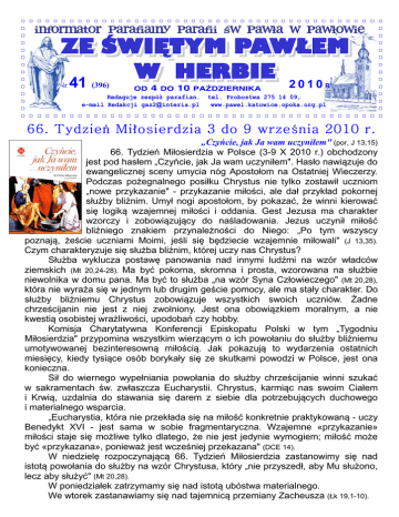 Nr 41 (396) 2010 R. OD 4 DO 10 PAŹDZIERNIKA Redaguje zespół parafian. tel. Probostwa 275 14 09, e-mail Redakcji [email protected] www.pawel.katowice.opoka.org.pl 66. Tydzień Miłosierdzia 3 do 9 września 2010 r. „Czyńcie, jak Ja wam uczyniłem" (por, J 13,15) 66. Tydzień Miłosierdzia w Polsce (3-9 X 2010 r.) obchodzony jest pod hasłem „Czyńcie, jak Ja wam uczyniłem". Hasło nawiązuje do ewangelicznej sceny umycia nóg Apostołom na Ostatniej Wieczerzy. Podczas pożegnalnego posiłku Chrystus nie tylko zostawił uczniom „nowe przykazanie" - przykazanie miłości, ale dał przykład pokornej służby bliźnim. Umył nogi apostołom, by pokazać, że winni kierować się logiką wzajemnej miłości i oddania. Gest Jezusa ma charakter wzorczy i zobowiązujący do naśladowania. Jezus uczynił miłość bliźniego znakiem przynależności do Niego: „Po tym wszyscy poznają, żeście uczniami Moimi, jeśli się będziecie wzajemnie miłowali" (J 13,35). Czym charakteryzuje się służba bliźnim, której uczy nas Chrystus? Służba wyklucza postawę panowania nad innymi ludźmi na wzór władców ziemskich (Mt 20,24-28). Ma być pokorna, skromna i prosta, wzorowana na służbie niewolnika w domu pana. Ma być to służba „na wzór Syna Człowieczego" (Mt 20,28), która nie wyraża się w jednym lub drugim geście pomocy, ale ma stały charakter. Do służby bliźniemu Chrystus zobowiązuje wszystkich swoich uczniów. Żadne chrześcijanin nie jest z niej zwolniony. Jest ona obowiązkiem moralnym, a nie kwestią osobistej wrażliwości, upodobań czy hobby. Komisja Charytatywna Konferencji Episkopatu Polski w tym „Tygodniu Miłosierdzia" przypomina wszystkim wierzącym o ich powołaniu do służby bliźniemu umotywowanej bezinteresowną miłością. Jak pokazują to wydarzenia ostatnich miesięcy, kiedy tysiące osób borykały się ze skutkami powodzi w Polsce, jest ona konieczna. Sił do wiernego wypełniania powołania do służby chrześcijanie winni szukać w sakramentach św. zwłaszcza Eucharystii. Chrystus, karmiąc nas swoim Ciałem i Krwią, uzdalnia do stawania się darem z siebie dla potrzebujących duchowego i materialnego wsparcia. „Eucharystia, która nie przekłada się na miłość konkretnie praktykowaną - uczy Benedykt XVI - jest sama w sobie fragmentaryczna. Wzajemne «przykazanie» miłości staje się możliwe tylko dlatego, że nie jest jedynie wymogiem; miłość może być «przykazana», ponieważ jest wcześniej przekazana" (DCE 14). W niedzielę rozpoczynającą 66. Tydzień Miłosierdzia zastanowimy się nad istotą powołania do służby na wzór Chrystusa, który „nie przyszedł, aby Mu służono, lecz aby służyć" (Mt 20,28). W poniedziałek zatrzymamy się nad istotą ubóstwa materialnego. We wtorek zastanawiamy się nad tajemnicą przemiany Zacheusza (Łk 19,1-10). Środa to dzień refleksji nad problemem głodu w świecie oraz niedożywieniem dzieci w naszej Ojczyźnie, w połączeniu z faktem marnowania wielkich zasobów żywności. W czwartek, we wspomnienie Matki Bożej Różańcowej, rozważmy scenę Nawiedzenia i posługi Maryi w domu Elżbiety (Łk 1,39-45). W piątek poddajmy refleksji scenę uzdrowienia ślepca Bartymeusza (Łk 18,35-43) i zastanówmy się, co możemy zrobić dla osób chorych i niepełnosprawnych. W sobotę, która jest najczęstszym dniem zawierania sakramentalnych małżeństw, rozważymy opis wesela w Kanie Galilejskiej (J 2,l-11). Pomyślimy, w jaki sposób Chrystus wspiera młodych małżonków oraz w jaki sposób my możemy pomagać ubogim małżonkom i niewydolnym rodzinom w naszej wspólnocie parafialnej. Niech Bóg miłosierny przez łaskę 66. Tygodnia Miłosierdzia pobłogosławi i pomnoży wszelkie dobro, które sam zasiał w naszych sercach, czyniąc nas świadkami pokornej miłości. bp Grzegorz Balcerek Przewodniczący Komisji Charytatywnej KEP Szanowni Parafianie To Jezus swoim postępowaniem, całą działalnością uczył, że w świecie w którym żyjemy powinna zaistnieć MIŁOŚĆ. Miłość miłosierna w sposób szczególny zobowiązuje w zetknięciu z cierpieniem, krzywdą, ubóstwem. TYDZIEŃ MIŁOSIERDZIA jest okazją do wyrażenia bezinteresownej miłości, wrażliwości na ubóstwo w naszej parafii przez wsparcie akcji „Dar Ołtarza Czyńcie, Jak Ja wam uczyniłem” (J.13,15) Od 3 do 9 października za ławkami, po prawej stronie w kościele, wystawione są: koszyk na rzeczy, szczególnie żywność i skarbonka na dary pieniężne przeznaczone na zakup węgla, opłatę lekarstw i żywności. Za ofiarność - serdeczne „Bóg zapłać” Informacja 55 - ta o remoncie wieży naszego kościoła Tak jak deklarowaliśmy w poprzednim miesiącu, przedstawiamy Parafianom bieżącą informację o remoncie wieży naszego kościoła. Od ponad miesiąca widzimy już kompletne rusztowanie i siatkę osłaniającą wieżę kościoła. Robotnicy doszli do szczytu wieży, ale nie zdemontowali krzyża jak wcześniej zapowiadaliśmy. Na pytanie o krzyż mówią, czy ktoś widział kościół bez krzyża? Krzyż zostanie odnowiony w ostatniej fazie krycia kopuły blachą. Za zieloną siatką widać krzątających się pracowników. Prace, więc trwają, pogoda nie rozpieszcza. Ksiądz Proboszcz i Parafianie podpytują pracowników firmy wykonującej remont, czy zdążą przed wcześnie w tym roku zapowiadanym śniegiem? Wykonano już dość duży zakres prac demontażowych i naprawczych. Została zdjęta stara blacha z dużej i małej „bani”, dokonano wymiany zbutwiałych fragmentów konstrukcji wieży, wymieniono całe odeskowanie więźby kopuły deskami zaimpregnowanymi preparatami grzybobójczymi i przeciw pożarowymi. Całość pokryto membraną izolacyjną. W najgorszym stanie jest tzw. latarnia u szczytu wieży, którą widać z daleka, z jej podświetleniem. Jej otwarta konstrukcja stale narażana jest na opady deszczu. Według zapewnień „górali” pracujących na naszej wież