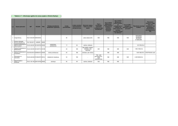 Tabela nr 1 - Informacje ogólne do oceny ryzyka w Gminie Kętrzyn L.p. 1 2 3 Nazwa jednostki Urząd Gminy NIP REGON 742-10-02-603 000535534 PKD Rodzaj prowadzonej działalności (opisowo) - Gminny Ośrodek 742-158-56-74 4456955 8899Z Pomocy Społecznej Szkoła Podstawowa w 742-20-48-961 001205709 8520Z Nakomiadach 4 Szkoła Podstawowa w 742-20-48-955 001205715 8010B Biedaszkach 5 Szkoła Podstawowa w 742-204-89-32 000665410 8520Z Kruszewcu Liczba pracowników Liczba uczniów/ wychowanków/ pensjonariuszy 30 szkolnictwo podstawowe szkoła podstawowa 17 Elementy mające wpływ na ocenę ryzyka Czy w konstrukcji budynków występuje płyta warstwowa? place zabaw (25) NIE 94 szatnia, stołówka 34 169 plac zabaw, szatnia, stołówka, sala sportowa 25 189 stołówka, plac zabaw czy w mieniu zgłoszonym Planowane czy w mienie przez Państwa imprezy w ciągu zgłoszonym do Czy od 1997 r. roku (nie przez Państwa ubezpieczenia wystąpiło w Wysokość rocznego biletowane i nie znajdują się znajduje się jednostce ryzyko budżetu podlegające kolektory takie mienie jak: powodzi? ubezpieczeniu słoneczne namioty , obowiązkowemu (solary)? namioty foliowe OC) lub szklane? NIE NIE NIE DOCHODY: 29.069.005 WYDATKI: 27.806.6050 - 910 780,00 zł NIE 6 Gimnazjum w Karolewie 742-20-48-949 510902370 8531A działalność oświatowa 33 159 - Tak - sala gimnastyczna płyta poliuretonowa 7 Zespół Szkół w Wilkowie 742-21-28-186 280140706 8560Z edukacja 30 147 szatnia, stołówka NIE NIE NIE NIE NIE NIE NIE NIE NIE NIE 1 592 189,00 zł 1 681 580,00 zł NIE 2 435 000,00 zł FESTYN/240 osób lp. nazwa budynku/ budowli przeznaczenie budynku/ budowli czy budynek czy budynek jest jest przeznaczony użytkowany? do rozbiórki? (TAK/NIE) (TAK/NIE) czy jest to budynkek zabytkowy, podlegający nadzorowi konserwatora zabytków? rok budowy wartość początkowa (księgowa brutto) (1) zabezpieczenia (znane zabiezpieczenia p-poż i przeciw kradzieżowe) (2) lokalizacja (adres) 1. Urząd Gminy 1 Budynek mieszkalny, poszkolny 2 3 4 5 6 7 Budynek gospodarczy Budynek Straży Pożarnej Budynek poszkoly,mieszkalny Budynek gospodarczy Budynek gospodarczy Lokale mieszkalne Lokal mieszkalny nr 3 z piwnicami 2 lokale użytkowe 8 9 10 Lokale mieszkalne nr 1,3,12,16 11 12 13 14 15 16 17 18 19 20 21 22 23 24 25 26 27 28 29 Część budynku mieszkalnego, dwurodzinnego lokal mieszkalny nr 4 Lokale mieszkalne nr 3,4,5,6,7,11 Lokal mieszkalny nr 1 Lokal mieszkalny nr 2 Hydrofornia Segment budynku gospodarczego Lokal mieszkalny nr 11 Pomieszczenie świetlicy Gabinet lekarski Budynek gospodarczy Budynek Kościuszki Kotłownia Hydrofornia Lokal mieszkalny 4 Lokal mieszkalny nr 2 Lokal mieszkalny nr 1 Lokal mieszkalny nr 2 Lokal mieszkalny nr 3 30 Budynek gospodarczy- boks 1,2 31 32 33 Segment budynku gospodarczego Lokal mieszkalny nr 2 Segment budynku gospodarczego do lokalu nr 5 Lokal mieszkalny nr5 Budynek poszkolny Budynek warsztatowy lokal nr 2 Hydrofornia 1994 200 000,00 zł 1994 1992 1994 1994 1994 Przed 1945 2 927,54 zł 48 800,48 zł 3 670,71 zł 607,64 zł 1 850,51 zł 72 726,87 zł Pręgowo 32 Przed 1945 37 713,01 zł Przed 1945 73 040,93 zł Karolewo 5 1998 69 461,39 zł Karolewo 24/24a 1998 13 683,35 zł Karolewo 2/2 Pozostało 43/100 udziału z lokalem Pozostało 43/100 udziału Pręgowo 32 Wilkowo 17 Koczarki 9/1 Koczarki 9 Salpik Karolewo 19 Karolewo 29 1998 7 137,54 zł Karolewo 6 1998 84 556,37 zł Karolewo 18 1998 1999 1989 13 922,79 zł 8 365,29 zł 30 472,08 zł Karolewo 26 Karolewo 25 Bałowo 1925 2 127,60 zł 1925 1901 1901 1974 Przed 1945 2001 2001 1880 1966 1897 1897 1845 1 673,48 zł 40 521,48 zł 15 378,88 zł 5 479,73 zł 700 000,00 zł 64 760,79 zł 69 529,26 zł 5 662,02 zł 18 535,45 zł 12 323,76 zł 21 556,56 zł 14 836,66 zł 1897 9 112,23 zł 1960 355,05 zł 1945 6 453,38 zł zamki,gaśnice Smokowo 9 zamki,gaśnice zamki,gaśnice sygnal.alarmowa.kraty, gaśnice zamki,gaśnice Smokowo 9 Parcz 4 Parcz 4 Parcz Kętrzyn, Kościuszki 2 Łazdoje Smokowo Koczarki 24 Sykstyny 2 Grabno 2 Grabno 2 Grabno 2 Grabno 2 Banaszki 6 Banaszki 6 1945 561,18 zł Stachowizna 1 1945 1945 1970 1945 1970 6 966,87 zł 4 629,98 zł 9 447,91 zł 19 084,10 zł 23 950,50 zł zamki,gaśnice Stachowizna 1 Mażany 1/ 2 Kruszewiec Nakomiady 9 Parcz 39 Budynek mieszkalny z gospod. Przed 1945 5 161,20 zł lokal nr 2,4 Nowa Wieś 9 40 Budynek mieszkalny Przed 1945 7 104,00 zł lokal nr 1, 6, 8 Nowa Wieś 8 41 Budynek mieszkalny z gospod. Przed 1945 3 678,46 zł lokal nr 3 Nowa Wieś 5 42 Lokale mieszkalne nr 4, 6 Przed 1945 9 600,00 zł Segment budynku 43 gospodarczego do lokali nr 4, 6 Lata 60-te 320,00 zł 44 Budynek mieszkalny z gospod. Przed 1945 5 719,14 zł 45 Budynek mieszkalny z gospod. Przed 1945 46 Budynek mieszkalny Przed 1945 3 780,00 zł 47 Budynek mieszkalny z gospod. Przed 1945 10 476,00 zł 48 Lokal mieszkalny nr5 Hydrofornia z siecią 49 wodociągową 50 Oczyszczalnia ścieków 51 Hydrofornia z wodociągiem 52 Oczyszczalnia ścieków 53 Wieża ciśnień 54 Przepompownia ścieków 55 Budynek mieszkalny 56 Budynek "Mazur" Karolewo lokal z cz. budynku 57 gospodarczego 58 Lokal mieszkalny 59 cz. segm. Budynku gosp. 60 Lokal mieszkalny Lokal mieszkalny wraz z 61 budynkiem gospodarczym Lokal mieszkalny wraz z 62 budynkiem gospodarczym 63 Lokal mieszkalny Lokal mieszkalny wraz z 64 udziałem 500/10000 budynku gospodarczego 65 Lokal mieszkalny 66 Lokal mieszkalny Przed 1945 37 343,30 zł 1968 39 114,75 zł Martiany 1985 1971 1980 Przed 1945 1999 635 774,69 zł 4 394,88 zł 437 383,86 zł 53 823,27 zł 26 980,36 zł 100 000,00 zł 654 900,00 zł Nakomiady Bałowo Karolewo Karolewo Karolewo Czerniki 9 Karolewo 15C Przed 1945 59 453,93 zł 34 35 36 37 38 5 426,40 zł zamki,gaśnice Trzy Lipy 2 Trzy Lipy 2 lokal nr 4 Kruszewiec 28 lokal nr 2,4 Kruszewiec 30 Kruszewiec 32 lokal nr 1, 2, 12 Kruszewiec 24 Salpik 1 Lokal 1,2 19 137,17 zł 2 385,82 zł 30 000,00 zł Grabno 5 Wopławki 17/9 Wopławki 17/9 Smokowo 8/3 17 028,62 zł Lokal 2 17