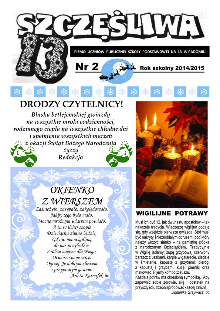 PISMO UCZNIÓW PUBLICZNEJ SZKOLY PODSTAWOWEJ NR 13 W RADOMIU Nr 2 Rok szkolny 2014/2015 DRODZY CZYTELNICY! Blasku betlejemskiej gwiazdy na wszystkie mroki codzienności, rodzinnego ciepła na wszystkie chłodne dni i spełnienia wszystkich marzeń z okazji Świąt Bożego Narodzenia życzy Redakcja OKIENKO Z WIERSZEM Zaśnieżyło, zasypało, zakolędowało. Jakby tego było mało, Mocno mroźnym wiatrem powiało. A tu w lichej szopie Dzieciątku zimno będzie, Gdy w noc wigilijną do nas przybędzie. Zróbże miejsce dla Niego, Otwórz swoje serce. Ogrzej Je dobrym słowem i przyjaznym gestem. Arleta Karnafel, 6c WIGILIJNE POTRAWY Musi ich być 12, jak dwunastu apostołów – tak nakazuje tradycja. Wieczerzę wigilijną podaje się, gdy wzejdzie pierwsza gwiazda. Stół musi być nakryty śnieżnobiałym obrusem, pod który należy włożyć sianko – na pamiątkę żłóbka z narodzonym Dzieciątkiem. Tradycyjnie w Wigilię jadamy: zupę grzybową, czerwony barszcz z uszkami, karpie w galarecie, śledzie w śmietanie, kapustę z grzybami, pierogi z kapustą i grzybami, kutię, pierniki oraz makowiec. Pijemy kompot z suszu. Każda z potraw ma określoną symbolikę. Aby zapewnić sobie zdrowie, siłę i dostatek na przyszły rok, trzeba spróbować każdej z nich! Dominika Grzywacz, 6c DO TRZECH RAZY SZTUKA O BOŻYM NARODZENIU KIEDYŚ Święta Bożego Narodzenia wyzwalają w nas potrzebę bycia dobrym dla innych i chęć dzielenia się z innymi. Szkolne Koło Wolontariuszy już w listopadzie zaczęło przygotowania do świątecznych odwiedzin jednego z radomskich Rodzinnych Domów Dziecka. O tej wizycie i przygotowaniach rozmawialiśmy z p. Martą Rdzanek i wolontariuszkami: Dominiką Bochniewską, Arletą Karnafel i Nikolą Figurą. Redakcja: Jakie prezenty przygotowaliście dla mieszkańców odwiedzanego domu? P. M. Rdzanek: To były zabawki, książeczki dla dzieci, kredki, farby – takie drobiazgi. Zebraliśmy je wśród uczniów naszej szkoły. Przy okazji: wszystkim darczyńcom bardzo gorąco dziękujemy! Jednak poznana przez nas siódemka dzieci była mile zaskoczona, bo to były pierwsze odwiedziny Mikołaja odkąd dom zaczął działać. Zostaliśmy serdecznie ugoszczeni, to była bardzo miła wizyta, jak u dobrych znajomych. R.: Dziewczęta, co zdecydowało, że zostałyście wolontariuszkami? Dominika: Ja lubię pomagać innym. Szczególnie lubię dzieci! Nikola: Dobro wraca do człowieka. Staram się być zawsze dobra i życzliwa. Arleta: Pomaganie przynosi radość. To wielka satysfakcja, gdy zrobi się coś dobrego dla innych. R.: Czego życzyłybyście ludziom z okazji Świąt Bożego Narodzenia? P. M. R.: Pogody ducha, radości, życzliwości innych oraz świąt spędzonych w ciepłej, rodzinnej atmosferze. Dominika: Żeby nikt nie był samotny. Arleta: Żeby wszyscy byli zdrowi. Nikola: Żeby wszyscy byli szczęśliwi. Dziękujemy za rozmowę. Dzień wigilijny upływał na przybraniem odpowiedniej izby i przygotowywaniu przez gospodynie wieczerzy. Gospodarz przynosił z lasu gałęzie różnych drzew, np. jałowca albo sosny i umieszczał je na stole lub wieszał u sufitu nad stołem, ozdabiając je łańcuchami zrobionymi z kolorowego papieru i cukierkami. Gałęzie jako symbol życia należało trzymać w domu aż do Trzech Króli, a następnie spalić. Na stole wigilijnym kładziono siano, które nakrywano białym obrusem. Na siano układano opłatki. Obowiązkowo w kącie izby albo pod stołem umieszczano snopek słomy, a w niektórych wsiach garść niewymłóconego żyta. Jak pojawiała się pierwsza gwiazda, zasiadano do wigilijnej wieczerzy. Uczta wigilijna miała wszystkich łączyć. Pamiętano jednak o nieobecnych i o zmarłych niedawno członkach rodziny. Wspominano ich, a przy stole zawsze zostawało jedno wolne miejsce dla niespodziewanego gościa. Przygotowywana wieczerza musiała być ona postna. Po wieczerzy gospodarze zanosili bydłu kolorowe opłatki: różowe, zielone lub niebieskie, wkładając je w przekrojone na pół ziemniaki. Wierzono, że uchroni to zwierzęta od chorób, zarazy i nieszczęść. Ważną wróżbę stanowiło wierzenie, kto pierwszy przestąpi próg domu. W większości uważano, że jeżeli dom nawiedzi pierwsza kobieta, będzie to zapowiedź powodzenia przez cały rok, a zacielone krowy urodzą cielaczki. Jeśli pierwszy przybędzie mężczyzna to zapowiedź klęsk i niepowodzeń, a krowy urodzą byczka. Rano należało wcześnie wstać i umyć się w rzece, aby być zdrowym i ładnym. Przez cały dzień trzeba było być uśmiechniętym, pogodnym i uprzejmym. Warto tym pamiętać również dziś. Nikola Figura, 6c BOŻE NARODZENIE W AUSTRALII Australia to kontynent zamieszkiwany przez wielokulturową społeczność – od czasów kolonizacyjnych przybywali tam ludzie z całego świata, a razem z nimi narodowe potrawy i obyczaje. Przez setki lat te składniki wymieszały się, tworząc różnorodną, ale jednolitą całość, która doprawiona została świątecznym darem kontynentu – temperaturami dochodzącymi w tym okresie do ponad 30 stopni Celsjusza, wiecznie zielonymi drzewami, i... Wyspami Bożego Narodzenia! Przeważnie w Australii panuje tradycja angielska, z której wziął się zwyczaj przychodzenia św. Mikołaja tylko w Boże Narodzenie, przez co australijskie dzieci nie znają Mikołajek. Staruszek z prezentami pojawia się 25 grudnia i wtedy obdarowuje wszystkich ich wymarzonymi prezentami. Właściwie w jego przedstawieniach podobne do naszych są wszystkie szczegóły poza wyglądem ubrań – oczywiście są one koloru czerwonego, ale Australijczycy dopasowali je do panującego wtedy lata – najczęściej Mikołaj ma krótkie spodenki i koszulkę, kapelusz zamiast ciepłej czapki podszytej futerkiem, a na nogach często zdarzają się... japonki (nie wspominając już o Mikołaju w czerwonych kąpielówkach surfującym po oceanie). Nie jest pokazywany w towarzystwie reniferów, a misiów koala i kangur
