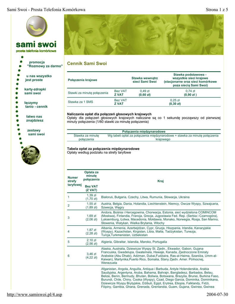 Sami Swoi - Prosta Telefonia Komórkowa promocja "Rozmowy za darmo" Strona 1 z 5 Cennik Sami Swoi u nas wszystko jest proste Połączenia krajowe karty-zdrapki sami swoi Stawki za minutę połączenia Bez VAT Z VAT Stawka za 1 SMS Bez VAT Z VAT łączymy tanio - cennik łatwo nas znajdziesz Stawka wewnątrz sieci Sami Swoi Stawka podstawowa wszystkie sieci krajowe (stacjonarne oraz sieci komórkowe poza siecią Sami Swoi) 0,49 zł (0,60 zł) 0,74 zł (0,90 zł ) 0,25 zł (0,30 zł) Naliczanie opłat dla połączeń głosowych krajowych Opłaty dla połączeń głosowych krajowych naliczane są co 1 sekundę począwszy od pierwszej minuty połączenia (1/60 stawki za minutę połączenia) zestawy sami swoi Stawka za minutę połączenia Połączenia międzynarodowe Wg tabeli opłat za połączenia międzynarodowe + stawka za minutę połączenia krajowego Tabela opłat za połączenia międzynarodowe Opłaty według podziału na strefy taryfowe Numer strefy taryfowej Opłata za minutę połączenia Kraj Bez VAT (Z VAT) 1 1,39 zł (1,70 zł) Białoruś, Bułgaria, Czechy, Litwa, Rumunia, Słowacja, Ukraina 2 1,55 zł (1,89 zł) Austria, Belgia, Dania, Holandia, Liechtenstein, Niemcy, Owcze Wyspy, Szwajcaria, Szwecja, Węgry 3 1,69 zł (2,06 zł) Andora, Bośnia i Hercegowina, Chorwacja, Estonia, sieć wydzielona COMINCOM (Moskwa), Finlandia, Francja, Grecja, Jugosławia Fed. Rep. (Serbia i Czarnogóra), Luksemburg, Łotwa, Macedonia, Mołdawia, Monako, Norwegia, Rosja, San Marino, Słowenia, Watykan, Wielka Brytania, Włochy 4 1,87 zł (2,28 zł) Albania, Armenia, Azerbejdżan, Cypr, Gruzja, Hiszpania, Irlandia, Kanaryjskie (Wyspy), Kazachstan, Kirgistan, Libia, Malta, Tadżykistan, Tunezja, Turcja,Turkmenistan, Uzbekistan 5 2,10 zł (2,56 zł) Algieria, Gibraltar, Islandia, Maroko, Portugalia 3,46 zł (4,22 zł) Alaska, Australia, Dziewicze Wyspy St. Zjedn., Ekwador, Gabon, Gujana Francuska, Gwadelupa, Gwatemala, Hawaje, Kanada, Zjednoczone Emiraty Arabskie (Abu Dhabi), Adżman, Dubai,Fudżaira, Ras-al-Haima, Szardża, Umm-alKaiwan), Martynika,Puerto Rico, Somalia, Stany Zjedn. Amer. Północnej, Wenezuela 6 Afganistan, Angola, Anguilla, Antiqua i Barbuda, Antyle Holenderskie, Arabia Saudyjska, Argentyna, Aruba, Bahama, Bahrajn, Bangladesz, Barbados, Belau, Belize, Benin, Bermudy, Bhutan, Boliwia, Botswana, Brazylia, Brunei, Burkina Faso, Burundi, Chile, Chiny, Cooka (Wyspy), Czad, Diego Garcia, Dominika, Dominikana, Dziewicze Wyspy Brytyjskie, Dżibuti, Egipt, Erytrea, Etiopia, Falklandy, Fidżi, Filipiny, Gambia, Ghana, Grenada, Grenlandia, Guam, Gujana, Gwinea, Gwinea http://www.samiswoi.pl/4.asp 2004-07-30 Sami Swoi - Prosta Telefonia Komórkowa 7 Strona 2 z 5 6,25 zł (7,63 zł) Bissau, Gwinea Równik, Haiti, Honduras, Hong-Kong, Indie, Indonezja, Irak, Iran, Izrael, Jamajka, Japonia, Jemen, Jordania, Kajmany, Kambodża, Kamerun, Katar, Kenia, Kiribati, Kolumbia, Komory, Kongo, Kongo-Rep. Demokratyczna, Korea Płd., Koreańska Rep. Lud.-Dem, Kostaryka, Kuba, Kuwejt, Laos, Lesotho, Liban, Liberia, Madagaskar, Makau, Malawi, Malediwy, Malezja, Mali, Marshalla (Wyspy), Mauretania, Mauritius, Meksyk, Mikronezja, Mongolia, Montserrat, Mozambik, Myanmar, Namibia, Nauru, Nepal, Niger, Nigeria, Nikaragua, Niue, Norfolk, Nowa Kaledonia, Nowa Zelandia, Oman, Pakistan, Panama, Papua (Nowa Gwinea), Paragwaj, Peru, Polinezja Francuska, Republika Południowej Afryki, Republika Środkowo-Afryk., Reunion, Rwanda, Saint Kitts i Nevis, Saint Lucia, Saint Vincent, Saipan, Salomona (Wyspy), Salwador, Samoa Amerykańskie, Samoa Zachodnie, Senegal, Seszele, Sierra Leone, Singapur, Sri Lanka, Sudan, Surinam, Swaziland, Syria, Św.Helena (Wyspa), Św.Piotra i Mikelona (Wyspy), Św.Tomasza (Wyspa), Tajlandia, Tajwan, Tanzania, Togo, Tokelau, Tonga, Trynidad i Tobago, Turks, Tuvalu, Uganda, Urugwaj, Wallis i Futuna, Wietnam, Wniebowstąpienia (Wyspy), Wybrzeże Kości Słoniowej, Vanuatu, Zanzibar, Zambia, Zielonego Przylądka (Wyspy), Zimbabwe Naliczanie opłat dla połączeń głosowych międzynarodowych Opłaty za połączenia międzynarodowe naliczane są za każde rozpoczęte 30 sekund połączenia. Cennik kart Sami Swoi (karta zdrapka Sami Swoi) Karta Sami Swoi "10" Karta Sami Swoi "20" Karta Sami Swoi "40" Bez VAT Z VAT 8,20 zł (10,00 zł) 16,39 zł (20,00 zł) 32,79 zł (40,00 zł) Przedłużenie ważności konta dla rozmów wychodzących 7 dni 30 dni 60 dni Przedłużenie ważności konta o dodatkową ilość dni dla 7 dni rozmów przychodzących 30 dni 30 dni Uwaga: Okres karencji dla użytkowników upływa w 365 dniu od chwili zawieszenia konta z powodu zakończenia okresu ważności lub wyczerpania jego wartości. Po upływie okresu karencji zgodnie z Regulaminem Świadczenia Usług Telekomunikacyjnych przez Polkomtel w części dla Użytkowników następuje całkowite zaprzestanie świadczenia usług (deaktywacja numeru). Cennik Sami Swoi Serwisy Audioteksowe Opłaty za połączenia pod specjalne numery serwisów audioteksowych Opłata za minutę połączenia Bez VAT Opłata za minutę połączenia Z VAT 700 5 x 1,87 zł 2,28 zł 700 6 x 2,00 zł 2,44 zł 700 7 x 2,10 zł 2,56 zł 700 8 x 3,46 zł 4,22 zł 700 9 x 4,00 zł 4,88 zł Numer serwisu * * x - ciąg dowolnych cyfr z zakresu od 0 do 9. Numery podawane będą przez dostawców serwisów audioteksowych w ich materiałach reklamowych i promocyjnych. Ceny są podane za minutę połączenia. Naliczanie impulsu następuje co każde rozpoczęte 60 sekund połączenia z wybranym numerem. Podane stawki obowiązują przez 24 godziny na dobę przez 7 dni w tygodniu. Serwisy rozrywkowe i informacyjne Opłata za połączenie z numerami serwisów rozrywkowych i informacyjnych Zakres numerów http://www.samiswoi.pl/4.asp Opłata za minutę połączenia Bez VAT Opłata za minutę połączenia Z VAT 2004-07-30 Sami Swoi - Prosta Telefonia Komórkowa Strona 3 z 5 * 70 XI 0,50 zł 0,61 zł * 71 XI 1,00 zł 1,22 zł * 72 XI 2,00 zł 2,44 zł * 73 XI 3,00 z
