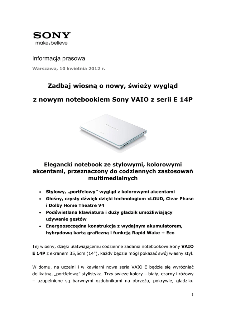 osokuna Informacja prasowa Warszawa, 10 kwietnia 2012 r. Zadbaj wiosną o nowy, świeży wygląd z nowym notebookiem Sony VAIO z serii E 14P Elegancki notebook ze stylowymi, kolorowymi akcentami, przeznaczony do codziennych zastosowań multimedialnych Stylowy, „portfelowy” wygląd z kolorowymi akcentami Głośny, czysty dźwięk dzięki technologiom xLOUD, Clear Phase i Dolby Home Theatre V4 Podświetlana klawiatura i duży gładzik umożliwiający używanie gestów Energooszczędna konstrukcja z wydajnym akumulatorem, hybrydową kartą graficzną i funkcją Rapid Wake + Eco Tej wiosny, dzięki ułatwiającemu codzienne zadania notebookowi Sony VAIO E 14P z ekranem 35,5cm (14"), każdy będzie mógł pokazać swój własny styl. W domu, na uczelni i w kawiarni nowa seria VAIO E będzie się wyróżniać delikatną, „portfelową” stylistyką. Trzy świeże kolory – biały, czarny i różowy – uzupełnione są barwnymi ozdobnikami na obrzeżu, pokrywie, gładziku 1 i klawiaturze notebooka. Atrakcyjność wyglądu zwiększa dodatkowo wykonana zaluminium ramka głośnika. Klawiatura ma wygodnie rozmieszczone, izolowane klawisze, a jej podświetlenie – włączane przez czujnik światła w otoczeniu – umożliwia bezbłędne pisanie nawet późnym wieczorem. Ten sam czujnik zmniejsza jasność ekranu, aby obniżyć zużycie energii w słabszym oświetleniu. Duży, obsługujący gesty gładzik pozwala na klikanie na dużej powierzchni i umożliwia intuicyjną, „bezprzyciskową” obsługę. Nie brakuje więc miejsca na przeglądanie stron www czy edycję zdjęć przy użyciu takich gestów, jak przewijanie, pstryknięcie, uszczypnięcie, powiększenie i obrót. Nowością w komputerach VAIO jest obsługa gestami, dzięki której pewne operacje można wykonać intuicyjnymi ruchami ręki. Przykładowo, umieszczając rękę przed kamerą internetową i przesuwając ją w lewo lub w prawo można przerzucać strony www lub zdjęcia w galerii. Przeciągnięcie ręką do dołu wstrzyma odtwarzanie muzyki, a ruch obrotowy pozwoli na zwiększenie lub zmniejszenie głośności. Obsługa gestami jest obecnie dostępna w programach Windows® Media Player, Internet Explorer® 9, PowerPoint® i PowerDVD. Wbudowana kamera internetowa HD z przetwornikiem „Exmor for PC” poprawia jakość obrazu podczas wideorozmów. Przyjaciele i najbliżsi na pewno docenią lepiej odwzorowane szczegóły, większy kontrast i bogatsze kolory – nawet przy słabym oświetleniu, w którym inne kamery wytworzą tylko ziarnisty i zamazany obraz. 2 Projektanci serii VAIO E 14P zadbali, by dobry wygląd był uzupełniony czystym dźwiękiem. Unikatowe technologie Sony xLOUDTM i Clear PhaseTM zwiększają głośność dźwięku bez wprowadzania zniekształceń, co przekłada się na imponujące brzmienie filmów i gier. Można także włączyć system Dolby® Home Theatre® V4, który zapewni bogaty, kinowy dźwięk zarówno przy słuchaniu przez wbudowane głośniki, jak i przez słuchawki lub głośniki zewnętrzne. Energooszczędna konstrukcja serii VAIO E wydłuża działanie akumulatora zarówno przy zabawie, jak i w czasie pracy. Do 7 godzin pracy bez ładowania1 oznacza możliwość swobodnego robienia notatek na wykładach i korzystania po zajęciach z serwisów społecznościowych lub przeglądania ulubionych stron www. Hybrydowy system graficzny wykorzystuje dedykowany procesor grafiki do zastosowań o znacznej złożoności, takich jak gry, wyświetlanie filmów czy edycja zdjęć. W przypadku zadań o mniejszych wymaganiach procesor ten jest wyłączany, co zwiększa czas pracy akumulatora. Do wydłużenia czasu pracy przyczynia się też efektywny wyświetlacz VAIO i energooszczędne procesory, jak również wbudowany napęd optyczny, który w trybie spoczynkowym w ogóle nie pobiera energii. Nie masz chwili do stracenia? Dzięki nowej funkcji Rapid Wake + Eco, komputer w jednej chwili jest gotowy do działania. Ten energooszczędny tryb przełącza komputer VAIO w tryb głębokiego uśpienia. Maszyna zużywa wówczas minimalną ilość energii, dzięki czemu może pozostawać w tym trybie nawet przez 10 dni2. Wystarczy jednak otworzyć pokrywę komputera, by w kilka sekund wszystkie pliki i aplikacje zostały przywrócone do stanu sprzed uśpienia. Komputer VAIO może także pełnić funkcję ładowarki smartfonu: wystarczy podłączyć go do portu USB, nawet jeśli komputer jest wyłączony albo uśpiony. Porządkowanie, edycja i prezentowanie kolekcji multimediów przechowywanych w notebooku VAIO z serii E to prawdziwa przyjemność. Dostarczany z komputerem bez dodatkowych opłat program PlayMemories 3 Home firmy Sony pozwala z łatwością wyszlifować własne zdjęcia i filmy, dzięki czemu samodzielna obróbka filmów, również w formacie 3D, jest prostsza niż kiedykolwiek przedtem. Personalizację wyglądu notebooka VAIO umożliwia dopasowana wyglądem mysz Bluetooth® i pokrowiec podróżny. W ofercie znajdzie się również zestaw zawierający komputer VAIO z dopasowanymi akcesoriami: myszą i nakładką na klawiaturę. Nowa seria VAIO E 14P będzie dostępna w Polsce od czerwca 2012 r. w kolorze białym, czarnym i różowym. 1 Faktyczny czas pracy akumulatora zależy od konkretnej konfiguracji sprzętowej i programowej. Benchmark: MobileMark 2007 2 Czas pracy akumulatora w trybie uśpienia zależy od konfiguracji i warunków pracy: rozmiaru zainstalowanej pamięci, stanu naładowania akumulatora i ustawień ładowania przez USB. – Koniec – Model VAIO SVE14A1S1EW Procesor Procesor Intel® Core™ i3-2350M System operacyjny Oryginalny Windows® 7 Home Premium (64-bitowy) z dodatkiem Service Pack 1 Pamięć 4 GB DDR3 SDRAM (1333 MHz) Napęd Twardy dysk 500 GB, 5400 obr./min Ekran Wyświetlacz VAIO 35,5 cm (14"), 16:9, rozdzielczość 1366 x 768 Grafika AMD Radeon™ HD 7670M (1GB VRAM) + Intel® HD Graphics 3000 Napęd optyczny Napęd DVD SuperMulti WLAN 802.11b/g/n; Bluetooth® 4.0 + H