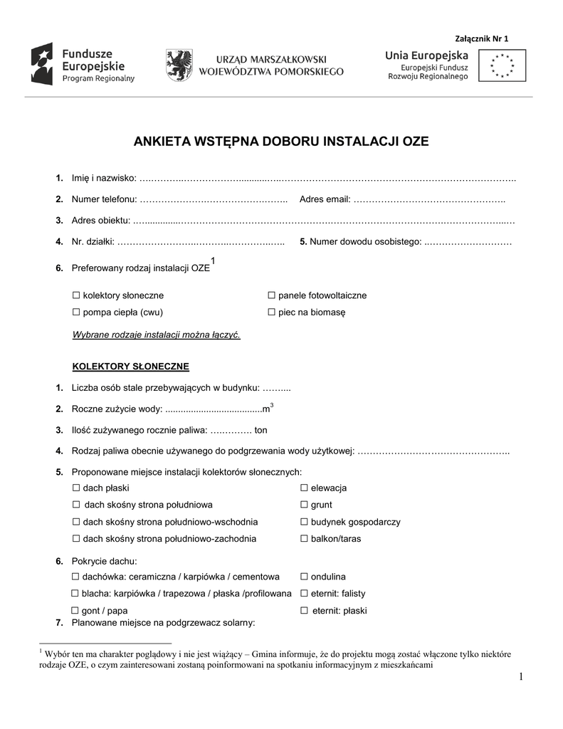 Załącznik Nr 1 ANKIETA WSTĘPNA DOBORU INSTALACJI OZE 1. Imię i nazwisko: ….………..………………...........…..………………………………………………………………….. 2. Numer telefonu: ………………….……………….…….. Adres email: ………………………………………….. 3. Adres obiektu: .…..............………………………………………….……………………………….………………...… 4. Nr. działki: ……………………..………..…………..….. 6. Preferowany rodzaj instalacji OZE 5. Numer dowodu osobistego: ..……………………… 1 □ kolektory słoneczne □ pompa ciepła (cwu) □ panele fotowoltaiczne □ piec na biomasę Wybrane rodzaje instalacji można łączyć. KOLEKTORY SŁONECZNE 1. Liczba osób stale przebywających w budynku: …….... 2. Roczne zużycie wody: ......................................m 3 3. Ilość zużywanego rocznie paliwa: ….………. ton 4. Rodzaj paliwa obecnie używanego do podgrzewania wody użytkowej: ………………………………………….. 5. Proponowane miejsce instalacji kolektorów słonecznych: □ dach płaski □ dach skośny strona południowa □ dach skośny strona południowo-wschodnia □ dach skośny strona południowo-zachodnia □ elewacja □ grunt □ budynek gospodarczy □ balkon/taras 6. Pokrycie dachu: □ dachówka: ceramiczna / karpiówka / cementowa □ ondulina □ blacha: karpiówka / trapezowa / płaska /profilowana □ eternit: falisty □ gont / papa □ eternit: płaski 7. Planowane miejsce na podgrzewacz solarny: 1 Wybór ten ma charakter poglądowy i nie jest wiążący – Gmina informuje, że do projektu mogą zostać włączone tylko niektóre rodzaje OZE, o czym zainteresowani zostaną poinformowani na spotkaniu informacyjnym z mieszkańcami 1 Załącznik Nr 1 □ kotłowania, □ pomieszczenie gospodarcze □ ocieplone poddasze □ pomieszczenie mieszkalne 8. Wymiary pomieszczenia na podgrzewacz solarny: szerokość ….…. długość….…. wysokość…….. 9. Szerokość drzwi pomieszczenia przygotowanego na podgrzewacz solarny:………,….. m 10. Czy w pomieszczeniu, gdzie będzie znajdował się zbiornik c.w.u. doprowadzony jest prąd? □ Tak □ Nie 11. Czy w pomieszczeniu, gdzie będzie znajdował się zbiornik c.w.u., jest możliwość podłączenia się do ciepłej i zimnej wody użytkowej? □ Tak □ Nie – podać szacunkową odległość………..……m 12. Czy obecnie na instalacji jest zamontowany reduktor ciśnienia? □ tak □ nie 13. Czy istnieje instalacja odgromowa w budynku? □ tak □ nie 14. Istniejące źródło ciepła dla podgrzania ciepłej wody użytkowej: □ kocioł gazowy 1-funkcyjny z wolnostojącym zasobnikiem □ kocioł gazowy 1-funkcyjny ze zintegrowanym zasobnikiem □ kocioł na paliwo stałe węgiel □ kocioł olejowy □ kocioł gazowy 2-funkcyjny □ kocioł gazowy gaz ziemny / płynny □ kocioł na paliwo stałe opalany biomasą □ przepływowy podgrzewacz wody □ pojemnościowy podgrzewacz wody PANELE FOTOWOLTAICZNE 2 1. Moc umowna (przyłączeniowa) ………. Zużycie energii elektrycznej w gospodarstwie domowym na podstawie rachunków za energię elektryczną 2015 r. Wyszczególnienie 3 Zużycie w okresach rozliczeniowych w 2015 r. Zużycie rzeczywiste [kWh] Zużycie prognozowane [kWh] Styczeń Luty Marzec Kwiecień 2 Moc umowna wynika z podpisanej umowy z operatorem systemu dystrybucyjnego oraz jest wyrażona w [kW]. Często występuje w fakturach za energię elektryczną pod pozycją „moc umowna” lub w pozycji „ilość” przy opłacie sieciowej stałej lub przy opłacie przejściowej 3 Zużycie proszę podać na poszczególne okresy obliczeniowe (miesięczne, dwumiesięczne, kwartalne, roczne) 2 Maj Czerwiec Lipiec Sierpień Wrzesień Październik Listopad Grudzień Razem w roku 2. Proponowane miejsce instalacji paneli fotowoltaicznych □ dach płaski □ dach skośny strona południowa □ dach skośny strona południowo-wschodnia □ dach skośny strona południowo-zachodnia □ elewacja □ grunt □ budynek gospodarczy □ balkon/taras 3. Pokrycie dachu: □ dachówka: ceramiczna / karpiówka / cementowa □ ondulina □ blacha: karpiówka / trapezowa / płaska /profilowana □ eternit: falisty □ gont / papa □ eternit: płaski POMPA CIEPŁA 2 1. Powierzchnia / kubatura domu: .……..m / ….……m 3 2. Moc istniejącego kotła: ……………………….…... kW 3. Ilość zużywanego rocznie paliwa: ….………. ton 4. Liczba osób stale przebywających w budynku:…….... 5. Roczne zużycie wody: ......................................m 3 6. Rodzaj paliwa obecnie używanego do podgrzewania wody użytkowej: ………………………………………….. 7. Rodzaj paliwa obecnie używanego do ogrzewania domu: ……………………………………………………….…. 3 KOCIOŁ NA BIOMASĘ 2 1. Powierzchnia / kubatura domu: .……..m / ….……m 3 2. Ilość zużywanego rocznie paliwa: ….………. ton 3. Moc istniejącego kotła: ……………………….…... kW 4. Rodzaj paliwa obecnie używanego do podgrzewania wody użytkowej: ………………………………………….. 5. Rodzaj paliwa obecnie używanego do ogrzewania domu: ……………………………………………………….…. 6. Wymiary kotłowni lub miejsca przeznaczonego na kocioł: szerokość….…. długość….…. wysokość…….. 7. Czy kocioł grzeje ciepłą wodę użytkową? □ tak □ nie …………………………..…………………………………………….. DATA I CZYTELNY PODPIS BENEFICJENTA Niniejszym wyrażam zgodę na przetwarzanie danych osobowych zawartych w niniejszej ankiecie na potrzeby prawidłowej realizacji projektu zgodnie z ustawą z dnia 29.08.1997 r. o ochronie danych osobowych (Dz.U. 2015, poz. 2135). 4