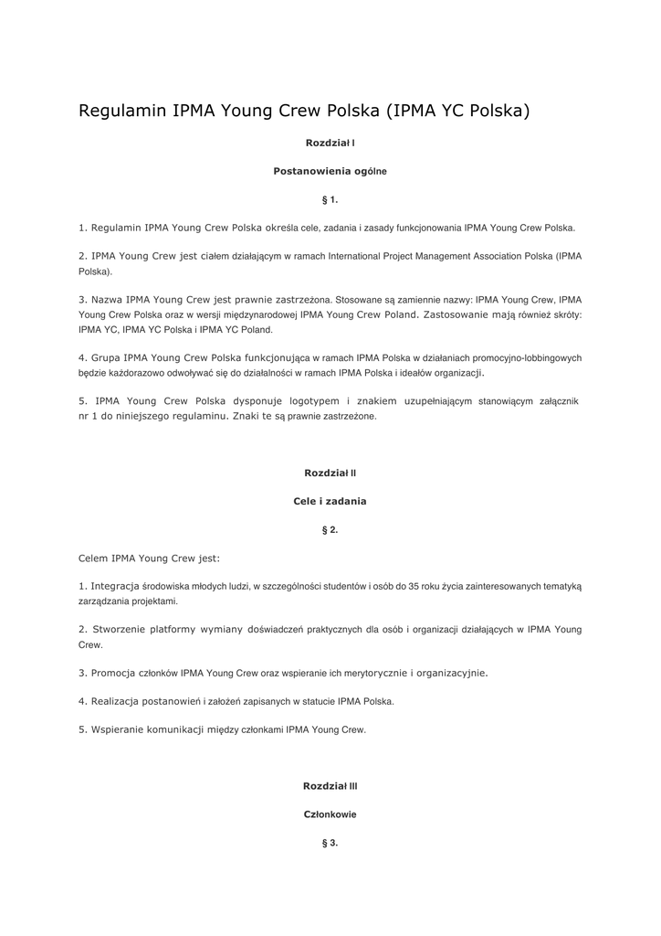 Regulamin IPMA Young Crew Polska (IPMA YC Polska) Rozdział I Postanowienia ogólne § 1. 1. Regulamin IPMA Young Crew Polska określa cele, zadania i zasady funkcjonowania IPMA Young Crew Polska. 2. IPMA Young Crew jest ciałem działającym w ramach International Project Management Association Polska (IPMA Polska). 3. Nazwa IPMA Young Crew jest prawnie zastrzeżona. Stosowane są zamiennie nazwy: IPMA Young Crew, IPMA Young Crew Polska oraz w wersji międzynarodowej IPMA Young Crew Poland. Zastosowanie mają również skróty: IPMA YC, IPMA YC Polska i IPMA YC Poland. 4. Grupa IPMA Young Crew Polska funkcjonująca w ramach IPMA Polska w działaniach promocyjno-lobbingowych będzie każdorazowo odwoływać się do działalności w ramach IPMA Polska i ideałów organizacji. 5. IPMA Young Crew Polska dysponuje logotypem i znakiem uzupełniającym stanowiącym załącznik nr 1 do niniejszego regulaminu. Znaki te są prawnie zastrzeżone. Rozdział II Cele i zadania § 2. Celem IPMA Young Crew jest: 1. Integracja środowiska młodych ludzi, w szczególności studentów i osób do 35 roku życia zainteresowanych tematyką zarządzania projektami. 2. Stworzenie platformy wymiany doświadczeń praktycznych dla osób i organizacji działających w IPMA Young Crew. 3. Promocja członków IPMA Young Crew oraz wspieranie ich merytorycznie i organizacyjnie. 4. Realizacja postanowień i założeń zapisanych w statucie IPMA Polska. 5. Wspieranie komunikacji między członkami IPMA Young Crew. Rozdział III Członkowie § 3. 1. Członkostwo w IPMA Young Crew jest dobrowolne. 2. Członkami IPMA Young Crew mogą być osoby fizyczne i prawne, z tym zastrzeżeniem, iż osoba prawna może być jedynie członkiem wspierającym IPMA Young Crew. 3. Członkostwo w IPMA Young Crew oznacza poparcie dla celów i zadań IPMA Young Crew oraz chęć aktywnej działalności. 4. Członkostwo w IPMA Young Crew nie wyklucza i nie stanowi posiadania czynnego i biernego prawa wyborczego w wyborach do organów Stowarzyszenia Project Management Polska. § 4. Członkowie IPMA Young Crew Polska dzielą się na: 1/ Członków indywidualnych, 2/ Członków wspierających, 3/ Członków honorowych. § 5. 1. Członkiem indywidualnym może być osoba fizyczna mająca uregulowane składki członkowskie w IPMA Polska, posiadająca pełną zdolność do czynności prawnych i niepozbawiona praw publicznych, spełniająca postanowienia statutowe IPMA Polska. 2. Członek indywidualny IPMA Young Crew to osoba fizyczna, która powinna mieć ukończone minimum 16 lat oraz nie więcej niż 35 lat. 3. Członkiem indywidualnym może zostać osoba należąca do IPMA Polska, która nie ukończyła 35 roku życia lub członek organizacji studenckiej, zrzeszonej w IPMA YC spełniający warunki określone w par. 5 pkt 2. 4. Członkiem wspierającym może być osoba fizyczna lub prawna zainteresowana działalnością IPMA Young Crew, która zadeklarowała na jego rzecz pomoc finansową lub rzeczową. Osoba prawna działa w IPMA Young Crew przez swojego umocowanego przedstawiciela. Przedstawiciel winien spełniać założenia wymienione w pkt. 2 niniejszego paragrafu. Członkiem wspierającym może zostać Koło Naukowe Uczelni Wyższej. 5. Członków indywidualnych przyjmuje się w drodze uchwały Rady IPMA Young Crew Polska na podstawie deklaracji, po opłaceniu obowiązującej składki członkowskiej w IPMA Polska. 6. Członków wspierających przyjmuje w drodze uchwały Rady IPMA Young Crew na podstawie pisemnej deklaracji zainteresowanego oraz pisemnej rekomendacji Rady IPMA Young Crew oraz po uprzednim uzgodnieniu ich wkładu finansowego lub rzeczowego. 7. Członkiem honorowym może zostać osoba fizyczna, która wniosła wybitny wkład w rozwój IPMA Young Crew. § 6. 1. Członek indywidualny i członek honorowy IPMA YC ma prawo do: 1/ uczestniczenia w zebraniach, odczytach, konferencjach, sympozjach, szkoleniach i warsztatach organizowanych przez IPMA Young Crew oraz IPMA Polska, 2/ zgłaszania opinii, wniosków i postulatów właściwym władzom IPMA Young Crew, 3/ korzystania z infrastruktury IPMA Young Crew i IPMA Polska oraz korzystania z jego wsparcia i pomocy, na zasadach określonych uchwałami Zarządu IPMA Polska i Rady IPMA YC. 2. Członek indywidualny IPMA YC zobowiązany jest do: 1/ aktywnego uczestnictwa w pracach IPMA Young Crew, 2/ przestrzegania statutu, regulaminów i uchwał władz IPMA Polska i IPMA YC, 3/ przestrzegania standardów zawodowych i etycznych określonych IPMA Polska i IPMA YC, 4/ regularnego płacenia składek i innych świadczeń nałożonych na członków zgodnie ze Statutem IPMA Polska, 5/ promowania idei i celów IPMA Young Crew oraz IPMA Polska we własnych środowiskach zawodowych i akademickich. § 7. 1. Członek wspierający IPMA Young Crew posiada takie prawa jak członek zwyczajny za wyjątkiem czynnego i biernego prawa wyborczego. 2. Członek wspierający ma prawo brać udział – z głosem doradczym – w posiedzeniach Rady i Komisji Rewizyjnej IPMA YC. 3. Członek wspierający jest zobowiązany do regularnego wywiązywania się z deklarowanych świadczeń w umowie zawartej z IPMA Polska oraz przestrzegania statutu, regulaminu i uchwał władz IPMA Polska oraz IPMA Young Crew. 4. Członkowie honorowi zwolnieni są z opłacania składek członkowskich i innych świadczeń określonych Statutem. § 8. 1. Członkostwo indywidualne w IPMA Young Crew ustaje na skutek: 1/ rezygnacji złożonej na piśmie Radzie IPMA YC, , 2/ śmierci członka lub utraty osobowości prawnej przez członka wspierającego, 3/ skreślenia z listy członków z powodu nieusprawiedliwionego zalegania z opłatą składek członkowskich lub innych zobowiązań, 4/ wykluczenia ze Stowarzyszenia IPMA Polska na mocy uchwały Zarządu w przypadku stwierdzenia rażącego naruszenia zasad statutowych, nieprzestrzegania postanowień uchwał i regulaminów, zasad i kodeksu etycznego 5/ wykluczenia w wyniku prawomocnego orzeczenia są
