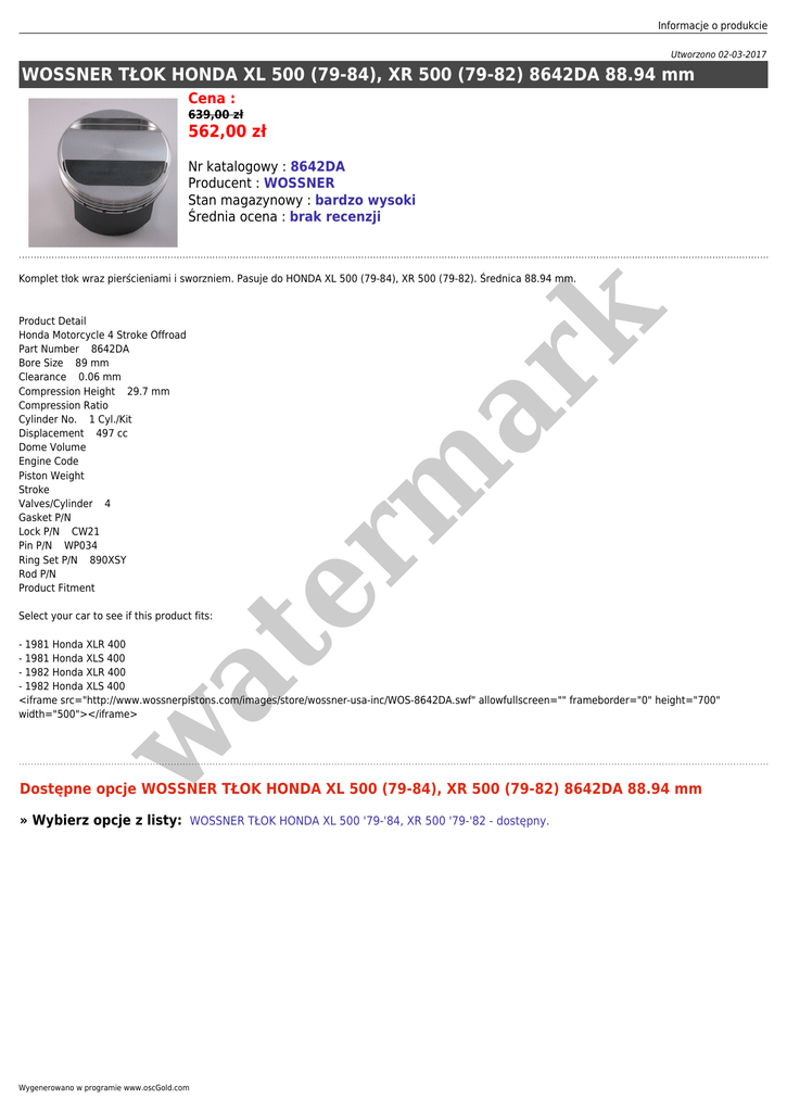 Informacje o produkcie Utworzono 02-03-2017 WOSSNER TŁOK HONDA XL 500 (79-84), XR 500 (79-82) 8642DA 88.94 mm Cena : 639,00 zł 562,00 zł Nr katalogowy : 8642DA Producent : WOSSNER Stan magazynowy : bardzo wysoki Średnia ocena : brak recenzji Product Detail Honda Motorcycle 4 Stroke Offroad Part Number 8642DA Bore Size 89 mm Clearance 0.06 mm Compression Height 29.7 mm Compression Ratio Cylinder No. 1 Cyl./Kit Displacement 497 cc Dome Volume Engine Code Piston Weight Stroke Valves/Cylinder 4 Gasket P/N Lock P/N CW21 Pin P/N WP034 Ring Set P/N 890XSY Rod P/N Product Fitment Select your car to see if this product fits: er m ar k Komplet tłok wraz pierścieniami i sworzniem. Pasuje do HONDA XL 500 (79-84), XR 500 (79-82). Średnica 88.94 mm. w at - 1981 Honda XLR 400 - 1981 Honda XLS 400 - 1982 Honda XLR 400 - 1982 Honda XLS 400 <iframe src="http://www.wossnerpistons.com/images/store/wossner-usa-inc/WOS-8642DA.swf" allowfullscreen="" frameborder="0" height="700" width="500"></iframe> Dostępne opcje WOSSNER TŁOK HONDA XL 500 (79-84), XR 500 (79-82) 8642DA 88.94 mm » Wybierz opcje z listy: WOSSNER TŁOK HONDA XL 500 '79-'84, XR 500 '79-'82 - dostępny. Wygenerowano w programie www.oscGold.com