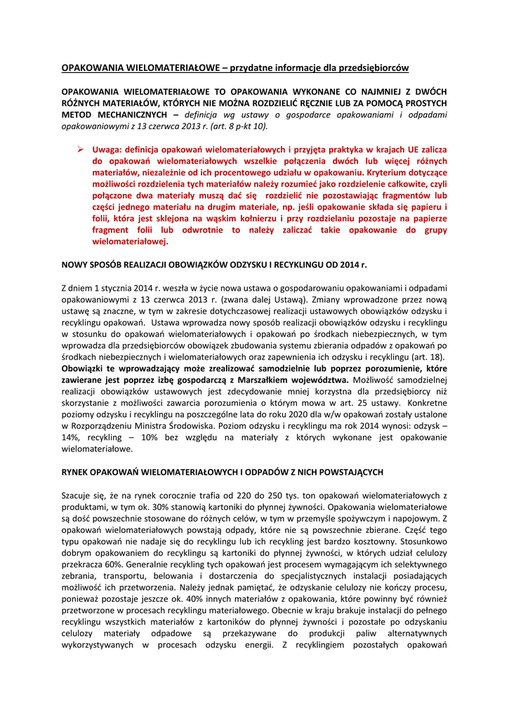 OPAKOWANIA WIELOMATERIAŁOWE – przydatne informacje dla przedsiębiorców OPAKOWANIA WIELOMATERIAŁOWE TO OPAKOWANIA WYKONANE CO NAJMNIEJ Z DWÓCH RÓŻNYCH MATERIAŁÓW, KTÓRYCH NIE MOŻNA ROZDZIELIĆ RĘCZNIE LUB ZA POMOCĄ PROSTYCH METOD MECHANICZNYCH – definicja wg ustawy o gospodarce opakowaniami i odpadami opakowaniowymi z 13 czerwca 2013 r. (art. 8 p-kt 10). Uwaga: definicja opakowań wielomateriałowych i przyjęta praktyka w krajach UE zalicza do opakowań wielomateriałowych wszelkie połączenia dwóch lub więcej różnych materiałów, niezależnie od ich procentowego udziału w opakowaniu. Kryterium dotyczące możliwości rozdzielenia tych materiałów należy rozumieć jako rozdzielenie całkowite, czyli połączone dwa materiały muszą dać się rozdzielić nie pozostawiając fragmentów lub części jednego materiału na drugim materiale, np. jeśli opakowanie składa się papieru i folii, która jest sklejona na wąskim kołnierzu i przy rozdzielaniu pozostaje na papierze fragment folii lub odwrotnie to należy zaliczać takie opakowanie do grupy wielomateriałowej. NOWY SPOSÓB REALIZACJI OBOWIĄZKÓW ODZYSKU I RECYKLINGU OD 2014 r. Z dniem 1 stycznia 2014 r. weszła w życie nowa ustawa o gospodarowaniu opakowaniami i odpadami opakowaniowymi z 13 czerwca 2013 r. (zwana dalej Ustawą). Zmiany wprowadzone przez nową ustawę są znaczne, w tym w zakresie dotychczasowej realizacji ustawowych obowiązków odzysku i recyklingu opakowań. Ustawa wprowadza nowy sposób realizacji obowiązków odzysku i recyklingu w stosunku do opakowań wielomateriałowych i opakowań po środkach niebezpiecznych, w tym wprowadza dla przedsiębiorców obowiązek zbudowania systemu zbierania odpadów z opakowań po środkach niebezpiecznych i wielomateriałowych oraz zapewnienia ich odzysku i recyklingu (art. 18). Obowiązki te wprowadzający może zrealizować samodzielnie lub poprzez porozumienie, które zawierane jest poprzez izbę gospodarczą z Marszałkiem województwa. Możliwość samodzielnej realizacji obowiązków ustawowych jest zdecydowanie mniej korzystna dla przedsiębiorcy niż skorzystanie z możliwości zawarcia porozumienia o którym mowa w art. 25 ustawy. Konkretne poziomy odzysku i recyklingu na poszczególne lata do roku 2020 dla w/w opakowań zostały ustalone w Rozporządzeniu Ministra Środowiska. Poziom odzysku i recyklingu ma rok 2014 wynosi: odzysk – 14%, recykling – 10% bez względu na materiały z których wykonane jest opakowanie wielomateriałowe. RYNEK OPAKOWAŃ WIELOMATERIAŁOWYCH I ODPADÓW Z NICH POWSTAJĄCYCH Szacuje się, że na rynek corocznie trafia od 220 do 250 tys. ton opakowań wielomateriałowych z produktami, w tym ok. 30% stanowią kartoniki do płynnej żywności. Opakowania wielomateriałowe są dość powszechnie stosowane do różnych celów, w tym w przemyśle spożywczym i napojowym. Z opakowań wielomateriałowych powstają odpady, które nie są powszechnie zbierane. Część tego typu opakowań nie nadaje się do recyklingu lub ich recykling jest bardzo kosztowny. Stosunkowo dobrym opakowaniem do recyklingu są kartoniki do płynnej żywności, w których udział celulozy przekracza 60%. Generalnie recykling tych opakowań jest procesem wymagającym ich selektywnego zebrania, transportu, belowania i dostarczenia do specjalistycznych instalacji posiadających możliwość ich przetworzenia. Należy jednak pamiętać, że odzyskanie celulozy nie kończy procesu, ponieważ pozostaje jeszcze ok. 40% innych materiałów z opakowania, które powinny być również przetworzone w procesach recyklingu materiałowego. Obecnie w kraju brakuje instalacji do pełnego recyklingu wszystkich materiałów z kartoników do płynnej żywności i pozostałe po odzyskaniu celulozy materiały odpadowe są przekazywane do produkcji paliw alternatywnych wykorzystywanych w procesach odzysku energii. Z recyklingiem pozostałych opakowań wielomateriałowych są obecnie znacznie większe problemy, a co za tym idzie wiąże się to większymi kosztami stworzenia systemu zbierania i przetwarzania tych odpadów. W przypadku obowiązku odzysku sprawa jest prostsza, ponieważ odpady opakowaniowe wielomateriałowe mogą być w formie zmieszanej przekazywane do produkcji paliw alternatywnych i następnie wykorzystywane w procesach odzysku energii. Należy przewidywać, że rynek ten będzie się rozwijał w najbliższych latach. Należy również przewidywać rozwój rynku recyklingu odpadów opakowaniowych innych niż kartoniki do płynnej żywności. W roku 2014 należy oczekiwać, że większość ustawowego obowiązku recyklingu będzie wykonana kartonikami do płynnej żywności. MATERIAŁY OPAKOWANIOWE UWAGA: druki, lakiery, warstwy łączące, kleje w foliach wielowarstwowych, cyny w opakowaniach stalowych itp. nie stanowią materiałów opakowaniowych! Materiałami opakowaniowymi są materiały uwzględnione w aneksach 1-6 Decyzji Komisji Europejskiej 97/129/EC, z dnia 28 stycznia 1997 r. ustanawiającej system identyfikacji materiałów opakowaniowych. Opakowania wielomateriałowe klasyfikowane są pod kodem 15 01 05. PRZYKŁADY OPAKOWAŃ WIELOMATERIAŁOWYCH – UKŁADÓW WIELOMATERIAŁOWYCH Zostały opisane w aneksie 7 Decyzji Komisji Europejskiej 97/129/EC, z dnia 28 stycznia 1997r. ustanawiającej system identyfikacji materiałów opakowaniowych. UKŁADY WIELOMATERIAŁOWE W OPAKOWANIACH Papier i tektura/różne metale Papier i tektura/plastik Papier i tektura/aluminium Papier i tektura/plastik/aluminium Plastik/aluminium Plastik/blacha Plastik/różne metale Szkło/plastik Szkło/aluminium Szkło/blacha Szkło/różne metale UWAGA: opakowań wykonanych z różnych tworzyw sztucznych (np. PE i PP) nie traktuje się jako wielomateriałowych! ELEMENTY I SKŁADNIKI OPAKOWANIA Elementy stanowią część opakowania, która może być oddzielona ręcznie lub przy użyciu prostych środków fizycznych np. etykiety. Składniki stanowią część opakowani