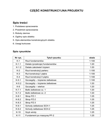 CZĘŚĆ KONSTRUKCYJNA PROJEKTU Spis treści 1. Podstawa opracowania 2. Przedmiot opracowania 3. Roboty ziemne 4. Ogólny opis obiektu 5. Opis elementów konstrukcyjnych obiektu 6. Uwagi końcowe Spis rysunków Nr rys. K-1 Tytuł rysunku skala Rzut fundamentów 1:100 K-1.1 Detale (przekroje) fundamentów 1:20 K-1.2 Detale zakotwień trzpieni 1:20 K-2 Rzut konstrukcji parteru 1:100 K-3 Rut konstrukcji I piętra 1:100 K-4 Rzut konstrukcji II piętra 1:100 K-5.1 Szczegóły – trzpienie żelbetowe 1:100 K-5.2 Szczegóły – trzpienie żelbetowe 1:20 K-6 Szczegóły – wieńce 1:20 K-7.1 Belki żelbetowe cz. 1 1:20 K-7.2 Belki żelbetowe cz. 2 1:20 K-8.1 Strop PZ-1 1:25 K-8.2 Strop PZ-2 1:25 K-8.3 Strop PZ-3 1:25 K-9.1 Schody żelbetowe SCH-1 1:25 K-9.2 Schody żelbetowe SCH-2 1:25 K-10 Szyb windy 1:25 K-11 Fundament po maszynę PF-2 1:25 Opis techniczny do części konstrukcyjnej projektu budowlanego 1. Podstawa opracowania - Wytyczne inwestora - Projekt architektoniczny oraz wytyczne branżowe - Dokumentacja geologiczna - Polskie normy i przepisy 2. Przedmiot opracowania Przedmiotem opracowania jest projekt w branży konstrukcyjnej budynku Centrum Dydaktycznego Badań Kół Zębatych dla PWSZ w Kaliszu usytuowanego w Kaliszu przy ul. Poznańskiej 201-205. 3. Roboty ziemne 3.1 Ocena warunków geologiczno-inżynierskich posadowienia Podstawa opracowania: - plan realizacyjny - dokumentacja techniczna - dokumentacja geologiczna opracowana przez inż. L. Satanowskiego - obliczenie oddziaływania podłoża gruntowego na podstawie PN –81/B - 03020. Grunty budowlane. Posadowienie bezpośrednie budowli. Fundamentowanie obiektu zaprojektowano bezpośrednie ławowe kategoria geotechniczna 2. Wody gruntowej w poziomie posadowienia nie stwierdzono. Poziom odniesienia posadzki w budynku ±0,00 wynosi 121,10 m n.p.m. Pod wszystkimi fundamentami należy bezwzlędnie ułożyć warstwę podbetonu C12/15 gr. minimum 10 cm. Nasyp pod posadzkę paretu należy wykonać z zagęszczalnych piasków i warstwowo zagęścić do stopnia zagęszczenia ID=0,7 co odpowiada wskaźnikowi zagęszczenia IS=0,97. W przypadku stwierdzenia trudnych warunków geotechnicznych należy skonsultować się z projektantem konstrukcji. W trakcie robót fundamentowych należy rozpatrywać równocześnie dokumentacje zawierającą instalację odgromową oraz instalację c.o. i wod-kan. Dokumentacja ta stanowi integralną całość z projektem konstrukcji i architektury. 4. Ogólny opis obiektu Budynek zaprojektowano w konstrukcji tradycyjnej z elementami uprzemysłowionymi, jako obiekt trzykondygnacyjny niepodpiwniczony ze stropodachem płaskim niewentylowanym. Ściany murowane, stropy z płyt kanałowych strunobetonowych typu KS, schody monolityczne żelbetowye, Posadowienie budynku w postaci ław fundamentowych żelbetowych. 5. Opis elementów konstrukcyjnych obiektu 5.1. Posadowienie obiektu - Ławy i stopy fundamentowe żelbetowe, z betonu C20/25 MPa, o wysokości 40 cm, zbrojone RB500W, posadowione na podkładzie betonowym z chudego betonu C12/15 MPa o grubości 10 cm; - Płyta fundamentowa żelbetowa pod ściany szybu windowego wykonana z betonu C20/25 o grubości 40 cm, zbrojona krzyżowo w dwóch poziomach prętami głównymi Ø 12mm w rozstawie co 15 cm ze stali RB500W Płyta posadowiona na gruncie nośnym na podkładzie betonowym z chudego betonu C12/15 MPa o grubości o grubości 10 cm, Ściany fundamentowe Ściany fundamentowe do wysokości izolacji poziomej projektuje się z betonu monolitycznego marki C16/20 MPa o grubości 36 i 24 cm, lub alternatywnie wykonane z bloczków betonowych C16/20 Mpa. Ściany zewnętrzne fundamentowe docieplone od zewnątrz styropianem EPS 100-038 o grubości 4cm 5.2. Ściany nadziemia 5.2.1 Projektuje się następujące rodzaje ścian zewnętrznych: Ściany jednowarstwowe o grubości 42 cm, murowane z pustaków z betonu komórkowego TLMB PP7-070; na systemowej cienkowarstwowej zaprawie klejącej. Ściany wykończone od zewnątrz tynkiem dekoracyjnym STOLIT EFFECT z piaskiem STO TERAZZO EFFECT NATUR lub innego producenta o równoważnych parametrach technicznych. Ściany dwuwarstwowe z okładziną z płyt włókno-cementowych, wykonane w kolejności warstw od wewnątrz z : - pustaków z betonu komórkowego TLMB PP7-070 gr. 24 cm; - wełny mineralnej o grubości 12 cm; - okładzina zewnętrzna z płyt włókowo-cementowych o gr.12 mm. Ściany dwuwarstwowe z okładziną z płyt kamiennych z piaskowca, wykonane w kolejności warstw od wewnątrz z: - pustaków z betonu komórkowego TLMB PP7-070 gr. 30 cm; - wełna mineralna o grubości 12 cm; - okładzina z płyt kamiennych z piaskowca o gr.4 cm układanych „metodą na sucho” bezpośrednio na kotwy rurowe. 5.2.2 Ściany konstrukcyjne wewnętrzne Ściany konstrukcyjne wewnętrzne projektuje się z pustaków z betonu komórkowego TLMB PP7-070 o grubości 24 cm, murowane na zaprawie klejowej systemowej. Ściany kominowe z elementów betonowych Schiedel z kanałami w układzie poziomym. Ściany kominowe murowane na zaprawie cem-wapiennej. Przy ścianie w pomieszczeniu nr 1.6 projektuje się szacht instalacyjny, wykonany jako murowany z cegły pełnej na zaprawie cem-wapiennej o grubości 12 cm. Ściany konstrukcyjne zewnętrzne i wewnętrzne wzmocnione trzpieniami żelbetowymi wykonanymi zgodnie z częścią rysunkową projektu. 5.2.3 Ściany szybu windowego Ściany szybu windowego żelbetowe o grubości 20 i 25 cm wykonane z betonu monolitycznego C20/25 zbrojonego siatką o rozstawie 15x15 cm ze stali RB500W Uwaga: Ściany szybu windowego wykonać w systemowych szalunkach w celu uzyskania na zewnętrznej powierzchni ścian szybu struktury betonu architektonicznego ( powierzchnia zew. ww. ścian stanowić będzie ostateczne ich wykończenie ). 5.3. Stropy Projektuje się stropy z prefabrykowanych płyt kanałowych strunobetonowych typu KS265-V3/R60 o grubości 26,5 cm. Węzły podporowe płyt KS należy konstruować wraz ze wzmocnieniem podporo