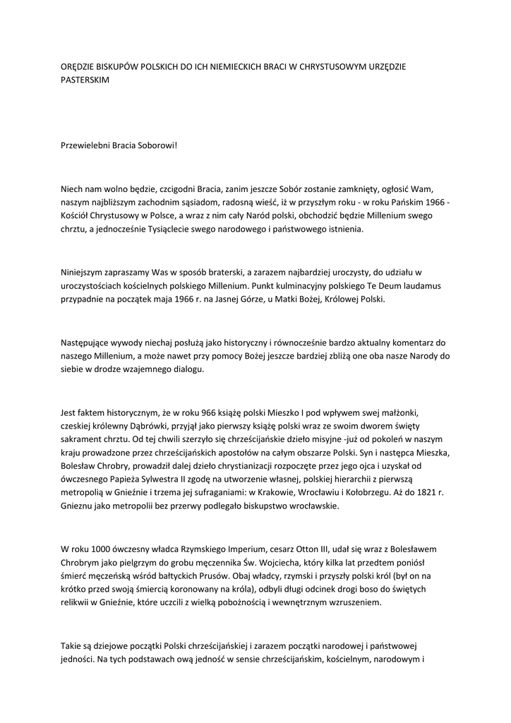 ORĘDZIE BISKUPÓW POLSKICH DO ICH NIEMIECKICH BRACI W CHRYSTUSOWYM URZĘDZIE PASTERSKIM Przewielebni Bracia Soborowi! Niech nam wolno będzie, czcigodni Bracia, zanim jeszcze Sobór zostanie zamknięty, ogłosić Wam, naszym najbliższym zachodnim sąsiadom, radosną wieść, iż w przyszłym roku - w roku Pańskim 1966 Kościół Chrystusowy w Polsce, a wraz z nim cały Naród polski, obchodzić będzie Millenium swego chrztu, a jednocześnie Tysiąclecie swego narodowego i państwowego istnienia. Niniejszym zapraszamy Was w sposób braterski, a zarazem najbardziej uroczysty, do udziału w uroczystościach kościelnych polskiego Millenium. Punkt kulminacyjny polskiego Te Deum laudamus przypadnie na początek maja 1966 r. na Jasnej Górze, u Matki Bożej, Królowej Polski. Następujące wywody niechaj posłużą jako historyczny i równocześnie bardzo aktualny komentarz do naszego Millenium, a może nawet przy pomocy Bożej jeszcze bardziej zbliżą one oba nasze Narody do siebie w drodze wzajemnego dialogu. Jest faktem historycznym, że w roku 966 książę polski Mieszko I pod wpływem swej małżonki, czeskiej królewny Dąbrówki, przyjął jako pierwszy książę polski wraz ze swoim dworem święty sakrament chrztu. Od tej chwili szerzyło się chrześcijańskie dzieło misyjne -już od pokoleń w naszym kraju prowadzone przez chrześcijańskich apostołów na całym obszarze Polski. Syn i następca Mieszka, Bolesław Chrobry, prowadził dalej dzieło chrystianizacji rozpoczęte przez jego ojca i uzyskał od ówczesnego Papieża Sylwestra II zgodę na utworzenie własnej, polskiej hierarchii z pierwszą metropolią w Gnieźnie i trzema jej sufraganiami: w Krakowie, Wrocławiu i Kołobrzegu. Aż do 1821 r. Gnieznu jako metropolii bez przerwy podlegało biskupstwo wrocławskie. W roku 1000 ówczesny władca Rzymskiego Imperium, cesarz Otton III, udał się wraz z Bolesławem Chrobrym jako pielgrzym do grobu męczennika Św. Wojciecha, który kilka lat przedtem poniósł śmierć męczeńską wśród bałtyckich Prusów. Obaj władcy, rzymski i przyszły polski król (był on na krótko przed swoją śmiercią koronowany na króla), odbyli długi odcinek drogi boso do świętych relikwii w Gnieźnie, które uczcili z wielką pobożnością i wewnętrznym wzruszeniem. Takie są dziejowe początki Polski chrześcijańskiej i zarazem początki narodowej i państwowej jedności. Na tych podstawach ową jedność w sensie chrześcijańskim, kościelnym, narodowym i zarazem państwowym, poprzez wszystkie pokolenia rozbudowywali dalej władcy, królowie, biskupi i kapłani przez 1000 lat. Symbioza chrześcijańska Kościoła i państwa istniała w Polsce od początku i nigdy właściwie nie uległa zerwaniu. Doprowadziło to z czasem do powszechnego niemal wśród Polaków sposobu myślenia: co „polskie", to i „katolickie". Z niego to zrodził się także polski styl religijny, w którym od początku czynnik religijny jest ściśle spleciony i zrośnięty z czynnikiem narodowym, z wszystkimi pozytywnymi, ale również i negatywnymi stronami tego problemu. Do tego religijnego stylu życia należy również od dawien dawna -jako główny jego wyraz - polski kult maryjny. Najstarsze polskie kościoły poświęcone są Matce Boskiej (między innymi również gnieźnieńska katedra metropolitalna); najstarszą polską pieśnią, można powiedzieć „kołysanką Narodu polskiego", jest do dziś śpiewana pieśń maryjna „Bogurodzica Dziewica, Bogiem sławiona Maryja". Tradycja wiąże jej powstanie ze Św. Wojciechem, podobnie jak legenda łączy polskie białe orły z gnieźnieńskim gniazdem. Takie i tym podobne tradycje i legendy ludowe, które oplatają jak powój wydarzenia dziejowe, splotły tak ściśle ze sobą czynnik narodowy i chrześcijański, że nie da się ich po prostu bez szkody od siebie oddzielić. One to właśnie naświetlają, a nawet w dużej mierze nadają swe piętno całym późniejszym dziejom polskiej kultury, całemu rozwojowi narodowemu i kulturalnemu. Najnowsza historiografia niemiecka nadaje naszym początkom następujące polityczne i kulturalne znaczenie: „Przez zetknięcie się z imperium Ottona Wielkiego przed tysiącem lat Polska weszła do łacińskiej społeczności chrześcijańskiej, a dzięki podziwu godnej zręczności politycznej Mieszka I, a następnie Bolesława Chrobrego, Polska stała się równouprawnionym członkiem imperium Ottona III, imperium opartego na uniwersalnej koncepcji - objęcia całego niebizantyjskiego świata, przez co wniosła decydujący wkład do ukształtowania się Europy wschodniej". Tym samym dano podstawą i stworzono warunki do przyszłych owocnych stosunków niemiecko-polskich oraz do szerzenia kultury zachodniej. Niestety, w późniejszym toku dziejów stosunki niemiecko-polskie nie zawsze pozostały owocne, a w ostatnich stuleciach przekształciły się w swego rodzaju dziedziczną wrogość sąsiedzką, o czym będzie mowa później. Związanie nowego polskiego królestwa z Zachodem, i to w oparciu o papiestwo, któremu królowie polscy stale oddawali się do dyspozycji, spowodowało w średniowieczu żywą po każdym względem i nad wyraz bogatą wymianę między Polską i narodami zachodnimi, szczególnie z krajami południowoniemieckimi, ale również i z Burgundią, Flandrią, Włochami, a później z Austrią, Francją oraz morskimi państwami okresu Odrodzenia. Przy czym, naturalnie, Polska, jako młodszy twór państwowy najmłodszy wśród starszych braci chrześcijańskiej Europy - początkowo była stroną bardziej biorącą niż dającą. Pomiędzy Kaliszem i Krakowem, królewską stolicą w średniowieczu, a Bambergią, Spirą, Moguncją, Pragą, Paryżem, Kolonią, Lyonem, Clairvaux i Gandawą dokonywała się nie tylko wymiana towarów. Z Zachodu przybywali benedyktyni, cystersi, a później zakony żebracze, i natychmiast osiągali w Polsce, kraju dopiero co zdobytym dla chrześcijaństwa, wspan