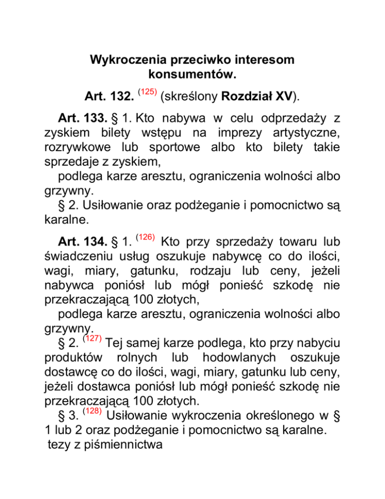 Wykroczenia przeciwko interesom konsumentów. Art. 132. (125) (skreślony Rozdział XV). Art. 133. § 1. Kto nabywa w celu odprzedaży z zyskiem bilety wstępu na imprezy artystyczne, rozrywkowe lub sportowe albo kto bilety takie sprzedaje z zyskiem, podlega karze aresztu, ograniczenia wolności albo grzywny. § 2. Usiłowanie oraz podżeganie i pomocnictwo są karalne. Art. 134. § 1. (126) Kto przy sprzedaży towaru lub świadczeniu usług oszukuje nabywcę co do ilości, wagi, miary, gatunku, rodzaju lub ceny, jeżeli nabywca poniósł lub mógł ponieść szkodę nie przekraczającą 100 złotych, podlega karze aresztu, ograniczenia wolności albo grzywny. § 2. (127) Tej samej karze podlega, kto przy nabyciu produktów rolnych lub hodowlanych oszukuje dostawcę co do ilości, wagi, miary, gatunku lub ceny, jeżeli dostawca poniósł lub mógł ponieść szkodę nie przekraczającą 100 złotych. § 3. (128) Usiłowanie wykroczenia określonego w § 1 lub 2 oraz podżeganie i pomocnictwo są karalne. tezy z piśmiennictwa Art. 135. (129) Kto, zajmując się sprzedażą towarów w przedsiębiorstwie handlu detalicznego lub w przedsiębiorstwie gastronomicznym, ukrywa przed nabywcą towar przeznaczony do sprzedaży lub umyślnie bez uzasadnionej przyczyny odmawia sprzedaży takiego towaru, podlega karze grzywny. orzeczenia sądów Art. 136. § 1. (130) Kto z towarów przeznaczonych do sprzedaży umyślnie usuwa utrwalone na nich oznaczenie określające ich cenę, termin przydatności do spożycia lub datę produkcji, jakość lub ilość nominalną, gatunek lub pochodzenie, podlega karze aresztu, ograniczenia wolności albo grzywny. § 2. Kto przeznacza do sprzedaży towary z usuniętym trwałym oznaczeniem ich ceny, terminu przydatności do spożycia lub daty produkcji, jakości, gatunku lub pochodzenia albo towary niewłaściwie oznaczone, podlega karze ograniczenia wolności albo grzywny do 1.500 złotych. § 3. Usiłowanie wykroczenia określonego w § 1 oraz podżeganie do niego i pomocnictwo są karalne. tezy z piśmiennictwa projekty ustaw Art. 137. § 1. (131) Kto w przedsiębiorstwie handlowym lub usługowym narusza przepisy o obowiązku uwidaczniania cen lub ilości nominalnej, podlega karze grzywny do 1.500 złotych albo karze nagany. § 2. (132) Kierownik punktu sprzedaży detalicznej lub zakładu gastronomicznego, który nie ma faktur albo innych dowodów dostawy lub przyjęcia na towary przechowywane w punkcie sprzedaży detalicznej lub zakładzie gastronomicznym, podlega karze aresztu albo grzywny. Art. 138. Kto, zajmując się zawodowo świadczeniem usług, żąda i pobiera za świadczenie zapłatę wyższą od obowiązującej albo umyślnie bez uzasadnionej przyczyny odmawia świadczenia, do którego jest obowiązany, podlega karze grzywny. Art. 138a. (133) § 1. Kto, zawierając umowę poza lokalem przedsiębiorstwa, nie okazuje konsumentowi dokumentu potwierdzającego prowadzenie działalności gospodarczej oraz dokumentu tożsamości, podlega karze grzywny. § 2. Tej samej karze podlega, kto zawierając umowę w cudzym imieniu poza lokalem przedsiębiorstwa, nie okazuje ponadto dokumentu potwierdzającego swoje umocowanie. projekty ustaw Art. 138b. (134) § 1. Kto, będąc zobowiązany na mocy orzeczenia sądu do zaniechania wykorzystywania lub do odwołania zalecenia stosowania ogólnych warunków umów albo wzoru umowy, nie stosuje się do tego obowiązku, zawierając w umowie niedozwolone postanowienia umowne, podlega karze grzywny. § 2. Jeżeli orzeczenie sądu, o którym mowa w § 1, dotyczy przedsiębiorcy nie będącego osobą fizyczną, odpowiedzialność przewidzianą w § 1 ponosi osoba kierująca przedsiębiorstwem lub osoba upoważniona do zawierania umów z konsumentami. Art. 138c. (135) § 1. Kto w zakresie działalności swojego przedsiębiorstwa zawiera z konsumentem umowę o kredyt konsumencki z rażącym naruszeniem wymagań dotyczących treści umowy albo z pominięciem obowiązku doręczenia jej dokumentu, podlega karze grzywny. § 2. (136) Tej samej karze podlega, kto w ofertach i reklamach dotyczących kredytu konsumenckiego zawierających jakiekolwiek dane dotyczące kosztu kredytu konsumenckiego, nie podaje rzeczywistej rocznej stopy oprocentowania. § 3. Kto przyjmuje od konsumenta weksel lub czek niezawierający klauzuli "nie na zlecenie" w celu spełnienia lub zabezpieczenia świadczenia wynikającego z umowy o kredyt konsumencki, podlega karze grzywny. § 4. Jeżeli przedsiębiorcą jest podmiot niebędący osobą fizyczną, odpowiedzialność przewidzianą w przepisach § 1-3 ponosi osoba kierująca przedsiębiorstwem lub osoba upoważniona do zawierania umów z konsumentami. tezy z piśmiennictwa Art. 139. (137) (skreślony).