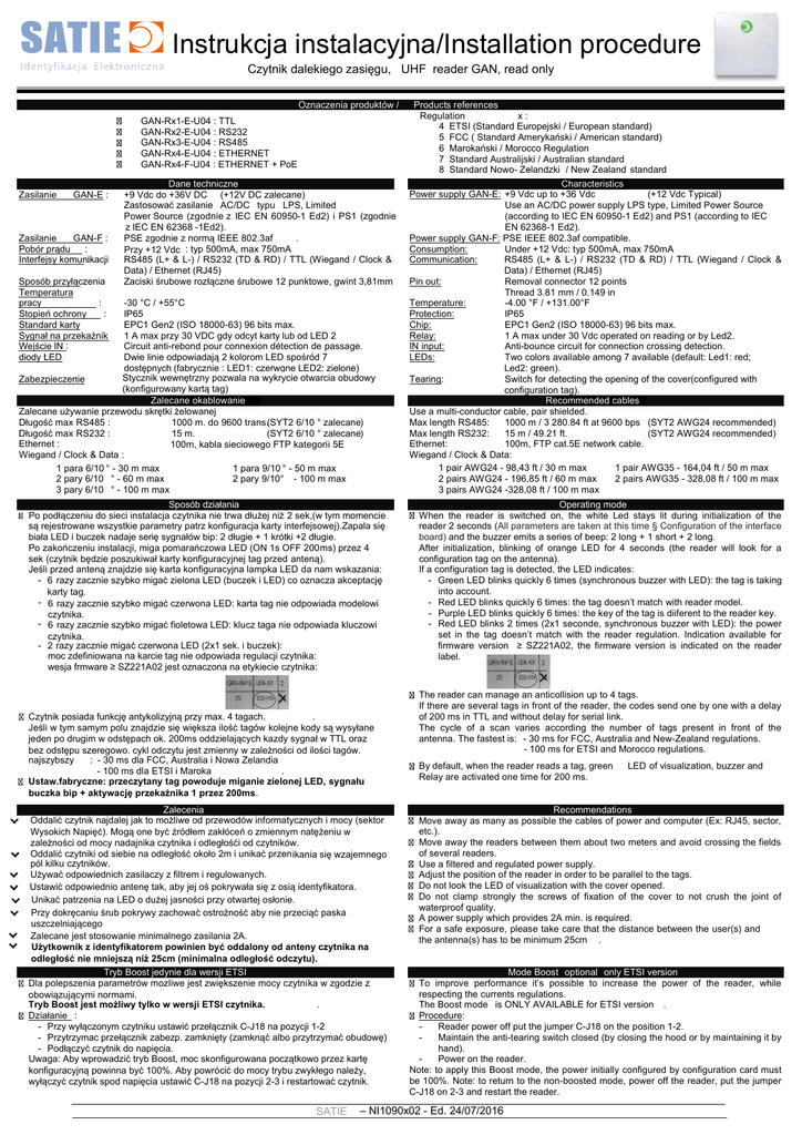 Instrukcja instalacyjna/Installation procedure Czytnik dalekiego zasięgu, UHF reader GAN, read only Oznaczenia produktów / Products references Regulation x: 4 ETSI (Standard Europejski / European standard) 5 FCC ( Standard Amerykański / American standard) 6 Marokański / Morocco Regulation 7 Standard Australijski / Australian standard / New Zealand standard Oznaczenia produktów 8 Standard Nowo- Zelandzki Dane techniczne Characteristics Power supply GAN-E: +9 Vdc up to +36 Vdc (+12 Vdc Typical) Zasilanie GAN-E : +9 Vdc do +36V DC (+12V DC zalecane) Zastosować zasilanie AC/DC typu LPS, Limited Use an AC/DC power supply LPS type, Limited Power Source Power Source (zgodnie z IEC EN 60950-1 Ed2) i PS1 (zgodnie (according to IEC EN 60950-1 Ed2) and PS1 (according to IEC z IEC EN 62368 -1Ed2). EN 62368-1 Ed2). Power supply GAN-F: PSE IEEE 802.3af compatible. Zasilanie GAN-F : PSE zgodnie z normą IEEE 802.3af . Pobór prądu : Consumption: Under +12 Vdc: typ 500mA, max 750mA Przy +12 Vdc : typ 500mA, max 750mA Interfejsy komunikacji : RS485 (L+ & L-) / RS232 (TD & RD) / TTL (Wiegand / Clock & Communication: RS485 (L+ & L-) / RS232 (TD & RD) / TTL (Wiegand / Clock & Data) / Ethernet (RJ45) Data) / Ethernet (RJ45) Sposób przyłączenia : Zaciski śrubowe rozłączne śrubowe 12 punktowe, gwint 3,81mm Pin out: Removal connector 12 points Temperatura Thread 3.81 mm / 0.149 in Temperature: -4.00 °F / +131.00°F pracy : -30 °C / +55°C Stopień ochrony : IP65 Protection: IP65 Standard karty EPC1 Gen2 (ISO 18000-63) 96 bits max. Chip: EPC1 Gen2 (ISO 18000-63) 96 bits max. Sygnał na przekaźnik 1 A max przy 30 VDC gdy odcyt karty lub od LED 2 Relay: 1 A max under 30 Vdc operated on reading or by Led2. Wejście IN : Circuit anti-rebond pour connexion détection de passage. IN input: Anti-bounce circuit for connection crossing detection. diody LED : Dwie linie odpowiadają 2 kolorom LED spośród 7 LEDs: Two colors available among 7 available (default: Led1: red; dostępnych (fabrycznie : LED1: czerwone ; LED2: zielone) Led2: green). Stycznik wewnętrzny pozwala na wykrycie otwarcia obudowy Zabezpieczenie : Tearing: Switch for detecting the opening of the cover(configured with (konfigurowany kartą tag) configuration tag). Zalecane okablowanie Recommended cables Zalecane używanie przewodu skrętki żelowanej Use a multi-conductor cable, pair shielded. Długość max RS485 : 1000 m. do 9600 trans.(SYT2 6/10 ° zalecane) Max length RS485: 1000 m / 3 280.84 ft at 9600 bps (SYT2 AWG24 recommended) Długość max RS232 : 15 m. (SYT2 6/10 ° zalecane) Max length RS232: 15 m / 49.21 ft. (SYT2 AWG24 recommended) Ethernet : . Ethernet: 100m, FTP cat.5E network cable. 100m, kabla sieciowego FTP kategorii 5E Wiegand / Clock & Data : Wiegand / Clock & Data: 1 pair AWG24 - 98,43 ft / 30 m max 1 pair AWG35 - 164,04 ft / 50 m max 1 para 6/10 ° - 30 m max 1 para 9/10 ° - 50 m max 2 pairs AWG24 - 196,85 ft / 60 m max 2 pairs AWG35 - 328,08 ft / 100 m max 2 pary 6/10 ° - 60 m max 2 pary 9/10° - 100 m max 3 pairs AWG24 -328,08 ft / 100 m max 3 pary 6/10 ° - 100 m max GAN-Rx1-E-U04 : TTL GAN-Rx2-E-U04 : RS232 GAN-Rx3-E-U04 : RS485 GAN-Rx4-E-U04 : ETHERNET GAN-Rx4-F-U04 : ETHERNET + PoE Sposób działania Po podłączeniu do sieci instalacja czytnika nie trwa dłużej niż 2 sek,(w tym momencie są rejestrowane wszystkie parametry patrz konfiguracja karty interfejsowej).Zapala się biała LED i buczek nadaje serię sygnałów bip: 2 długie + 1 krótki +2 długie. Po zakończeniu instalacji, miga pomarańczowa LED (ON 1s OFF 200ms) przez 4 sek (czytnik będzie poszukiwał karty konfiguracyjnej tag przed anteną). Jeśli przed anteną znajdzie się karta konfiguracyjna lampka LED da nam wskazania: - 6 razy zacznie szybko migać zielona LED (buczek i LED) co oznacza akceptację karty tag. - 6 razy zacznie szybko migać czerwona LED: karta tag nie odpowiada modelowi czytnika. - 6 razy zacznie szybko migać fioletowa LED: klucz taga nie odpowiada kluczowi czytnika. - 2 razy zacznie migać czerwona LED (2x1 sek. i buczek): moc zdefiniowana na karcie tag nie odpowiada regulacji czytnika: wesja frmware ≥ SZ221A02 jest oznaczona na etykiecie czytnika: Czytnik posiada funkcję antykolizyjną przy max. 4 tagach. . Jeśli w tym samym polu znajdzie się większa ilość tagów kolejne kody są wysyłane jeden po drugim w odstępach ok. 200ms oddzielających kazdy sygnał w TTL oraz . bez odstępu szeregowo. cykl odczytu jest zmienny w zależności od ilości tagów. najszybszy : - 30 ms dla FCC, Australia i Nowa Zelandia - 100 ms dla ETSI i Maroka . Ustaw.fabryczne: przeczytany tag powoduje miganie zielonej LED, sygnału buczka bip + aktywację przekaźnika 1 przez 200ms. Zalecenia Oddalić czytnik najdalej jak to możliwe od przewodów informatycznych i mocy (sektor Wysokich Napięć). Mogą one być źródłem zakłóceń o zmiennym natężeniu w zależności od mocy nadajnika czytnika i odległośći od czytników. Oddalić czytniki od siebie na odległość około 2m i unikać przen ikania się wzajemnego pól kilku czytników. Używać odpowiednich zasilaczy z filtrem i regulowanych. Ustawić odpowiednio antenę tak, aby jej oś pokrywała się z osią identyfikatora. Unikać patrzenia na LED o dużej jasności przy otwartej osłonie. Przy dokręcaniu śrub pokrywy zachować ostrożność aby nie przeciąć paska uszczelniającego Zalecane jest stosowanie minimalnego zasilania 2A. Użytkownik z identyfikatorem powinien być oddalony od anteny czytnika na odległość nie mniejszą niż 25cm (minimalna odległość odczytu). Tryb Boost jedynie dla wersji ETSI Dla polepszenia parametrów mozliwe jest zwiększenie mocy czytnika w zgodzie z obowiązującymi normami. Tryb Boost jest możliwy tylko w wersji ETSI czytnika. . Działanie : - Przy wyłączonym czytniku ustawić przełącznik C-J18 na pozycji 1-2 - Przytrzymac przełącznik zabezp. zamknięty (zamknąć albo przytrzymać obudowę) - Podłączyć czytnik do na
