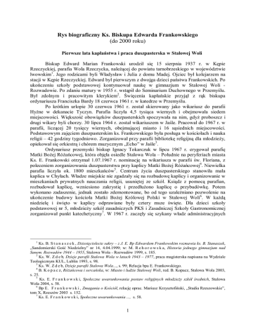 Rys biograficzny Ks. Biskupa Edwarda Frankowskiego (do 2000 roku) Pierwsze lata kapłaństwa i praca duszpasterska w Stalowej Woli Biskup Edward Marian Frankowski urodził się 15 sierpnia 1937 r. w Kępie Rzeczyckiej, parafia Wola Rzeczycka, należącej do powiatu tarnobrzeskiego w województwie lwowskim1. Jego rodzicami byli Władysław i Julia z domu Madej. Ojciec był kolejarzem na stacji w Kępie Rzeczyckiej. Edward był pierwszym z dwojga dzieci państwa Frankowskich. Po ukończeniu szkoły podstawowej kontynuował naukę w gimnazjum w Stalowej Woli Rozwadowie. Po zdaniu matury w 1955 r. wstąpił do Seminarium Duchownego w Przemyślu. Był zdolnym i pracowitym klerykiem2. Święcenia kapłańskie przyjął z rąk biskupa ordynariusza Franciszka Bardy 18 czerwca 1961 r. w katedrze w Przemyślu. Po krótkim urlopie 30 czerwca 1961 r. został skierowany jako wikariusz do parafii Hyżne w dekanacie Tyczyn. Parafia liczyła 4,5 tysiąca wiernych i obejmowała siedem miejscowości. Większość obowiązków duszpasterskich spoczywała na nim, gdyż proboszcz i drugi wikary byli chorzy. 30 lipca 1964 r. został wikariuszem w Jaśle. Pracował do 1967 r. w parafii, liczącej 20 tysięcy wiernych, obejmującej miasto i 16 sąsiednich miejscowości. Podstawowym zajęciem duszpasterskim ks. Frankowskiego była posługa w kościołach i nauka religii – 42 godziny tygodniowo. Zorganizował przy parafii bibliotekę religijną dla młodzieży, opiekował się orkiestrą i chórem muzycznym „Echo” w Jaśle3. Ordynariusz przemyski biskup Ignacy Tokarczuk w lipcu 1967 r. erygował parafię Matki Bożej Różańcowej, która objęła osiedle Stalowa Wola – Południe na peryferiach miasta Ks. E. Frankowski otrzymał 1.07.1967 r. nominację na wikariusza w parafii św. Floriana, z poleceniem zorganizowania duszpasterstwa przy kaplicy Matki Bożej Różańcowej4. Niewielka parafia liczyła ok. 1800 mieszkańców5. Centrum życia duszpasterskiego stanowiła mała kaplica w Chyłach. Władze miejskie nie zgadzały się na rozbudowę kaplicy i organizowanie w mieszkaniach prywatnych nauczania religii, usuniętej ze szkół. Ksiądz z pomocą parafian, rozbudował kaplicę, wzniesiono zakrystię i przedłużono kaplicę o przybudówkę. Potem wykonano zadaszenie, jednak zostało zdemontowane, bo od tego uzależniano pozwolenie na ukończenie budowy kościoła Matki Bożej Królowej Polski w Stalowej Woli6. W każdą niedzielę i święto w kaplicy odprawiane były cztery msze święte. Dla dzieci szkoły podstawowej nr 5, młodzieży szkół zasadniczych PKS i Zasadniczej Szkoły Gastronomicznej zorganizował punkt katechetyczny7. W 1967 r. zaczęły się szykany władz administracyjnych 1 Ks. B. S t a n a s z e k , Dziesięciolecie sakry – z J. E. Bp Edwardem Frankowskim rozmawia ks. B. Stanaszek, „Sandomierski Gość Niedzielny” nr 14, 4.04.1999; w: M. R e h o r o w s k a, Historia jednego gimnazjum nad Sanem. Rozwadów 1944 – 1955, Stalowa Wola - Rozwadów 1999, s. 185. 2 Ks. W. Z d e b, Dzieje parafii Stalowa Wola w latach 1943 – 1977, praca magisterska napisana na Wydziale Teologicznym KUL, Lublin 1993, s. 98. 3 Ks. W. Z d e b, Dzieje parafii Stalowa Wola..., s. 99; Relacja bpa E. Frankowskiego. 4 B. K o p a c z, Różańcowa i sercańska, w: Miasto i ludzie Stalowej Woli, red. B. Kopacz, Stalowa Wola 2003, s. 25. 5 Ks. E. F r a n k o w s k i, Społeczne uwarunkowania postaw religijnych młodzieży szkół średnich, Stalowa Wola 2004, s. 58. 6 Bp E. F r a n k o w s k i , Zmagania o Kościół, relację oprac. Mariusz Krzysztofiński, „Studia Rzeszowskie”, tom X, Rzeszów 2003 s. 152. 7 Ks. E. F r a n k o w s k i, Społeczne uwarunkowania ..., s. 58. 1 wobec ks. Edwarda Frankowskiego, późniejszego „najuciążliwszego dla komunistów proboszcza stalowowolskiego i biskupa sufragana”8. 12 listopada 1970 r. biskup diecezji mianował ks. E. Frankowskiego rektorem kaplicy Matki Bożej Różańcowej w Chyłach9. Ks. proboszcz założył w 1970 r. dom Sióstr Służebniczek Dębickich w parafii. Opiekował się dużą grupą ministrantów, troszczył się o ewangelizację licznych rodzin Cyganów, mieszkających w drewnianych barakach. Wielu Romom udzielił sakramentów chrztu, bierzmowania i komunii świętej. Dzięki jego staraniom 12 par małżeńskich Cyganów zawarło sakrament małżeństwa. Organizował zespoły instrumentalne, wokalne i recytatorskie, a dla młodzieży spotkania dyskusyjne i imprezy10. W maju 1971 r. zorganizował w parafii uroczystość nawiedzenia kopii obrazu Matki Bożej Częstochowskiej, w symbolach świecy i Ewangelii. Obraz, peregrynujący po parafiach, był przez władze uwięziony na Jasnej Górze11. Jednocześnie z pracą duszpasterską w parafii ks. E. Frankowski w latach 1967 – 1972 podjął zaoczne studia teologiczno–pastoralne na Wydziale Teologicznym Katolickiego Uniwersytetu Lubelskiego, uzyskując tytuł magistra teologii. Przeprowadził pierwsze badania socjologiczne postaw religijnych młodzieży w Stalowej Woli. Pracę magisterską „Społeczne uwarunkowania postaw religijnych młodzieży szkół średnich. Studium socjologiczne na podstawie badań ankietowych wśród młodzieży szkolnej w Stalowej Woli” obronioną na KUL w 1971 r., napisał na seminarium socjologii religii pod kierunkiem ks. doc. dr hab. Józefa Majki. W latach 1971-1975 studiował w Instytucie Pastoralnym KUL i odbył kurs doktorancki. Po rocznym urlopie doktoranckim, 16 sierpnia 1975 r. ks. E. Frankowski został mianowany proboszczem parafii św. Floriana w Stalowej Woli. Praca w parafii św. Floriana prowadzona była w trudnych warunkach, obejmowała duże dzielnice miasta, z rosnącą ilością mieszkańców. Na terenie parafii był mały, drewniany, zabytkowy kościółek św. Floriana oraz kościół Matki Bożej Królowej Polski w budowie. Kościół wzniesiony w stanie surowym, był konsekrowany przez kardynała Karola Wojtyłę 2 grudnia 1973 r. Podczas