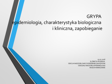 GRYPA epidemiologia, charakterystyka biologiczna i kliniczna, zapobieganie 03.02.2016 ELŻBIETA PŁOŃSKA SEKCJA NADZORU NAD CHOROBAMI ZAKAŹNYMI ODDZIAŁ NADZORU EPIDEMIOLOGII WSSE W WARSZAWIE Właściwości biologiczne wirusa grypy A i jego budowa antygenowa Wirus z rodziny Orthomyxoviridae Zawiera genom (materiał genetyczny) złożony z pojedynczej nici RNA (wysoko podatnej na błędy w replikacji wirusa („namnażaniu”) - Kapsyd (otoczka) okalający RNA jest dwuwarstwowy - Warstwa zewnętrzna = lipidowa ma 2 antygeny powierzchniowe H - hemaglutynina - odpowiada za wiązanie wirusa z receptorem czyli wnikanie wirusa do komórek dróg oddechowych N – neuraminidaza – pośredniczy w uwolnieniu nowoutworzonego wirusa grypy z komórek dróg oddechowych. Ortho – z gr. prawdziwy; myxo – w jęz. gr. śluz (co podkreśla zdolność wirusa do wiązania się z mukoproteinami komórek układu oddechowego) Elżbieta Płońska NZC Epidemiologia WSSE w Warszawie Wirusy grypy dzielimy na Typ A – zakaża ludzi i inne gatunki ssaków (świnie, konie, norki, ssaki morskie) oraz ptaki domowe i dzikie. U ludzi powoduje coroczne zachorowania sporadyczne lub epidemiczne, a co 20-40 lat pandemie. Typ B – zakaża wyłącznie ludzi, wywołując zachorowania sporadyczne, a co 2-3 lata także epidemie, Typ C – wywołuje sporadyczne zachorowania u ludzi. Zakażenia wywołuje przede wszystkim u świń. Elżbieta Płońska NZC Epidemiologia WSSE w Warszawie Elżbieta Płońska NZC Epidemiologia WSSE w Warszawie Szczególna cecha wirusa grypy typu A Wirus o umiejętności zmiany antygenów co umożliwia przełamywanie barier gatunkowych 1. Przesunięcia antygenowe = mutacje punktowe w RNA (antigenic drift) powodują powstawanie nowych wariantów antygenowych (H, N). Najczęściej zdarzają się w wirusach grypy ludzkiej, rzadko świń, sporadycznie ptaków (jako przykład – sytuacja, gdy wirus z ptaków dzikich przedostaje się do drobiu domowego). 2. Wymiana (reasortacja) genowa = skok antygenowy („antigenic shift”) to wymiana segmentów RNA kodujących antygeny H, N. Proces ten rozpoczyna się, gdy jedna komórka gospodarza zostaje zakażona równocześnie ≥ 2 różnymi szczepami wirusa grypy. Skutkuje to powstaniem nowego szczepu lub podtypu, zwykle o zwiększonej zjadliwości. Elżbieta Płońska NZC Epidemiologia WSSE w Warszawie Podtypy wirusa grypy A Na podstawie swoistości antygenowej H i N oraz ich kombinacji wyróżnia się ponad 140 podtypów wirusów grypy A. Stwierdza się występowanie 9 rodzajów antygenu N (1 – 9) oraz 16 rodzajów antygenu H (1 – 16). Zachorowania sezonowe u ludzi wywołują głównie 3 podtypy wirusa grypy A – H3N2, H2N1 i H1N1 – powodujące typowe objawy grypowe i względnie niewielką śmiertelność szacowaną na mniej niż 0,5%. W sezonie 2015/2016 w Polsce i na świecie u ludzi dominuje A(H1N1)pdm09 oraz A(H3N2) Elżbieta Płońska NZC Epidemiologia WSSE w Warszawie Charakterystyka grypy wywołanej wirusem A Szerzy się drogą kropelkową i powietrzną Jest zaraźliwa (głównie w okresie objawowym) Zakaźność dla otoczenia – osoby dorosłe zarażają przez ok. 5 dni, dzieci – zwykle ok. 7 – 10 dni od początku objawów (zwykle do 3 dni po ustąpieniu gorączki). Możliwe jest przeniesienie zakażenia przez bezpośredni kontakt z wydzielinami z dróg oddechowych osób zarażonych, znajdującymi się na ich dłoniach lub powierzchniach w ich otoczeniu Nie ma doniesień o możliwościach przenoszenia zakażenia przez żywność lub wodę Elżbieta Płońska NZC Epidemiologia WSSE w Warszawie Czas przeżywalności wirusa grypy w środowisku (w temp. 28 °C gdy wilgotność wynosi ok.40% ) o Powierzchnie twarde, gładkie – do 48 godzin o Plastik, stal – wykrywalne > 24 godz., o Papier, ubrania, chusteczki higieniczne – wykrywalne przez 8 – 12 godz., o Ręce – do 15 minut. Elżbieta Płońska NZC Epidemiologia WSSE w Warszawie Objawy kliniczne grypy Nagłe pojawienie się objawów Gorączka najczęściej wysoka, ale ok. 12% zakażonych bez gorączki Dreszcze Bóle mięśniowe i stawowe Ból głowy, ból gardła Kaszel, katar W ok. 25-30% przypadków wymioty i biegunka częściej u dzieci i młodzieży Większość zachorowań przebiega łagodnie lub średnio-ciężko, a choroba ustępuje samoistnie po 5 – 7 dniach. Bardzo rzadko powikłania – śródmiąższowe zapalenia płuc, ostra niewydolność oddechowa, zgon. Najwięcej zachorowań wśród dzieci i młodzieży do 14 r. ż., rzadziej chorują osoby >60 r. ż. Przebieg kliniczny grypy A(H1N1)pdm09 jest identyczny jak w grypie sezonowej– wirus namnaża się w komórkach nabłonka dróg oddechowych, nie powoduje wiremii, objawy choroby to wynik działania cytokin zapalnych. Elżbieta Płońska NZC Epidemiologia WSSE w Warszawie Cięższy przebieg zachorowań na grypę obserwuje się u osób należących do grup Chorujących na choroby przewlekłe ryzyka układu oddechowego sercowo – naczyniowego nerek lub wątroby, układu nerwowego i nerwowo – mięśniowego choroby metaboliczne (np. cukrzyca) wrodzony lub nabyty niedobór odporności inne choroby upośledzające czynność układu immunologicznego Otyłych (ryzyko 6-krotnie większe) Dzieci do 2 r. ż (zwłaszcza niemowlęta) Kobiet w ciąży (zwłaszcza drugim i trzecim trymestrze) Elżbieta Płońska NZC Epidemiologia WSSE w Warszawie Nadzór epidemiologiczny i statystyka dotycząca podejrzeń i zachorowań na grypę w Polsce i w województwie mazowieckim 1. 2. 3. 4. Nadzór bierny - cotygodniowe meldunki MZ-55 (o liczbie zachorowań oraz podejrzeń zachorowań na grypę wg wieku chorych) przekazywane z placówek ambulatoryjnej opieki zdrowotnej do PSSE a liczbowe dane zbiorcze są przekazywane do WSSE. Dane z województwa przekazywane cotygodniowo do NIZP-PZH, są publikowane na stronie www.pzh.gov.pl zakładka meldunki epidemiologiczne: grypa i podejrzenia zachorowań na grypę * Jednostkowe podejrzenia i zachorow