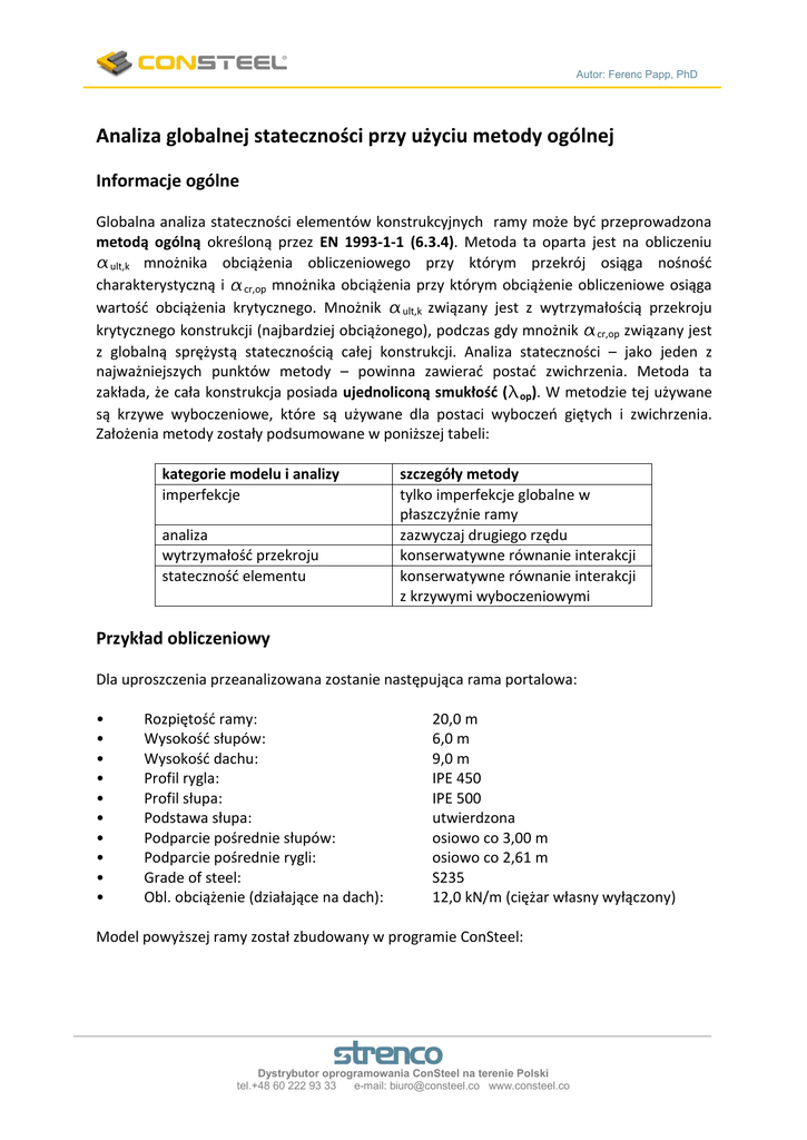 Autor: Ferenc Papp, PhD Analiza globalnej stateczności przy użyciu metody ogólnej Informacje ogólne Globalna analiza stateczności elementów konstrukcyjnych ramy może być przeprowadzona metodą ogólną określoną przez EN 1993-1-1 (6.3.4). Metoda ta oparta jest na obliczeniu ault,k mnożnika obciążenia obliczeniowego przy którym przekrój osiąga nośność charakterystyczną i acr,op mnożnika obciążenia przy którym obciążenie obliczeniowe osiąga wartość obciążenia krytycznego. Mnożnik ault,k związany jest z wytrzymałością przekroju krytycznego konstrukcji (najbardziej obciążonego), podczas gdy mnożnik acr,op związany jest z globalną sprężystą statecznością całej konstrukcji. Analiza stateczności – jako jeden z najważniejszych punktów metody – powinna zawierać postać zwichrzenia. Metoda ta zakłada, że cała konstrukcja posiada ujednoliconą smukłość (lop). W metodzie tej używane są krzywe wyboczeniowe, które są używane dla postaci wyboczeń giętych i zwichrzenia. Założenia metody zostały podsumowane w poniższej tabeli: kategorie modelu i analizy imperfekcje analiza wytrzymałość przekroju stateczność elementu szczegóły metody tylko imperfekcje globalne w płaszczyźnie ramy zazwyczaj drugiego rzędu konserwatywne równanie interakcji konserwatywne równanie interakcji z krzywymi wyboczeniowymi Przykład obliczeniowy Dla uproszczenia przeanalizowana zostanie następująca rama portalowa: • • • • • • • • • • Rozpiętość ramy: Wysokość słupów: Wysokość dachu: Profil rygla: Profil słupa: Podstawa słupa: Podparcie pośrednie słupów: Podparcie pośrednie rygli: Grade of steel: Obl. obciążenie (działające na dach): 20,0 m 6,0 m 9,0 m IPE 450 IPE 500 utwierdzona osiowo co 3,00 m osiowo co 2,61 m S235 12,0 kN/m (ciężar własny wyłączony) Model powyższej ramy został zbudowany w programie ConSteel: Dystrybutor oprogramowania ConSteel na terenie Polski tel.+48 60 222 93 33 e-mail: [email protected] www.consteel.co Autor: Ferenc Papp, PhD Procedura metody ogólnej zawarta jest w następujących 6 krokach: Krok 1 Model konstrukcji został zbudowany w programie ConSteel. Do modelu wbudowano system realistycznych podpór, aby uzyskane wyniki analizy stateczności odzwierciedlały w sposób dokładny zachowanie się konstrukcji. Jako pierwsze zostały przeprowadzone obliczenia wymiarujące przekroje (obliczenia nośności, Krok 2). Krok 2 Następujący widok został wygenerowany w programie ConSteel i przedstawia wykorzystanie wytrzymałości poszczególnych przekrojów (krytyczny przekrój jest zlokalizowany na końcach rygla): Dystrybutor oprogramowania ConSteel na terenie Polski tel.+48 60 222 93 33 e-mail: [email protected] www.consteel.co Autor: Ferenc Papp, PhD Parametry obliczeniowe użyte w konserwatywnym równaniu interakcji są następujące: Dystrybutor oprogramowania ConSteel na terenie Polski tel.+48 60 222 93 33 e-mail: [email protected] www.consteel.co Autor: Ferenc Papp, PhD - Siły obliczeniowe: N Ed = 121,8 kN M y , Ed = 281,2 kNm - Wartości charakterystycznej wytrzymałości dla czystego ściskania i zginania, odpowiednio: N Rk = 2.322 kN M y , Rk = 399,9 kNm - Mnożnik obciążenia wykorzystujący konserwatywne równanie interakcji (EN 1993-1-1 6.3.4 (4)b)): ault,k= 1,323 Krok 3 Zgodnie z metodą ogólną (EN 1993-1-1 6.3.4) mnożnik obciążenia przy którym obciążenie obliczeniowe osiąga wartość obciążenia krytycznego jest równy pierwszej wartości własnej – obliczoną w trakcie globalnej analizy stateczności konstrukcji w stanie sprężystym – która wskazuje na postać wyboczenia zwichrzeniowego (zwichrzenia). W przypadku powyższego przykładu program ConSteel wskazał na następujący wynik: Dystrybutor oprogramowania ConSteel na terenie Polski tel.+48 60 222 93 33 e-mail: [email protected] www.consteel.co Autor: Ferenc Papp, PhD Pierwsza wartość własna, która wskazuje na postać wyboczenia zwichrzeniowego jest następująca (EN 1993-1-1 6.3.4 (3)): acr.op = 5,080 Krok 4 Uogólniona smukłość całej konstrukcji może być obliczona w następujący sposób (EN 1993-11 6.3.4 (3)): ̅ √ √ Krok 5 Używając uogólnionej smukłości (Krok 4) współczynniki redukcyjne dla wyboczenia giętnego i zwichrzenia odpowiednio, mogą być obliczone w następujący sposób: - Współczynnik redukcyjny dla wyboczenia giętnego względem osi z-z (EN 1993-1-1 6.3.1): Krzywa “b” ⇒ a = 0,34 [ ( ) ] √ - Współczynnik redukcyjny dla zwichrzenia (EN 1993-1-1 6.3.2): Krzywa “c” ⇒ α LT = 0,49 [ ( ) ] √ Krok 6 Aby wykonać sprawdzenie globalnej stateczności ramy portalowej możemy użyć wzoru metody ogólnej (EN 1993-1-1 6.3.4 (4) b)): Zgodnie z metodą ogólną rama jest odpowiednio zaprojektowana z uwzględnieniem stateczności globalnej. Dystrybutor oprogramowania ConSteel na terenie Polski tel.+48 60 222 93 33 e-mail: [email protected] www.consteel.co Autor: Ferenc Papp, PhD Tłumaczenie: mgr inż. Adam Machowiak Dystrybutor oprogramowania ConSteel na terenie Polski tel.+48 60 222 93 33 e-mail: [email protected] www.consteel.co