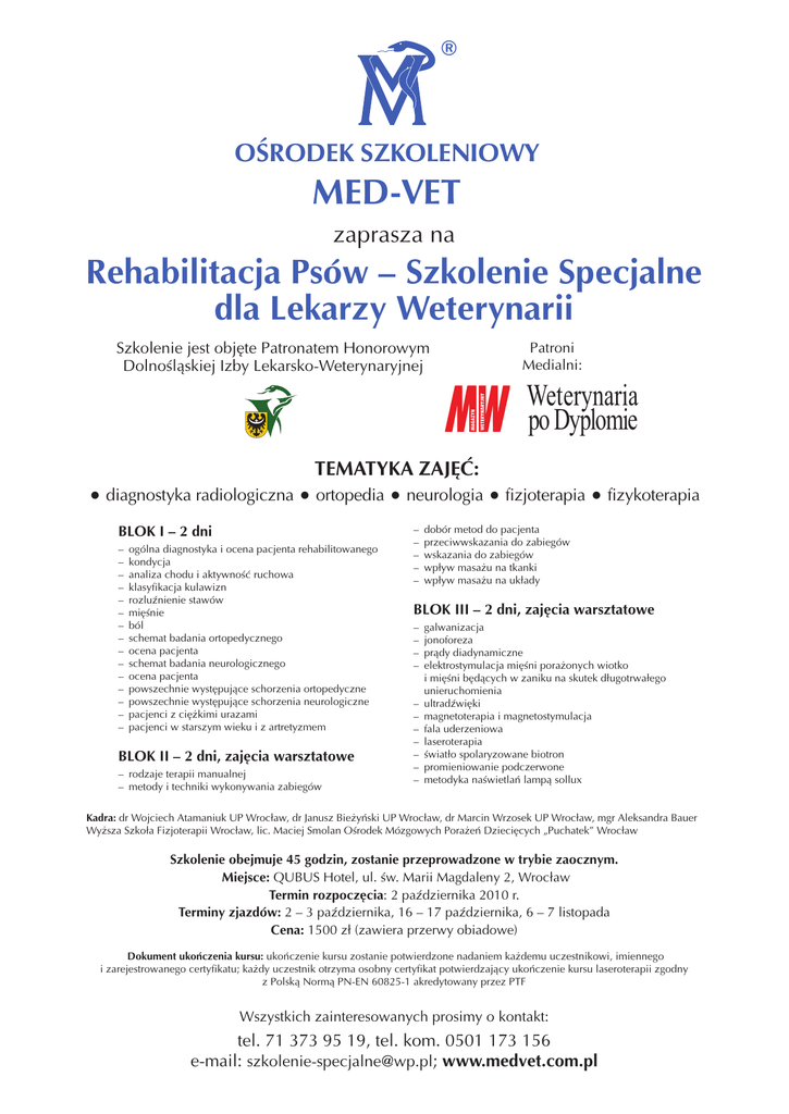 ® OŚRODEK SZKOLENIOWY MED-VET zaprasza na Rehabilitacja Psów – Szkolenie Specjalne dla Lekarzy Weterynarii Szkolenie jest objęte Patronatem Honorowym Dolnośląskiej Izby Lekarsko-Weterynaryjnej Patroni Medialni: Weterynaria po Dyplomie TEMATYKA ZAJĘĆ: diagnostyka radiologiczna ortopedia neurologia fizjoterapia fizykoterapia BLOK I – 2 dni – – – – – – – – – – – – – – – ogólna diagnostyka i ocena pacjenta rehabilitowanego kondycja analiza chodu i aktywność ruchowa klasyfikacja kulawizn rozluźnienie stawów mięśnie ból schemat badania ortopedycznego ocena pacjenta schemat badania neurologicznego ocena pacjenta powszechnie występujące schorzenia ortopedyczne powszechnie występujące schorzenia neurologiczne pacjenci z ciężkimi urazami pacjenci w starszym wieku i z artretyzmem BLOK II – 2 dni, zajęcia warsztatowe – rodzaje terapii manualnej – metody i techniki wykonywania zabiegów – – – – – dobór metod do pacjenta przeciwwskazania do zabiegów wskazania do zabiegów wpływ masażu na tkanki wpływ masażu na układy BLOK III – 2 dni, zajęcia warsztatowe – – – – – – – – – – – galwanizacja jonoforeza prądy diadynamiczne elektrostymulacja mięśni porażonych wiotko i mięśni będących w zaniku na skutek długotrwałego unieruchomienia ultradźwięki magnetoterapia i magnetostymulacja fala uderzeniowa laseroterapia światło spolaryzowane biotron promieniowanie podczerwone metodyka naświetlań lampą sollux Kadra: dr Wojciech Atamaniuk UP Wrocław, dr Janusz Bieżyński UP Wrocław, dr Marcin Wrzosek UP Wrocław, mgr Aleksandra Bauer Wyższa Szkoła Fizjoterapii Wrocław, lic. Maciej Smolan Ośrodek Mózgowych Porażeń Dziecięcych „Puchatek” Wrocław Szkolenie obejmuje 45 godzin, zostanie przeprowadzone w trybie zaocznym. Miejsce: QUBUS Hotel, ul. św. Marii Magdaleny 2, Wrocław Termin rozpoczęcia: 2 października 2010 r. Terminy zjazdów: 2 – 3 października, 16 – 17 października, 6 – 7 listopada Cena: 1500 zł (zawiera przerwy obiadowe) Dokument ukończenia kursu: ukończenie kursu zostanie potwierdzone nadaniem każdemu uczestnikowi, imiennego i zarejestrowanego certyfikatu; każdy uczestnik otrzyma osobny certyfikat potwierdzający ukończenie kursu laseroterapii zgodny z Polską Normą PN-EN 60825-1 akredytowany przez PTF Wszystkich zainteresowanych prosimy o kontakt: tel. 71 373 95 19, tel. kom. 0501 173 156 e-mail: [email protected]; www.medvet.com.pl
