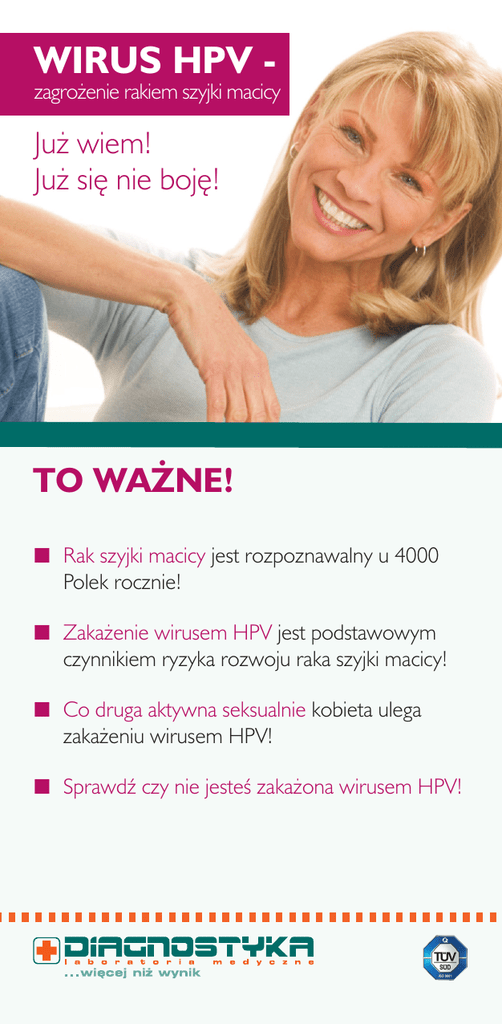 WIRUS HPV - zagrożenie rakiem szyjki macicy Już wiem! Już się nie boję! TO WAŻNE! R ak szyjki macicy jest rozpoznawalny u 4000 Polek rocznie! Zakażenie wirusem HPV jest podstawowym czynnikiem ryzyka rozwoju raka szyjki macicy! Co druga aktywna seksualnie kobieta ulega zakażeniu wirusem HPV! Sprawdź czy nie jesteś zakażona wirusem HPV! WIRUS HPV - dowiedz się więcej! W Polsce rak szyjki macicy jest drugim po raku piersi najczęściej diagnozowanym nowotworem u kobiet. Co roku jest on rozpoznawany u prawie 4000 Polek. Niestety połowa tych kobiet umiera z powodu zbyt późnego wykrycia nowotworu. Najważniejszym czynnikiem chorobotwórczym odpowiedzialnym za rozwój raka szyjki macicy jest zakażenie onkogennymi typami wirusa HPV, przenoszonymi drogą płciową. Pamiętaj! Zakażenie wirusem HPV może przez wiele lat przebiegać bezobjawowo. Kobiety zgłaszają się do lekarza dopiero w bardzo zaawansowanym stadium rozwoju raka, kiedy jest już za późno na podjęcie skutecznego leczenia. Nie czekaj! Wykonaj proste i bezbolesne badane, które umożliwia wykrycie niebezpiecznych typów wirusa HPV. Jest ono doskonałym uzupełnieniem wykonywanych regularnie badań cytologicznych. Metoda PCR - jest to wysoce czuła i swoista metoda identyfikacji mikroorganizmów - wykrywa obecność DNA wirusa a nie przeciwciał wytwarzanych przez organizm człowieka. Metoda ta gwarantuje uzyskanie jednoznacznego wyniku. Nie ryzykuj! Zapytaj swojego lekarza jakie zagrożenie niesie zakażenie wirusem. Zapytaj również o badania diagnostyczne wykonywane najnowocześniejszymi metodami biologii molekularnej. miejsce na pieczątkę Oddziału Uwaga: Informacje zawarte w niniejszej ulotce mają charakter wyłącznie poglądowy oraz edukacyjny i nie mogą stanowić podstawy do podejmowania decyzji dotyczących podjęcia lub niepodjęcia leczenia lub innych procedur medycznych. Interpretacji wyników badań powinien dokonywać lekarz. www.diag.pl
