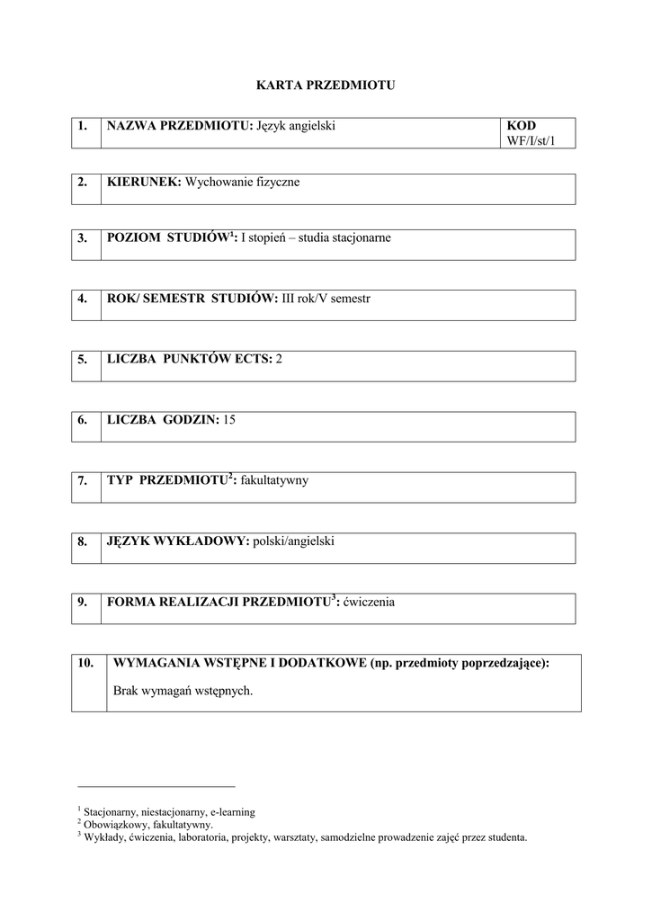 KARTA PRZEDMIOTU 1. NAZWA PRZEDMIOTU: Język angielski 2. KIERUNEK: Wychowanie fizyczne 3. POZIOM STUDIÓW1: I stopień – studia stacjonarne 4. ROK/ SEMESTR STUDIÓW: III rok/V semestr 5. LICZBA PUNKTÓW ECTS: 2 6. LICZBA GODZIN: 15 7. TYP PRZEDMIOTU2: fakultatywny 8. JĘZYK WYKŁADOWY: polski/angielski 9. FORMA REALIZACJI PRZEDMIOTU3: ćwiczenia 10. KOD WF/I/st/1 WYMAGANIA WSTĘPNE I DODATKOWE (np. przedmioty poprzedzające): Brak wymagań wstępnych. 1 Stacjonarny, niestacjonarny, e-learning Obowiązkowy, fakultatywny. 3 Wykłady, ćwiczenia, laboratoria, projekty, warsztaty, samodzielne prowadzenie zajęć przez studenta. 2 11. CEL PRZEDMIOTU: Opanowanie umiejętności językowych zgodnie z wymaganiami dla poziomu B2 Europejskiego Systemu Opisu Kształcenia Językowego oraz opanowanie słownictwa specjalistycznego w zakresie wychowania fizycznego i sportu. 12. PRZEDMIOTOWE EFEKTY KSZTAŁCENIA4 P_U01. Student umożliwiające szczegółowych umiejętności posiada wykorzystanie oraz pytań o Odniesienie do kierunkowych efektów kształcenia (symbol) Odniesienie do obszarowych efektów kształcenia i standardów kształcenia nauczycieli (symbol) K_U27 M1_U14 SN_JOb K_U27 M1_U14 SN_JOb K_U27 M1_U14 SN_JOb K_U27 M1_U14 SN_JOb K_U27 M1_U14 SN_JOb pytań podmiot; konstrukcji z „would” i „used to”; drugiego i trzeciego okresów czasowników warunkowych modalnych oraz określających możliwość w teraźniejszości i przeszłości. P_U02. Student posiada umiejętności na temat wykorzystania akcentów wyrazowego, frazowego oraz zdaniowego, a także intonacji podczas komunikowania się. P_U03. Ma umiejętności językowe dotyczące edukacji, uczenia się; oraz zasady słowotwórstwa czasowników i przymiotników. P_U04. Student potrafi podzielić się swoim doświadczeniem w zakresie nauki, opisać osobę bądź wydarzenie z przeszłości; oraz przeprowadzić wywiad. P_U05. Umie zastosować nowo poznane i utrwalone struktury leksykalno-gramatyczne w mowie i piśmie. 4 Efekty kształcenia w zakresie wiedzy (P_W), umiejętności (P_U) i kompetencji społecznych (P_K). P_K01. Rozumie potrzebę samokształcenia i samodoskonalenia się w zakresie K_K06 M1_K01 M1_K02 M1_K06 M1_K09 K_K07 M1_K02 M1_K04 M1_K05 SN_Kf języka angielskiego. P_K02. Potrafi komunikować się i wypowiadać na różne tematy pracując w parach, grupach oraz na forum publicznym. 13. METODY OCENY EFEKTÓW KSZTAŁCENIA Typ oceny6 Forma dokumentacji ocenianie ciągłe, ocenianie śródsemestralne, oraz zaliczenie pisemne podsumowująca praca pisemna, dziennik prowadzącego P_U02 ocenianie ciągłe, ocenianie śródsemestralne, oraz zaliczenie pisemne podsumowująca praca pisemna, dziennik prowadzącego P_WU03 ocenianie ciągłe, ocenianie śródsemestralne, oraz zaliczenie pisemne podsumowująca praca pisemna, dziennik prowadzącego P_U04 ocenianie ciągłe, ocenianie śródsemestralne, oraz zaliczenie pisemne formująca praca pisemna, dziennik prowadzącego P_U05 ocenianie ciągłe, ocenianie śródsemestralne, oraz zaliczenie pisemne podsumowująca praca pisemna, dziennik prowadzącego P_K01 ocenianie ciągłe, ocenianie śródsemestralne, oraz zaliczenie pisemne formująca praca pisemna, dziennik prowadzącego P_K02 ocenianie ciągłe, ocenianie śródsemestralne, oraz zaliczenie pisemne formująca praca pisemna, dziennik prowadzącego Symbol przedmiotowego efektu kształcenia P_U01 5 Metody (sposoby) oceny5 Ocenianie ciągłe (bieżące przygotowanie do zajęć), śródsemestralne zaliczenie pisemne, śródsemestralne zaliczenie ustne, końcowe zaliczenia pisemne, końcowe zaliczenia ustne, egzamin pisemny, egzamin ustny, praca semestralna, ocena umiejętności ruchowych, praca dyplomowa, projekt, kontrola obecności 6 Formująca, podsumowująca. 14. TREŚCI PROGRAMOWE Treść zajęć Forma zajęć7 (liczba godz.) 1. Zapoznanie studentów z treściami programowymi, ćwiczenia (1) P_K01 ćwiczenia (1) P_U01, P_U02 ćwiczenia (1) P_U01, P_U02, oraz zasadami organizacyjnymi. Indywidualne Symbol przedmiotowych efektów kształcenia prezentacje, grupowe omówienie oraz podsumowanie wydarzeń z okresu międzysemestralnego. 2. Wprowadzenie słownictwa dotyczącego uczenia się i edukacji. Przypomnienie zasad układania pytań szczegółowych oraz pytań o podmiot. 3. Omówienie w parach interesujących zdarzeń z przeszłości dotyczących nauki. Prezentacje w/w zdarzeń na forum. 4. Utrwalenie pytań szczegółowych oraz pytań o podmiot. Przeprowadzenie wywiadu w parach. 5. Wprowadzenie konstrukcji „used to” oraz „would”. Słownictwo opisujące cechy osobowości. Opis P_U03, P_U04, P_K02 ćwiczenia (1) P_U01, P_U03, ćwiczenia (1) P_U01, P_U03, ćwiczenia (1) P_U01, P_U03, ćwiczenia (1) P_U05 ćwiczenia (1) P_U01, P_U03, P_U04, P_K02 P_K02 ulubionego oraz najbardziej nielubianego nauczyciela z przeszłości. 6. Powtórzenie, porównanie i utrwalenie zasad układania pytań szczegółowych oraz pytań o P_U01 P_K02 podmiot; konstrukcji „used to” oraz „would”, a także słownictwa opisującego cechy osobowości celem przygotowania do zaliczenia pisemnego. 7. Sprawdzian wiedzy z zakresu materiału realizowanego w trakcie zajęć nr 1 – 7. 8. Omówienie wyników sprawdzianu pisemnego. Omówienie Starożytnych Igrzysk Olimpijskich na podstawie opracowanego tekstu. 7 Wykłady, ćwiczenia, laboratoria, samodzielne prowadzenie zajęć przez studenta. P_U04, P_K02 9. Przypomnienie i utrwalenie drugiego okresu warunkowego. Omówienie Nowożytnych Igrzysk ćwiczenia (1) P_U01, P_U03, ćwiczenia (1) P_U03, P_U04, ćwiczenia (1) P_U01, P_U02 ćwiczenia (1) P_U01, P_U03, ćwiczenia (1) P_U01, P_U02, P_U04, P_K02 Olimpijskich na podstawie opracowanego tekstu. 10. Wprowadzenie wybranego specjalistycznego słownictwa sportowego. Omówienie P_K02 najpopularniejszych dyscyplin sportowych w Polsce i Wielkiej Brytanii. 11. Przypomnienie i utrwalenie trzeciego okresu warunkowego. Omówienie zasad zdrowego odżywiania się n