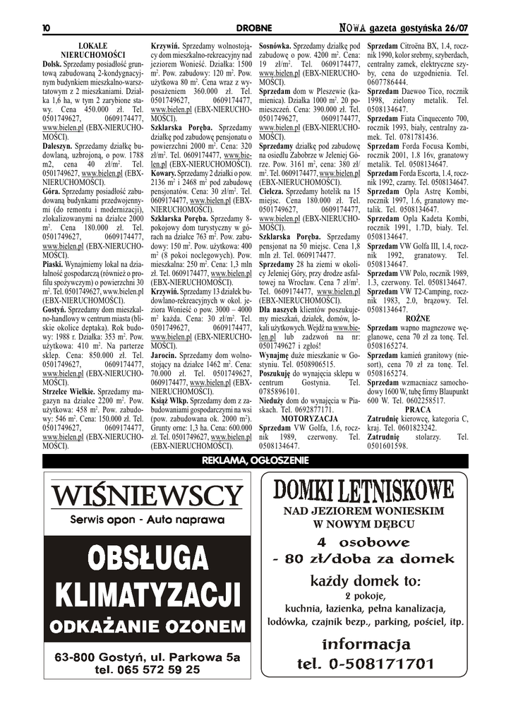 10 LOKALE NIERUCHOMOCI Dolsk. Sprzedamy posiad³oæ gruntow¹ zabudowan¹ 2-kondygnacyjnym budynkiem mieszkalno-warsztatowym z 2 mieszkaniami. Dzia³ka 1,6 ha, w tym 2 zarybione stawy. Cena 450.000 z³. Tel. 0501749627, 0609174477, www.bielen.pl (EBX-NIERUCHOMOCI). Daleszyn. Sprzedamy dzia³kê budowlan¹, uzbrojon¹, o pow. 1788 m2, cena 40 z³/m2. Tel. 0501749627, www.bielen.pl (EBXNIERUCHOMOCI). Góra. Sprzedamy posiad³oæ zabudowan¹ budynkami przedwojennymi (do remontu i modernizacji), zlokalizowanymi na dzia³ce 2000 m2. Cena 180.000 z³. Tel. 0501749627, 0609174477, www.bielen.pl (EBX-NIERUCHOMOCI). Piaski. Wynajmiemy lokal na dzia³alnoæ gospodarcz¹ (równie¿ o profilu spo¿ywczym) o powierzchni 30 m2. Tel. 0501749627, www.bielen.pl (EBX-NIERUCHOMOCI). Gostyñ. Sprzedamy dom mieszkalno-handlowy w centrum miasta (bliskie okolice deptaka). Rok budowy: 1988 r. Dzia³ka: 353 m2. Pow. u¿ytkowa: 410 m2. Na parterze sklep. Cena: 850.000 z³. Tel. 0501749627, 0609174477, www.bielen.pl (EBX-NIERUCHOMOCI). Strzelce Wielkie. Sprzedamy magazyn na dzia³ce 2200 m2. Pow. u¿ytkowa: 458 m2. Pow. zabudowy: 546 m2. Cena: 150.000 z³. Tel. 0501749627, 0609174477, www.bielen.pl (EBX-NIERUCHOMOCI). DROBNE Krzywiñ. Sprzedamy wolnostoj¹cy dom mieszkalno-rekreacyjny nad jeziorem Wonieæ. Dzia³ka: 1500 m2. Pow. zabudowy: 120 m2. Pow. u¿ytkowa 80 m2. Cena wraz z wyposa¿eniem 360.000 z³. Tel. 0501749627, 0609174477, www.bielen.pl (EBX-NIERUCHOMOCI). Szklarska Porêba. Sprzedamy dzia³kê pod zabudowê pensjonatu o powierzchni 2000 m2. Cena: 320 z³/m2. Tel. 0609174477, www.bielen.pl (EBX-NIERUCHOMOCI). Kowary. Sprzedamy 2 dzia³ki o pow. 2136 m2 i 2468 m2 pod zabudowê pensjonatów. Cena: 30 z³/m2. Tel. 0609174477, www.bielen.pl (EBXNIERUCHOMOCI). Szklarska Porêba. Sprzedamy 8pokojowy dom turystyczny w górach na dzia³ce 763 m2. Pow. zabudowy: 150 m2. Pow. u¿ytkowa: 400 m2 (8 pokoi noclegowych). Pow. mieszkalna: 250 m2. Cena: 1,3 mln z³. Tel. 0609174477, www.bielen.pl (EBX-NIERUCHOMOCI). Krzywiñ. Sprzedamy 13 dzia³ek budowlano-rekreacyjnych w okol. jeziora Wonieæ o pow. 3000 4000 m2 ka¿da. Cena: 30 z³/m2. Tel. 0501749627, 0609174477, www.bielen.pl (EBX-NIERUCHOMOCI). Jarocin. Sprzedamy dom wolnostoj¹cy na dzia³ce 1462 m2. Cena: 70.000 z³. Tel. 0501749627, 0609174477, www.bielen.pl (EBXNIERUCHOMOCI). Ksi¹¿ Wlkp. Sprzedamy dom z zabudowaniami gospodarczymi na wsi (pow. zabudowana ok. 2000 m2). Grunty orne: 1,3 ha. Cena: 600.000 z³. Tel. 0501749627, www.bielen.pl (EBX-NIERUCHOMOCI). NOWA gazeta gostyñska 26/07 Sosnówka. Sprzedamy dzia³kê pod zabudowê o pow. 4200 m2. Cena: 19 z³/m2. Tel. 0609174477, www.bielen.pl (EBX-NIERUCHOMOCI). Sprzedam dom w Pleszewie (kamienica). Dzia³ka 1000 m2. 20 pomieszczeñ. Cena: 390.000 z³. Tel. 0501749627, 0609174477, www.bielen.pl (EBX-NIERUCHOMOCI). Sprzedamy dzia³kê pod zabudowê na osiedlu Zabobrze w Jeleniej Górze. Pow. 3161 m2, cena: 380 z³/ m2. Tel. 0609174477, www.bielen.pl (EBX-NIERUCHOMOCI). Cielcza. Sprzedamy hotelik na 15 miejsc. Cena 180.000 z³. Tel. 0501749627, 0609174477, www.bielen.pl (EBX-NIERUCHOMOCI). Szklarska Porêba. Sprzedamy pensjonat na 50 miejsc. Cena 1,8 mln z³. Tel. 0609174477. Sprzedamy 28 ha ziemi w okolicy Jeleniej Góry, przy drodze asfaltowej na Wroc³aw. Cena 7 z³/m2. Tel. 0609174477, www.bielen.pl (EBX-NIERUCHOMOCI). Dla naszych klientów poszukujemy mieszkañ, dzia³ek, domów, lokali u¿ytkowych. Wejd na www.bielen.pl lub zadzwoñ na nr: 0501749627 i zg³o! Wynajmê du¿e mieszkanie w Gostyniu. Tel. 0508906515. Poszukujê do wynajêcia sklepu w centrum Gostynia. Tel. 0785896101. Niedu¿y dom do wynajêcia w Piaskach. Tel. 0692877171. MOTORYZACJA Sprzedam VW Golfa, 1.6, rocznik 1989, czerwony. Tel. 0508134647. Sprzedam Citroëna BX, 1.4, rocznik 1990, kolor srebrny, szyberdach, centralny zamek, elektryczne szyby, cena do uzgodnienia. Tel. 0607786444. Sprzedam Daewoo Tico, rocznik 1998, zielony metalik. Tel. 0508134647. Sprzedam Fiata Cinquecento 700, rocznik 1993, bia³y, centralny zamek. Tel. 0781781436. Sprzedam Forda Focusa Kombi, rocznik 2001, 1.8 16v, granatowy metalik. Tel. 0508134647. Sprzedam Forda Escorta, 1.4, rocznik 1992, czarny. Tel. 0508134647. Sprzedam Opla Astrê Kombi, rocznik 1997, 1.6, granatowy metalik. Tel. 0508134647. Sprzedam Opla Kadeta Kombi, rocznik 1991, 1.7D, bia³y. Tel. 0508134647. Sprzedam VW Golfa III, 1.4, rocznik 1992, granatowy. Tel. 0508134647. Sprzedam VW Polo, rocznik 1989, 1.3, czerwony. Tel. 0508134647. Sprzedam VW T2-Camping, rocznik 1983, 2.0, br¹zowy. Tel. 0508134647. RO¯NE Sprzedam wapno magnezowe wêglanowe, cena 70 z³ za tonê. Tel. 0508165274. Sprzedam kamieñ granitowy (niesort), cena 70 z³ za tonê. Tel. 0508165274. Sprzedam wzmacniacz samochodowy 1600 W, tubê firmy Blaupunkt 600 W. Tel. 0602258517. PRACA Zatrudniê kierowcê, kategoria C, kraj. Tel. 0601823242. Zatrudniê stolarzy. Tel. 0501601598. REKLAMA, OG£OSZENIE NAD JEZIOREM WONIESKIM W NOWYM DÊBCU ka¿dy domek to: 2 pokoje, kuchnia, ³azienka, pe³na kanalizacja, lodówka, czajnik bezp., parking, pociel, itp.