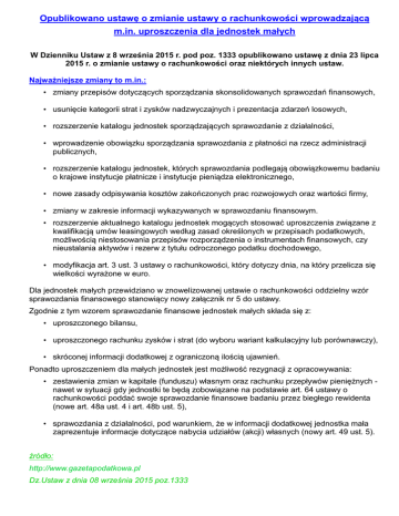 Opublikowano ustawę o zmianie ustawy o rachunkowości wprowadzającą m.in. uproszczenia dla jednostek małych W Dzienniku Ustaw z 8 września 2015 r. pod poz. 1333 opublikowano ustawę z dnia 23 lipca 2015 r. o zmianie ustawy o rachunkowości oraz niektórych innych ustaw. Najważniejsze zmiany to m.in.: • zmiany przepisów dotyczących sporządzania skonsolidowanych sprawozdań finansowych, • usunięcie kategorii strat i zysków nadzwyczajnych i prezentacja zdarzeń losowych, • rozszerzenie katalogu jednostek sporządzających sprawozdanie z działalności, • wprowadzenie obowiązku sporządzania sprawozdania z płatności na rzecz administracji publicznych, • rozszerzenie katalogu jednostek, których sprawozdania podlegają obowiązkowemu badaniu o krajowe instytucje płatnicze i instytucje pieniądza elektronicznego, • nowe zasady odpisywania kosztów zakończonych prac rozwojowych oraz wartości firmy, • zmiany w zakresie informacji wykazywanych w sprawozdaniu finansowym. • rozszerzenie aktualnego katalogu jednostek mogących stosować uproszczenia związane z kwalifikacją umów leasingowych według zasad określonych w przepisach podatkowych, możliwością niestosowania przepisów rozporządzenia o instrumentach finansowych, czy nieustalania aktywów i rezerw z tytułu odroczonego podatku dochodowego, • modyfikacja art. 3 ust. 3 ustawy o rachunkowości, który dotyczy dnia, na który przelicza się wielkości wyrażone w euro. Dla jednostek małych przewidziano w znowelizowanej ustawie o rachunkowości oddzielny wzór sprawozdania finansowego stanowiący nowy załącznik nr 5 do ustawy. Zgodnie z tym wzorem sprawozdanie finansowe jednostek małych składa się z: • uproszczonego bilansu, • uproszczonego rachunku zysków i strat (do wyboru wariant kalkulacyjny lub porównawczy), • skróconej informacji dodatkowej z ograniczoną ilością ujawnień. Ponadto uproszczeniem dla małych jednostek jest możliwość rezygnacji z opracowywania: • zestawienia zmian w kapitale (funduszu) własnym oraz rachunku przepływów pieniężnych nawet w sytuacji gdy jednostki te będą zobowiązane na podstawie art. 64 ustawy o rachunkowości poddać swoje sprawozdanie finansowe badaniu przez biegłego rewidenta (nowe art. 48a ust. 4 i art. 48b ust. 5), • sprawozdania z działalności, pod warunkiem, że w informacji dodatkowej jednostka mała zaprezentuje informacje dotyczące nabycia udziałów (akcji) własnych (nowy art. 49 ust. 5). źródło: http://www.gazetapodatkowa.pl Dz.Ustaw z dnia 08 września 2015 poz.1333