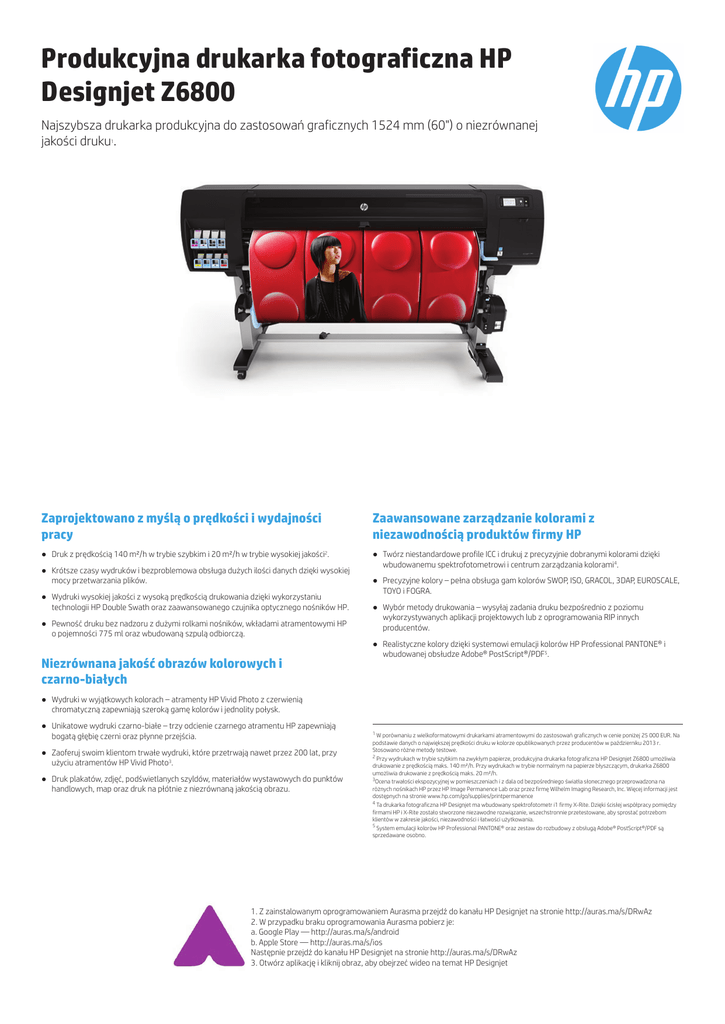 Produkcyjna drukarka fotograficzna HP Designjet Z6800 Najszybsza drukarka produkcyjna do zastosowań graficznych 1524 mm (60") o niezrównanej jakości druku . 1 Zaprojektowano z myślą o prędkości i wydajności pracy Zaawansowane zarządzanie kolorami z niezawodnością produktów firmy HP ● Druk z prędkością 140 m²/h w trybie szybkim i 20 m²/h w trybie wysokiej jakości2. ● Twórz niestandardowe profile ICC i drukuj z precyzyjnie dobranymi kolorami dzięki wbudowanemu spektrofotometrowi i centrum zarządzania kolorami4. ● Krótsze czasy wydruków i bezproblemowa obsługa dużych ilości danych dzięki wysokiej mocy przetwarzania plików. ● Wydruki wysokiej jakości z wysoką prędkością drukowania dzięki wykorzystaniu technologii HP Double Swath oraz zaawansowanego czujnika optycznego nośników HP. ● Pewność druku bez nadzoru z dużymi rolkami nośników, wkładami atramentowymi HP o pojemności 775 ml oraz wbudowaną szpulą odbiorczą. Niezrównana jakość obrazów kolorowych i czarno-białych ● Precyzyjne kolory – pełna obsługa gam kolorów SWOP, ISO, GRACOL, 3DAP, EUROSCALE, TOYO i FOGRA. ● Wybór metody drukowania – wysyłaj zadania druku bezpośrednio z poziomu wykorzystywanych aplikacji projektowych lub z oprogramowania RIP innych producentów. ● Realistyczne kolory dzięki systemowi emulacji kolorów HP Professional PANTONE® i wbudowanej obsłudze Adobe® PostScript®/PDF5. ● Wydruki w wyjątkowych kolorach – atramenty HP Vivid Photo z czerwienią chromatyczną zapewniają szeroką gamę kolorów i jednolity połysk. ● Unikatowe wydruki czarno-białe – trzy odcienie czarnego atramentu HP zapewniają bogatą głębię czerni oraz płynne przejścia. ● Zaoferuj swoim klientom trwałe wydruki, które przetrwają nawet przez 200 lat, przy użyciu atramentów HP Vivid Photo3. ● Druk plakatów, zdjęć, podświetlanych szyldów, materiałów wystawowych do punktów handlowych, map oraz druk na płótnie z niezrównaną jakością obrazu. 1 W porównaniu z wielkoformatowymi drukarkami atramentowymi do zastosowań graficznych w cenie poniżej 25 000 EUR. Na podstawie danych o największej prędkości druku w kolorze opublikowanych przez producentów w październiku 2013 r. Stosowano różne metody testowe. 2 Przy wydrukach w trybie szybkim na zwykłym papierze, produkcyjna drukarka fotograficzna HP Designjet Z6800 umożliwia drukowanie z prędkością maks. 140 m²/h. Przy wydrukach w trybie normalnym na papierze błyszczącym, drukarka Z6800 umożliwia drukowanie z prędkością maks. 20 m²/h. 3Ocena trwałości ekspozycyjnej w pomieszczeniach i z dala od bezpośredniego światła słonecznego przeprowadzona na różnych nośnikach HP przez HP Image Permanence Lab oraz przez firmę Wilhelm Imaging Research, Inc. Więcej informacji jest dostępnych na stronie www.hp.com/go/supplies/printpermanence 4 Ta drukarka fotograficzna HP Designjet ma wbudowany spektrofotometr i1 firmy X-Rite. Dzięki ścisłej współpracy pomiędzy firmami HP i X-Rite zostało stworzone niezawodne rozwiązanie, wszechstronnie przetestowane, aby sprostać potrzebom klientów w zakresie jakości, niezawodności i łatwości użytkowania. 5 System emulacji kolorów HP Professional PANTONE® oraz zestaw do rozbudowy z obsługą Adobe® PostScript®/PDF są sprzedawane osobno. 1. Z zainstalowanym oprogramowaniem Aurasma przejdź do kanału HP Designjet na stronie http://auras.ma/s/DRwAz 2. W przypadku braku oprogramowania Aurasma pobierz je: a. Google Play — http://auras.ma/s/android b. Apple Store — http://auras.ma/s/ios Następnie przejdź do kanału HP Designjet na stronie http://auras.ma/s/DRwAz 3. Otwórz aplikację i kliknij obraz, aby obejrzeć wideo na temat HP Designjet Produkcyjna drukarka fotograficzna HP Designjet Z6800 Dane techniczne Drukowanie Zawartość opakowania Kolorowe obrazy 19,7 m²/godz. na nośnikach błyszczących Rozdzielczość druku Z optymalizacją do 2400 x 1200 dpi F2S72A Marginesy (górny x dolny x lewy x prawy) Rolka: 5 x 5 x 5 x 5 mm Produkcyjna drukarka fotograficzna HP Designjet Z6800; oś na rolkę papieru; głowice drukujące; startowe wkłady atramentowe; wkład do konserwacji; podstawa drukarki; szpula odbiorcza; zestaw adaptera osi na rolkę papieru 3"; skrócona instrukcja obsługi; plakat instalacyjny; oprogramowanie startowe; przewód zasilania Technologia Technologia termiczna HP Inkjet Typy atramentów Pigmentowy Certyfikaty Kolory atramentu 8 (czerwony chromatyczny, purpurowy, czarny matowy, czarny fotograficzny, żółty, błękitny, jasnoszary, jasnopurpurowy) Bezpieczeństwo Zgodny z wymogami UE (dyrektywa niskonapięciowa i EN 60950-1); GOST (Rosja) Objętość kropli atramentu 4 pl (lc, lm, lg, pK), 6 pl (R, M, Y, mK) Elektromagnetyczne Pojemność 775 ml Zgodne z wymaganiami klasy A, w tym: UE (dyrektywa o kompatybilności elektromagnetycznej) Ochrona środowiska ENERGY STAR®; WEEE; RoHS (UE); REACH; EPEAT Bronze ENERGY STAR Tak Ilość dysz głowicy drukującej 2112 Głowice drukujące 8 (czerwony chromatyczny, purpurowy, czarny matowy, czarny fotograficzny, żółty, błękitny, jasnoszary, jasnopurpurowy) Prędkość druku 140 m²/godz. Dokładność linii +/- 0.1% Informacje o precyzji linii: +/- 0,1% podanej długości wektora lub +/- 0,2 mm (większa z tych wartości) przy temperaturze 23°C i wilgotności względnej 50-60%, na nośniku matowym HP A0 w trybie najwyższej lub normalnej jakości i z wykorzystaniem atramentów HP Photo Minimalna grubość linii 0,02 mm (adresowalne przez HP-GL/2) Gwarantowana min szerokość wiersza 0,067 mm (ISO/IEC 13660:2001(E)) Maksymalna waga nośnika 25 kg Maks. gęstość optyczna 4,5 l* min/2,31 D (z nośnikiem HP Premium Instant Dry Photo Gloss oraz atramentami HP Photo) Nośnik Obsługa Podawanie z rolki; automatyczna obcinarka; szpula odbiorcza Typy Papier typu bond i powlekany, papier techniczny, folia, papier fotograficzny, papier do odbitek próbnych, papier