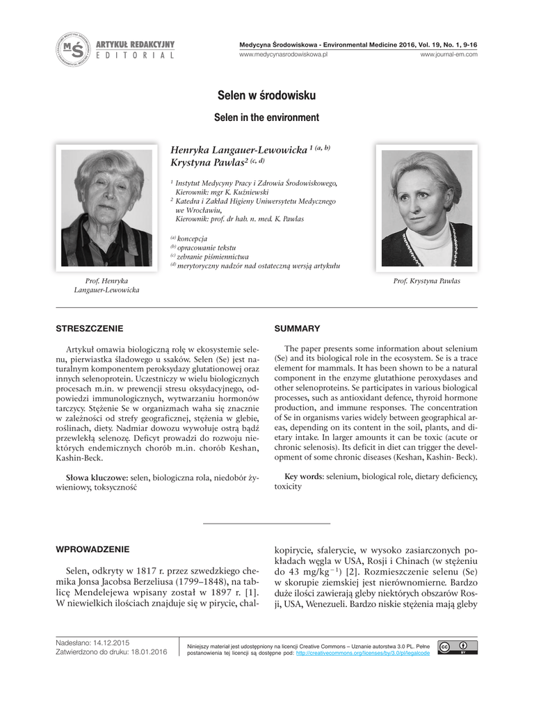medycyna Środowiskowa - environmental medicine 2016, Vol. 19, no. 1, 9-16 www.journal-em.com www.medycynasrodowiskowa.pl Selen w środowisku Selen in the environment Henryka Langauer-Lewowicka 1 (a, b) Krystyna Pawlas2 (c, d) 1 2 Instytut Medycyny Pracy i Zdrowia Środowiskowego, Kierownik: mgr K. Kuźniewski Katedra i Zakład Higieny Uniwersytetu Medycznego we Wrocławiu, Kierownik: prof. dr hab. n. med. K. Pawlas koncepcja opracowanie tekstu (c) zebranie piśmiennictwa (d) merytoryczny nadzór nad ostateczną wersją artykułu (a) (b) Prof. Henryka Langauer-Lewowicka StreSzczenie Prof. Krystyna Pawlas Summary Artykuł omawia biologiczną rolę w ekosystemie selenu, pierwiastka śladowego u ssaków. Selen (Se) jest naturalnym komponentem peroksydazy glutationowej oraz innych selenoprotein. Uczestniczy w wielu biologicznych procesach m.in. w prewencji stresu oksydacyjnego, odpowiedzi immunologicznych, wytwarzaniu hormonów tarczycy. Stężenie Se w organizmach waha się znacznie w zależności od strefy geograficznej, stężenia w glebie, roślinach, diety. Nadmiar dowozu wywołuje ostrą bądź przewlekłą selenozę. Deficyt prowadzi do rozwoju niektórych endemicznych chorób m.in. chorób Keshan, Kashin-Beck. The paper presents some information about selenium (Se) and its biological role in the ecosystem. Se is a trace element for mammals. It has been shown to be a natural component in the enzyme glutathione peroxydases and other selenoproteins. Se participates in various biological processes, such as antioxidant defence, thyroid hormone production, and immune responses. The concentration of Se in organisms varies widely between geographical areas, depending on its content in the soil, plants, and dietary intake. In larger amounts it can be toxic (acute or chronic selenosis). Its deficit in diet can trigger the development of some chronic diseases (Keshan, Kashin- Beck). WproWadzenie kopirycie, sfalerycie, w wysoko zasiarczonych pokładach węgla w USA, Rosji i Chinach (w stężeniu do 43 mg/kg11) [2]. Rozmieszczenie selenu (Se) w skorupie ziemskiej jest nierównomierne. Bardzo duże ilości zawierają gleby niektórych obszarów Rosji, USA, Wenezueli. Bardzo niskie stężenia mają gleby Słowa kluczowe: selen, biologiczna rola, niedobór żywieniowy, toksyczność Selen, odkryty w 1817 r. przez szwedzkiego chemika Jonsa Jacobsa Berzeliusa (1799–1848), na tablicę Mendelejewa wpisany został w 1897 r. [1]. W niewielkich ilościach znajduje się w pirycie, chalNadesłano: 14.12.2015 Zatwierdzono do druku: 18.01.2016 Key words: selenium, biological role, dietary deficiency, toxicity Niniejszy materiał jest udostępniony na licencji Creative Commons – Uznanie autorstwa 3.0 PL. Pełne postanowienia tej licencji są dostępne pod: http://creativecommons.org/licenses/by/3.0/pl/legalcode 10 medycyna Środowiskowa - environmental medicine 2016, Vol. 19, no. 1 Henryka Langauer-Lewowicka, Krystyna Pawlas: Selen w środowisku Nowej Zelandii, niektórych obszarów Chin, Zachodniej Korei, Syberii, a także Europy. Deficyt Se występuje w regionach o skąpej obecności materiałów skalnych [3, 4]. Należą do nich północnowschodnie gleby USA, północnych Niemiec, Danii, Polski i krajów bałtyckich, centralnej Rosji od Uralu po całą Syberię włącznie. Stężenia Se w skałach wulkanicznych szacuje się na 120 µg/g, gleby zawierają 0,005–1200 µg/g, najczęściej w granicach 0,1–10 µg. W regionach deficytowych stężenie Se kształtuje się na poziomie 0,005–2,0 µg [5]. Rośliny czerpiąc z gleby Se, dostarczają go wszystkim organizmom. Dla tych środowisk selen jest ważnym elementem śladowym, nieodzownym dla prawidłowego funkcjonowania, może też być czynnikiem, którego nadmiar bądź deficyt wywołuje niepożądane działanie. Selen W atmoSferze Aktywność antropogeniczna wywiera zasadniczy wpływ na globalne krążenie Se w atmosferze z tego względu, iż 37,5–40,6% totalnej emisji pochodzi z działalności człowieka m.in. ze spalania węgla i olejów, użytkowania i wytopów metali nieżelaznych [2]. Stężenie Se w powietrzu atmosferycznym w regionach zurbanizowanych ocenia się na 1–10 ng/m3. Ocenia się, że w USA ok. 1500 ton rocznej emisji pochodzi ze spalania paliw. Tę samą ilość emitują wysypiska miejskie i zakłady przemysłowe [5]. Obecność selenu w wodzie zależy od atmosferycznych depozytów. Większość nieorganicznych związków Se jest rozpuszczalna w wodzie. Stężenia rzędu 600 µg/l występują w wodzie gruntowej. W wodzie wodociągowej wartość ta bardzo rzadko przekracza 10 µg/l m.in. w USA, Kanadzie, Australii [5]. Gleba stanowi jedyne źródło Se dla roślin, a tym samym dla wszystkich organizmów ekosystemu. Inkorporacja przez roślinność zależy od stężenia w glebie, od jej pH, opadów atmosferycznych, obecności niektórych bakterii przekształcających nierozpuszczalne postaci Se w związki rozpuszczalne, lepiej przyswajalne przez rośliny. Selen zawierają zboża (0,01–0,55 µg/g11), mleko (<0,001 µg/g11), ryby, jaja (0,01–0,022 µg/g11), warzywa, owoce (0,00– 0,0022 µg/g11). Selen znajduje się również w cebuli, czosnku (metyloselenocysteina), w brukselce, kabaczkach, kalafiorach, niektórych grzybach i organizmach morskich. Wysokie stężenia selenoaminokwasów zawierają orzechy brazylijskie, rosnące w amazońskim basenie Peru, Boliwii, Kolumbii, Wenezueli, Ekwadoru [6, 7, 8]. Wchłanianie, metabolizm, Wydalanie Zainteresowanie selenem znacznie wzrosło po zidentyfikowaniu w 1973 r. jego obecności i roli w tworzeniu peroksydazy glutationowej oraz innych enzymów, niezbędnych w prewencji stresu oksydacyjnego [9]. W okresie późniejszym stwierdzono obecność selenu w około 30 innych selenoproteinach. Funkcje biologiczne poznano dotąd u 15 z nich. Uważa się, że nie rozpoznano dotąd wszystkich selenoprotein [7]. Badania doświadczalne pozwoliły na poznanie mechanizmów działania Se, jego biolog