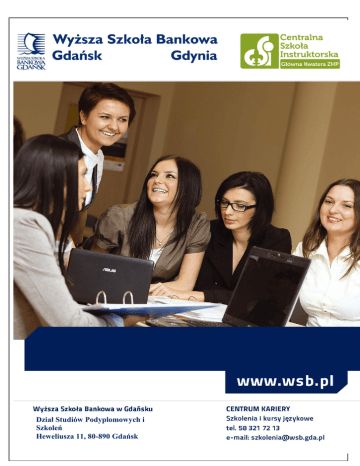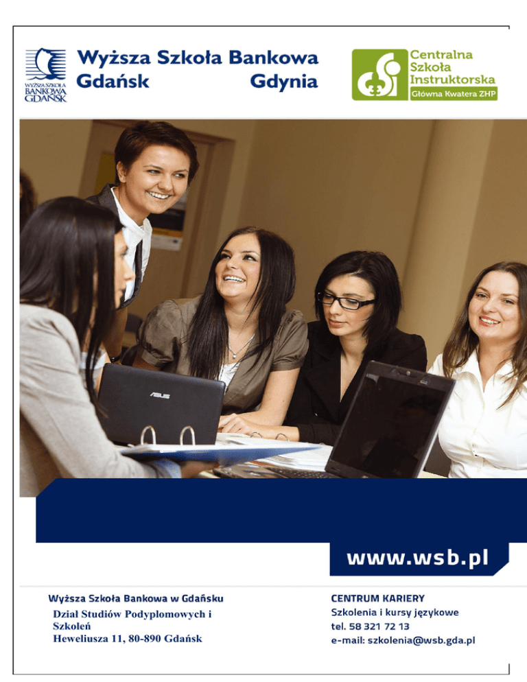 STUDIAstudiów PODYPLOMOWE ZARZĄDZANIE- W ORGANIZACJI PROJEKTEM Oferta podyplomowych ZARZĄDZANIE POZARZĄDOWEJ dla ELESTER-PKP Sp. z o.o. Dział Studiów Podyplomowych i Szkoleń Wyższa Szkoła Bankowa w Gdańsku Dział Studiów Podyplomowych i Heweliusza 11, 80-890 Gdańsk Szkoleń Tel./fax 58 321 72 11, [email protected] Heweliusza 11, 80-890 Gdańsk STUDIA PODYPLOMOWE STUDIA PODYPLOMOWE W WYŻSZEJ SZKOLE BANKOWEJ W GDAŃSKU Wyższe Szkoły Bankowe to największa w Polsce grupa szkół biznesu. Ponad 18-letnie doświadczenie w kształceniu oraz współpraca z firmami sprawiają, że oferowana przez nas oferta edukacyjna odpowiada aktualnym potrzebom rynku, a dyplomy i certyfikaty przez nas wydawane ułatwiają zdobycie pracy i awans zawodowy. W listopadzie 2010 r. studia podyplomowe Wyższej Szkoły Bankowej w Gdańsku zostały uhonorowane Medalem Europejskim. Komisja weryfikacyjna doceniła konkurencyjność, wszechstronność i dostępność studiów oraz ich praktyczne walory przydatne na rynku pracy. Praca nad jakością kształcenia przynosi rezultaty. Jeden z nich to wysokie pozycje w rankingach. Periodyki opiniotwórcze, takie jak: „POLITYKA”, „WPROST”, „NEWSWEEK”, „RZECZPOSPOLITA” czy „HOME&MARKET” od lat konsekwentnie umieszczają Wyższe Szkoły Bankowe w na czołowych miejscach. Jednak z naszego punktu widzenia najważniejszym wyróżnieniem jest zadowolenie uczestników. Oferujemy DOŚWIADCZENIE 13 lat doświadczenia w realizacji studiów podyplomowych, ponad 7000 absolwentów ELASTYCZNOŚĆ Merytoryczna zawartość poszczególnych partii programu dostosowana do potrzeb odbiorców Miejsce prowadzenia zajęć oraz terminy zjazdów dostosowane do potrzeb PRAKTYCZNOŚĆ Dopracowany i wypróbowany praktyczny program kształcenia Zajęcia prowadzone przez specjalistów – praktyków z danej dziedziny Praktyczny wymiar kształcenia poprzez warsztatową formę zajęć PRZYJAZNOŚĆ Istotne jest dla nas, aby grupa słuchaczy była zintegrowana i efektywnie współdziałała w kreatywnej, przyjaznej atmosferze – każdy zjazd to spotkanie integracyjne PROGRAM STUDIÓW PODYPLOMOWYCH ZARZĄDZANIE W ORGANIZACJI POZARZĄDOWEJ WSPÓŁORGANIZOWANE PRZEZ CENTRALNĄ SZKOŁĘ INSTRUKTORSKĄ ZHP Cel Celem studiów jest przygotowanie instruktorów ZHP do pełnienia funkcji Komendanta Hufca zarządzającego jednostką powiatową organizacji pozarządowej - pełniących coraz ważniejszą rolę zarówno w życiu publicznym jak i na rynku pracy. Konieczność współpracy organizacji pozarządowych z biznesem, samorządami oraz realizacja projektów finansowanych z funduszy europejskich wymagają od członków organizacji coraz większych umiejętności zarządzania kadrą oraz samą organizacją. Celem studiów jest zapoznanie uczestników ze specyfiką zarządzania organizacjami pozarządowymi, zasadami współpracy z otoczeniem oraz efektywnymi sposobami pozyskiwania funduszy Korzyści Uczestnicy zdobędą wiedzę z zakresu zarządzania organizacją pozarządową oraz nowoczesnych metod zarządzania zasobami ludzkimi. Niewątpliwym atutem absolwenta będzie rozszerzona wiedza i umiejętności z zakresu pozyskiwania funduszy oraz promocji i budowania wizerunku organizacji pozarządowych. Wybrane zajęcia prowadzone są w formie aktywnego treningu dającego możliwość rozwoju własnych kompetencji zawodowych. Dodatkową korzyścią dla uczestników jest nabycie podstawowych umiejętności trenerskich prowadzenia szkoleń. Wiedza zdobyta podczas studiów wzmocni dodatkowo pozycję zawodową kadry ZHP na rozwijającym się rynku pracy III sektora oraz pozwoli efektywniej działać jako organizacja pozarządowa. Uczestnicy Studia ze względu na zakres programu kierowane są do kadry zarządzającej - instruktorów ZHP oraz Komendantów Hufców, którzy chcą rozwijać swoje kompetencje z zakresu zarządzania organizacją, liderowania oraz umiejętności wystąpień publicznych. Ponadto studia adresowane są do osób, które zamierzają podjąć pracę w organizacjach pozarządowych. Opiekun merytoryczny: Szewczyk Aleksandra – trenerka biznesu, absolwentka studiów podyplomowych Akademii Trenera Wykładowcy m.in.: Szewczyk Aleksandra, Piotr Bucki, kadra ZHP PROGRAM 10 miesięcy nauki 180 godzin 10 zjazdów SEKTOR POZARZĄDOWY Podstawy i specyfika III sektora w Polsce – rodzaje organizacji W POLSCE ( 3 godz.) pozarządowych oraz ich mocne i słabe strony – 2 h Funkcjonowanie ZHP jako organizacji pozarządowej – 1 h PODSTAWY PRAWNE Polskie prawodawstwo dotyczące organizacji pozarządowych – 2 h DZIAŁANIA ORGANIZACJI Odpowiedzialność prawna – przepisy prawne wpływające na pracę POZARZĄDOWYCH W komendy hufca ZHP – 2 h POLSCE ORAZ DZIAŁANIA Przepisy prawa związkowego i ogólnego ZHP – 4 h ZHP (10 godz.) Proces podejmowania decyzji dotyczących prawodawstwa ZHP (przeciwdziałanie podejmowania błędnych decyzji) – 2 h ZARZĄDZANIE Prowadzenie działalności gospodarczej przez organizacje pozarządowe FINANSAMI W –2h ORGANIZACJACH Podstawy księgowości, budżetowania, sprawozdawczości finansowej w POZARZĄDOWYCH organizacji pozarządowej – 2 h Zasady rachunkowości i działalności finansowej w ZHP – 6 h Budżetowanie – analiza w ZHP – 2 h ORGANIZACJA – MAJĄTEK ORGANIZACJI Nadzór nad gospodarką – inwentaryzacja i zarządzanie biznesowe – 2 h ZHP (14 godz.) POZYSKIWANIE Pozyskiwanie funduszy przez organizacje pozarządowe - fundrising, FUNDUSZY I źródła finansowania organizacji pozarządowych i ich wykorzystanie - 2 h PRZYGOTOWANIE Przygotowanie wniosków o dofinansowanie - zasady tworzenia WNIOSKÓW O poprawnych i skutecznych wniosków, kryteria ewaluacji wniosków o DOFINANSOWANIE dofinansowanie dla organizacji, przykłady dobrych praktyk – 2 h Pozyskiwanie środków przez ZHP na wzór organizacji pozarządowych – 4h ( 10 godz.) Pozyskiwanie środków z UE oraz sponsorów prywatnych i instytucjonalnych – 2 h TWORZENIE MIS