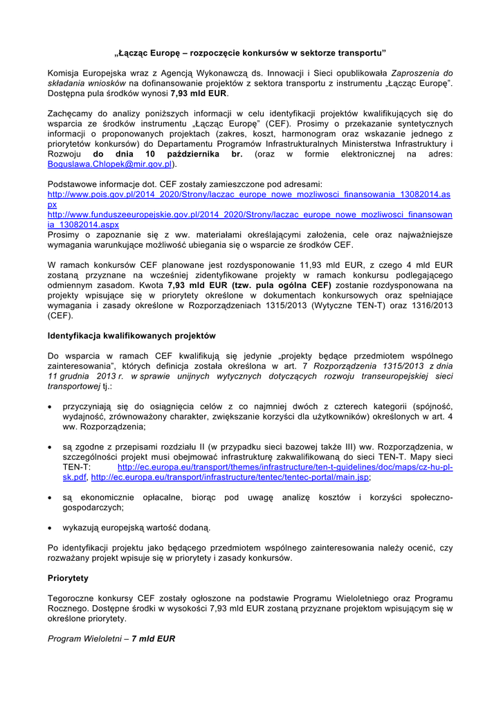 „Łącząc Europę – rozpoczęcie konkursów w sektorze transportu” Komisja Europejska wraz z Agencją Wykonawczą ds. Innowacji i Sieci opublikowała Zaproszenia do składania wniosków na dofinansowanie projektów z sektora transportu z instrumentu „Łącząc Europę”. Dostępna pula środków wynosi 7,93 mld EUR. Zachęcamy do analizy poniższych informacji w celu identyfikacji projektów kwalifikujących się do wsparcia ze środków instrumentu „Łącząc Europę” (CEF). Prosimy o przekazanie syntetycznych informacji o proponowanych projektach (zakres, koszt, harmonogram oraz wskazanie jednego z priorytetów konkursów) do Departamentu Programów Infrastrukturalnych Ministerstwa Infrastruktury i Rozwoju do dnia 10 października br. (oraz w formie elektronicznej na adres: [email protected]). Podstawowe informacje dot. CEF zostały zamieszczone pod adresami: http://www.pois.gov.pl/2014_2020/Strony/laczac_europe_nowe_mozliwosci_finansowania_13082014.as px http://www.funduszeeuropejskie.gov.pl/2014_2020/Strony/laczac_europe_nowe_mozliwosci_finansowan ia_13082014.aspx Prosimy o zapoznanie się z ww. materiałami określającymi założenia, cele oraz najważniejsze wymagania warunkujące możliwość ubiegania się o wsparcie ze środków CEF. W ramach konkursów CEF planowane jest rozdysponowanie 11,93 mld EUR, z czego 4 mld EUR zostaną przyznane na wcześniej zidentyfikowane projekty w ramach konkursu podlegającego odmiennym zasadom. Kwota 7,93 mld EUR (tzw. pula ogólna CEF) zostanie rozdysponowana na projekty wpisujące się w priorytety określone w dokumentach konkursowych oraz spełniające wymagania i zasady określone w Rozporządzeniach 1315/2013 (Wytyczne TEN-T) oraz 1316/2013 (CEF). Identyfikacja kwalifikowanych projektów Do wsparcia w ramach CEF kwalifikują się jedynie „projekty będące przedmiotem wspólnego zainteresowania”, których definicja została określona w art. 7 Rozporządzenia 1315/2013 z dnia 11 grudnia 2013 r. w sprawie unijnych wytycznych dotyczących rozwoju transeuropejskiej sieci transportowej tj.: przyczyniają się do osiągnięcia celów z co najmniej dwóch z czterech kategorii (spójność, wydajność, zrównoważony charakter, zwiększanie korzyści dla użytkowników) określonych w art. 4 ww. Rozporządzenia; są zgodne z przepisami rozdziału II (w przypadku sieci bazowej także III) ww. Rozporządzenia, w szczególności projekt musi obejmować infrastrukturę zakwalifikowaną do sieci TEN-T. Mapy sieci TEN-T: http://ec.europa.eu/transport/themes/infrastructure/ten-t-guidelines/doc/maps/cz-hu-plsk.pdf, http://ec.europa.eu/transport/infrastructure/tentec/tentec-portal/main.jsp; są ekonomicznie gospodarczych; wykazują europejską wartość dodaną. opłacalne, biorąc pod uwagę analizę kosztów i korzyści społeczno- Po identyfikacji projektu jako będącego przedmiotem wspólnego zainteresowania należy ocenić, czy rozważany projekt wpisuje się w priorytety i zasady konkursów. Priorytety Tegoroczne konkursy CEF zostały ogłoszone na podstawie Programu Wieloletniego oraz Programu Rocznego. Dostępne środki w wysokości 7,93 mld EUR zostaną przyznane projektom wpisującym się w określone priorytety. Program Wieloletni – 7 mld EUR W ramach Programu priorytety zostały pogrupowane w 3 cele finansowe. Cel 1: Nr Priorytet Alokacja 1 Projekty należące do Korytarzy Sieci Bazowej (określone w Załączniku I do Rozporządzenia 1316/2013) 5,5 mld EUR 2 Pozostałe odcinki sieci bazowej (określone w załączniku I do Rozporządzenia 1316/2013) 250 mln EUR 3 Interoperacyjność kolei 50 mln EUR 4 ERTMS 200 mln EUR W zakresie priorytetu 1 (Projekty należące do Korytarzy Sieci Bazowej) wsparcie mogą otrzymać projekty dot.: odcinków linii kolejowych stanowiących elementy Korytarzy Sieci Bazowych wskazane w części I.2 załącznika I do Rozporządzenia 1315/2013 (CEF), w szczególności: o odcinki trans-graniczne Korytarzy Sieci Bazowych; o prace oraz studia, których celem jest przyśpieszenie likwidacji wąskich gardeł (zarówno w zakresie przepustowości jak i jakości usług) mających negatywny wpływ na potoki ruchu w ramach Korytarzy Sieci Bazowej; o studia przyczyniające się do rozpoczęcia wdrożenia projektów inwestycyjnych najistotniejszych z punktu widzenia celów sieci bazowej TEN-T (np. ważnych dla potoków ruchu wzdłuż całej osi sieci TEN-T); odcinków szlaków żeglugi śródlądowej stanowiących elementy Korytarzy Sieci Bazowych wskazane w części I.2 załącznika I do Rozporządzenia 1315/2013 (CEF), w tym działań dot. infrastruktury nabrzeżnej portów żeglugi śródlądowej w obrębie ww. odcinków; odcinków dróg stanowiących elementy Korytarzy Sieci Bazowych wskazane w części I.2 załącznika I do Rozporządzenia 1315/2013 (CEF); portów morskich stanowiących elementy Korytarzy Sieci Bazowych wskazane w części I.2 załącznika I do Rozporządzenia 1315/2013 (CEF), w szczególności: o połączenia portów z infrastrukturą w głębi lądu (kolejową, żeglugi śródlądowej lub drogową w przypadku braku możliwości zastosowania innych rozwiązań); o bezpieczny dostęp do portów od strony morza (falochrony, dragowanie, kanały dostępowe, śluzy i wsparcie nawigacyjne); o podstawowa infrastruktura (baseny wewnętrzne, nabrzeża, osuszanie terenu); o urządzenia odbioru ropy, oleju i innych odpadów; o wdrożenie nowych urządzeń i technologii w zakresie wykorzystania alternatywnej energii (LNG bunkering, shore-side electricity). Szczegółowy opis priorytetu znajduje się na stronie Agencji Wykonawczej ds. Innowacyjności i Sieci (INEA): http://inea.ec.europa.eu/download/calls2014/cef_transport/calltexts/_map_funding-objective1_annex-1_core-network-corridors.pdf. W zakresie priorytetu 2 (Pozostałe odcinki sieci bazowej) wsparcie mogą otrzymać projekty dot.: odcinków linii kolejowych stanowiących elementy Sieci Bazowej wskazane w części I.3 załącznika I do Rozp