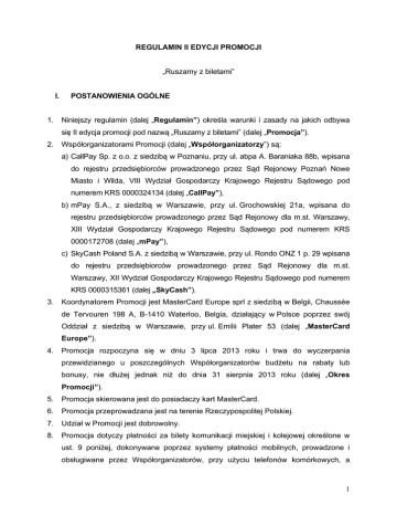 REGULAMIN II EDYCJI PROMOCJI „Ruszamy z biletami” I. 1. POSTANOWIENIA OGÓLNE Niniejszy regulamin (dalej „Regulamin”) określa warunki i zasady na jakich odbywa się II edycja promocji pod nazwą „Ruszamy z biletami” (dalej „Promocja”). 2. Współorganizatorami Promocji (dalej „Współorganizatorzy”) są: a) CallPay Sp. z o.o. z siedzibą w Poznaniu, przy ul. abpa A. Baraniaka 88b, wpisana do rejestru przedsiębiorców prowadzonego przez Sąd Rejonowy Poznań Nowe Miasto i Wilda, VIII Wydział Gospodarczy Krajowego Rejestru Sądowego pod numerem KRS 0000324134 (dalej „CallPay”), b) mPay S.A., z siedzibą w Warszawie, przy ul. Grochowskiej 21a, wpisana do rejestru przedsiębiorców prowadzonego przez Sąd Rejonowy dla m.st. Warszawy, XIII Wydział Gospodarczy Krajowego Rejestru Sądowego pod numerem KRS 0000172708 (dalej „mPay”), c) SkyCash Poland S.A. z siedzibą w Warszawie, przy ul. Rondo ONZ 1 p. 29 wpisana do rejestru przedsiębiorców prowadzonego przez Sąd Rejonowy dla m.st. Warszawy, XII Wydział Gospodarczy Krajowego Rejestru Sądowego pod numerem KRS 0000315361 (dalej „SkyCash”). 3. Koordynatorem Promocji jest MasterCard Europe sprl z siedzibą w Belgii, Chaussée de Tervouren 198 A, B-1410 Waterloo, Belgia, działający w Polsce poprzez swój Oddział z siedzibą w Warszawie, przy ul. Emilii Plater 53 (dalej „MasterCard Europe”). 4. Promocja rozpoczyna się w dniu 3 lipca 2013 roku i trwa do wyczerpania przewidzianego u poszczególnych Współorganizatorów budżetu na rabaty lub bonusy, nie dłużej jednak niż do dnia 31 sierpnia 2013 roku (dalej „Okres Promocji”). 5. Promocja skierowana jest do posiadaczy kart MasterCard. 6. Promocja przeprowadzana jest na terenie Rzeczypospolitej Polskiej. 7. Udział w Promocji jest dobrowolny. 8. Promocja dotyczy płatności za bilety komunikacji miejskiej i kolejowej określone w ust. 9 poniżej, dokonywane poprzez systemy płatności mobilnych, prowadzone i obsługiwane przez Współorganizatorów, przy użyciu telefonów komórkowych, a 1 rozliczanych za pomocą karty debetowej, kredytowej lub prepaid MasterCard wydanej przez dowolny bank krajowy w rozumieniu Ustawy z dnia 29 sierpnia 1997 r. Prawo bankowe (Dz.U. z 2002 r. nr 72, poz. 665 ze zm.) (dalej „Karta”). 9. Promocją objęte jest skorzystanie w Okresie Promocji z usług płatności poprzez: a) system CallPay, tj. system płatności przy użyciu telefonu komórkowego obsługiwany przez CallPay zgodnie z postanowieniami „Regulaminu świadczenia usług i organizacji płatności systemu CallPay”(dalej „Płatność CallPay”), dla transakcji, które są realizowane za pomocą podłączonej zgodnie z regulaminem usługi tj. „Regulaminem świadczenia usług i organizacji płatności systemu CallPay” aktywnej Karty, w celu dokonania zakupu biletów komunikacji miejskiej i/lub kolejowej, spośród wszystkich rodzajów biletów, z aktualnej, bieżąco dostępnej na stronie www.callpay.pl oferty CallPay, których zakup jest możliwy poprzez system CallPay. Rodzaje biletów komunikacji miejskiej i kolejowej, których zakup jest możliwy w Promocji w systemie CallPay dostępny jest bieżąco na stronie www.callpay.pl, b) system mPay, tj. system płatności przy użyciu telefonu komórkowego obsługiwany przez mPay zgodnie z postanowieniami „Regulaminu dla Użytkownika” (dalej „Płatność mPay”), w celu dokonania zakupu biletów komunikacji miejskiej, z aktualnej, bieżąco dostępnej na stronie www.mpay.pl oferty mPay. Rodzaje biletów komunikacji miejskiej, których zakup możliwy jest w Promocji w systemie mPay dostępny jest bieżąco na stronie www.mpay.pl, c) system SkyCash, tj. system płatności przy użyciu telefonu komórkowego obsługiwany przez SkyCash zgodnie z postanowieniami „Regulaminu Użytkownika Systemu SkyCash” (dalej „Płatność SkyCash”), do którego została podłączona zgodnie z regulaminem usługi, tj. „Regulaminem Użytkownika Systemu SkyCash”, aktywna Karta, w celu dokonania zakupu biletów komunikacji miejskiej i/lub kolejowej, spośród biletów z aktualnej, bieżąco dostępnej na stronie www.skycash.com oferty SkyCash. Rodzaje biletów komunikacji miejskiej i kolejowej, których zakup możliwy jest w Promocji w systemie SkyCash dostępny jest bieżąco na stronie www.skycash.com. 2 II. 1. UCZESTNIK Uczestnikiem Promocji może być każda osoba fizyczna, będąca posiadaczem aktywnej Karty (dalej „Uczestnik”), która: a) dokonała pełnej rejestracji u wybranego partnera MasterCard Mobile, których lista dostępna jest na stronie mastercardmobile.pl, przy użyciu telefonu komórkowego w celu korzystania z usług płatności u danego Współorganizatora, zgodnie z właściwym regulaminem świadczenia usług płatności przy użyciu telefonu komórkowego i podała dane Karty, i b) przed wykonaniem płatności objętej Promocją dokona zgłoszenia do udziału w Promocji za pośrednictwem aplikacji mobilnej MasterCard Mobile, w którym: i. poda numeru swojego numeru telefonu komórkowego, ii. zaakceptuje regulaminu Promocji, iii. wyrazi zgodę na przetwarzanie numeru telefonu przez MasterCard Europe w celu realizacji Promocji, w tym w celu przekazania Współorganizatorom. 2. Podany przez Uczestnika podczas zgłoszenia do udziału w Promocji numer telefonu musi być taki sam jak numer telefonu podany przez Uczestnika podczas rejestracji u Współorganizatora. W przypadku gdy, podany w aplikacji mobilnej MasterCard Mobile numer telefonu będzie inny niż numer telefonu podany podczas rejestracji w systemie płatności danego Współorganizatora Uczestnikowi nie będą naliczane bonusy i/lub rabaty. 3. Dla uniknięcia wątpliwości Bonusy i/lub Rabaty będą przyznawane Uczestnikowi, zgodnie z Regulaminem Promocji po dokonaniu przez Uczestnika zgłoszenia do udziału w Promocji zgodnie z ust. 1 pkt b) powyżej. III. 1. ZASADY UDZIAŁU W PROMOCJI Z zastrzeżeniem ust. 2 poniżej każdy U