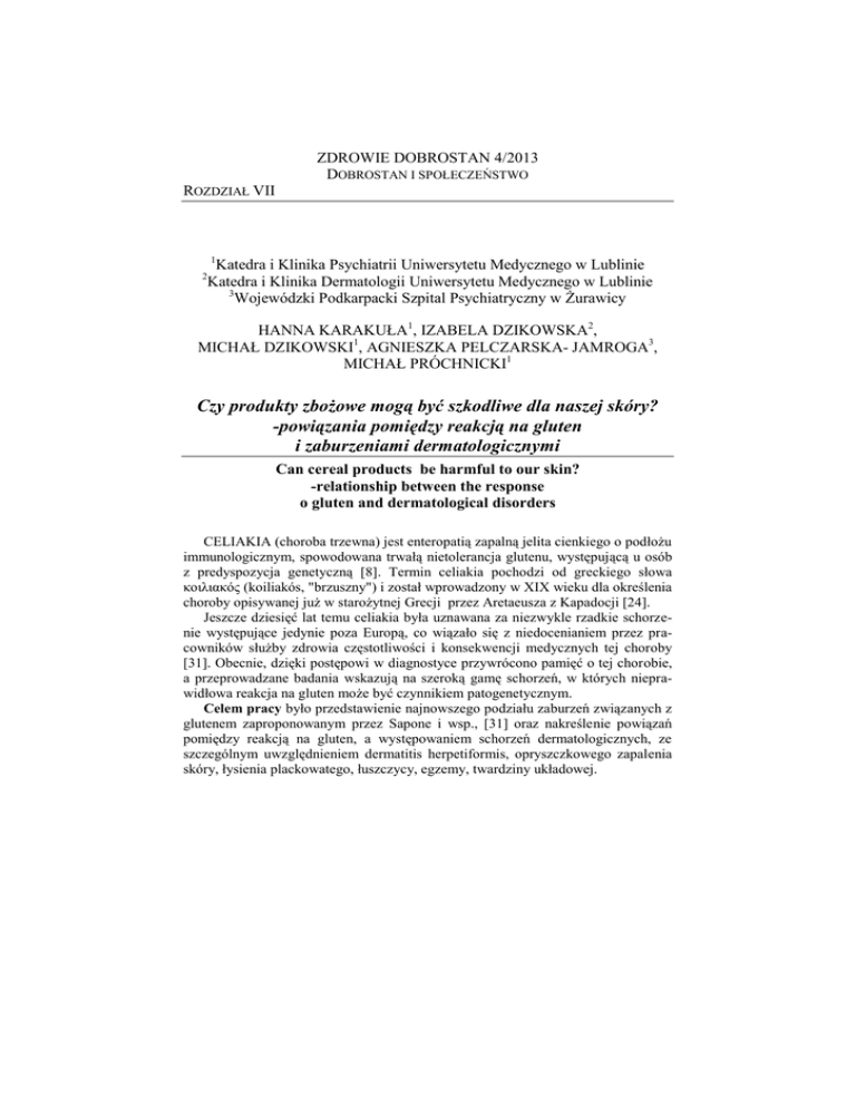 ZDROWIE DOBROSTAN 4/2013 DOBROSTAN I SPOŁECZEŃSTWO ROZDZIAŁ VII 1 Katedra i Klinika Psychiatrii Uniwersytetu Medycznego w Lublinie Katedra i Klinika Dermatologii Uniwersytetu Medycznego w Lublinie 3 Wojewódzki Podkarpacki Szpital Psychiatryczny w Żurawicy 2 HANNA KARAKUŁA1, IZABELA DZIKOWSKA2, MICHAŁ DZIKOWSKI1, AGNIESZKA PELCZARSKA- JAMROGA3, MICHAŁ PRÓCHNICKI1 Czy produkty zbożowe mogą być szkodliwe dla naszej skóry? -powiązania pomiędzy reakcją na gluten i zaburzeniami dermatologicznymi Can cereal products be harmful to our skin? -relationship between the response o gluten and dermatological disorders CELIAKIA (choroba trzewna) jest enteropatią zapalną jelita cienkiego o podłożu immunologicznym, spowodowana trwałą nietolerancja glutenu, występującą u osób z predyspozycja genetyczną [8]. Termin celiakia pochodzi od greckiego słowa κοιλιακός (koiliakós, "brzuszny") i został wprowadzony w XIX wieku dla określenia choroby opisywanej już w starożytnej Grecji przez Aretaeusza z Kapadocji [24]. Jeszcze dziesięć lat temu celiakia była uznawana za niezwykle rzadkie schorzenie występujące jedynie poza Europą, co wiązało się z niedocenianiem przez pracowników służby zdrowia częstotliwości i konsekwencji medycznych tej choroby [31]. Obecnie, dzięki postępowi w diagnostyce przywrócono pamięć o tej chorobie, a przeprowadzane badania wskazują na szeroką gamę schorzeń, w których nieprawidłowa reakcja na gluten może być czynnikiem patogenetycznym. Celem pracy było przedstawienie najnowszego podziału zaburzeń związanych z glutenem zaproponowanym przez Sapone i wsp., [31] oraz nakreślenie powiązań pomiędzy reakcją na gluten, a występowaniem schorzeń dermatologicznych, ze szczególnym uwzględnieniem dermatitis herpetiformis, opryszczkowego zapalenia skóry, łysienia plackowatego, łuszczycy, egzemy, twardziny układowej. ZDROWIE I DOBROSTAN NR 4 /2013 Dobrostan społeczeństwo W 2012 roku ukazała się praca zespołowa pod kierownictwem Sapone [31], która porządkowała wiedzę dotyczącą reakcji organizmu człowieka na gluten, dzieląc reakcje na 3 główne formy: I- alergiczna (alergia na gluten zawarty w pszenicy), II-autoimmunologiczna (celiakia, opryszczkowe zapalenie skóry i ataksja glutenowa), III- immunologiczna (nadwrażliwość na gluten). I. REAKCJE ALERGICZNE (początek: minuty do godziny po ekspozycji na gluten) Alergia na pszenicę jest zdefiniowana jako działanie niepożądane związane z odpowiedzią immunologiczną na białko pszenicy. W zależności od drogi ekspozycji na alergen i podstawowych mechanizmów immunologicznych, wrotami alergii może być skóra, przewód pokarmowy lub drogi oddechowe. Ekspozycja może wywołać wstrząs anafilaktyczny (WDEIA), być przyczyną astmy zawodowej (astma piekarzy) i katar, a także pokrzywki kontaktowej. Główną rolę w patogenezie tych chorób odgrywają przeciwciała IgE. II. REAKCJE AUTOIMMUNOLOGICZNE (początek: tygodnie do roku od ekspozycji na gluten) Celiakia (choroba trzewna) jest enteropatią zapalną jelita cienkiego o podłożu immunologicznym, spowodowana trwałą nietolerancja glutenu, występującą u osób z predyspozycja genetyczną. Początek objawów zwykle narasta stopniowo i charakteryzuje się pewnym opóźnieniem sięgającym miesięcy lub lat, po wprowadzeniu glutenu [2]. Niemniej jednak, u pacjentów długotrwale leczonych dietą bezglutenową, spożycie go może czasami spowodować natychmiastowe objawy, takie jak intensywne wymioty i ból brzucha [29]. Choroba jest kojarzona z ekspresją antygenów HLA-DQ2 (DQA1/05 i DQB1/02) i HLA-DQ8 (DQA1/03 i DQB1/0302) [8]. Badania wskazują, że celiakia łączy się głównie z antygenem DQ2 (95% pacjentów), pozostała część posiada antygen DQ8 (5% pacjentów) [8,29,33,2]. Homozygoty HLA-DQB1*02 są kojarzone z wyższym ryzykiem wystąpienia choroby [29] Czynniki genetyczne są konieczne, jednak nie stanowią dostatecznego warunku do rozwoju choroby. Choroba może ujawnić się w każdym wieku, zarówno w dzieciństwie, w okresie dojrzewania, jak i u dorosłych [15]. Występowanie celiakii wzrasta w grupach ryzyka. Obserwuje się częstsze występowanie choroby u krewnych pierwszego stopnia (4-12%) i u bliźniąt monozygotycznych (75%) [20]. Szczyt zapadalności u osób dorosłych przypada na piątą dekadę życia . Choroba zdecydowanie częściej dotyczy kobiet, które stanowią aż 70% wszystkich przypadków celiakii dorosłych. Na podstawie europejskich i amerykańskich serologicznych badań przesiewowych szacuje się, że celiakia bezobjawowa występuje z częstością 1/100300, a objawowa 1/3345 [8]. Najnowsze osiągnięcia zwiększyły naszą wiedzę na temat molekularnych podstaw tego zaburzenia. W ostatniej dekadzie nowe odkrycia naukowe dotyczące tej choroby, doprowadziły do sformułowania nowych koncepcji patofizjologii, które oferują możliwość nowych metod leczenia lub interwencji integracyjnych na diecie bezglutenowej [16]. 122 Hanna Karakuła, Izabela Dzikowska, Michał Dzikowski, Agnieszka Pelczarska-Jamroga, Michał Próchnicki Czy produkty zbożowe mogą być szkodliwe dla naszej skóry? -powiązania pomiędzy reakcją na gluten o zaburzeniami dermatologicznymi Objawy kliniczne u chorych na celiakię są zróżnicowane. Obejmują one objawy ze strony przewodu pokarmowego (tj. przewlekłą biegunkę, bóle brzucha, niedożywienie, nawracające afty jamy ustnej, wymioty, objawy zespołu jelita drażliwego, stłuszczeniowe zapalenie wątroby) ze strony skóry , układu krwiotwórczego, moczowo-płciowego, ośrodkowego układu nerwowego, a także wiele innych tj. osłabienie mięśniowe, tężyczkę, niski wzrost, hipoplazja szkliwa. [8,20] Wyniki badań potwierdzają związek celiakii z wieloma schorzeniami o podłożu immunologicznym np. łuszczycą[3,7,11, 19, 27,32], twardziną [2,18, 24], egzemą [30,4], łysieniem plackowatym [5,6,10] czy trądzikiem[35]. Obraz kl