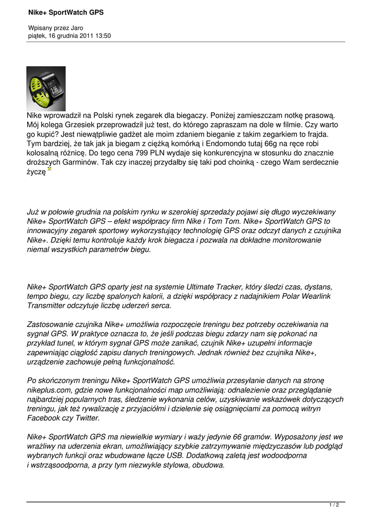 Nike+ SportWatch GPS Wpisany przez Jaro piątek, 16 grudnia 2011 13:50 Nike wprowadził na Polski rynek zegarek dla biegaczy. Poniżej zamieszczam notkę prasową. Mój kolega Grzesiek przeprowadził już test, do którego zapraszam na dole w filmie. Czy warto go kupić? Jest niewątpliwie gadżet ale moim zdaniem bieganie z takim zegarkiem to frajda. Tym bardziej, że tak jak ja biegam z ciężką komórką i Endomondo tutaj 66g na ręce robi kolosalną różnicę. Do tego cena 799 PLN wydaje się konkurencyjna w stosunku do znacznie droższych Garminów. Tak czy inaczej przydałby się taki pod choinką - czego Wam serdecznie życzę Już w połowie grudnia na polskim rynku w szerokiej sprzedaży pojawi się długo wyczekiwany Nike+ SportWatch GPS – efekt współpracy firm Nike i Tom Tom. Nike+ SportWatch GPS to innowacyjny zegarek sportowy wykorzystujący technologię GPS oraz odczyt danych z czujnika Nike+. Dzięki temu kontroluje każdy krok biegacza i pozwala na dokładne monitorowanie niemal wszystkich parametrów biegu. Nike+ SportWatch GPS oparty jest na systemie Ultimate Tracker, który śledzi czas, dystans, tempo biegu, czy liczbę spalonych kalorii, a dzięki współpracy z nadajnikiem Polar Wearlink Transmitter odczytuje liczbę uderzeń serca. Zastosowanie czujnika Nike+ umożliwia rozpoczęcie treningu bez potrzeby oczekiwania na sygnał GPS. W praktyce oznacza to, że jeśli podczas biegu zdarzy nam się pokonać na przykład tunel, w którym sygnał GPS może zanikać, czujnik Nike+ uzupełni informacje zapewniając ciągłość zapisu danych treningowych. Jednak również bez czujnika Nike+, urządzenie zachowuje pełną funkcjonalność. Po skończonym treningu Nike+ SportWatch GPS umożliwia przesyłanie danych na stronę nikeplus.com, gdzie nowe funkcjonalności map umożliwiają: odnalezienie oraz przeglądanie najbardziej popularnych tras, śledzenie wykonania celów, uzyskiwanie wskazówek dotyczących treningu, jak też rywalizację z przyjaciółmi i dzielenie się osiągnięciami za pomocą witryn Facebook czy Twitter. Nike+ SportWatch GPS ma niewielkie wymiary i waży jedynie 66 gramów. Wyposażony jest we wrażliwy na uderzenia ekran, umożliwiający szybkie zatrzymywanie międzyczasów lub podgląd wybranych funkcji oraz wbudowane łącze USB. Dodatkową zaletą jest wodoodporna i wstrząsoodporna, a przy tym niezwykle stylowa, obudowa. 1/2 Nike+ SportWatch GPS Wpisany przez Jaro piątek, 16 grudnia 2011 13:50 2/2