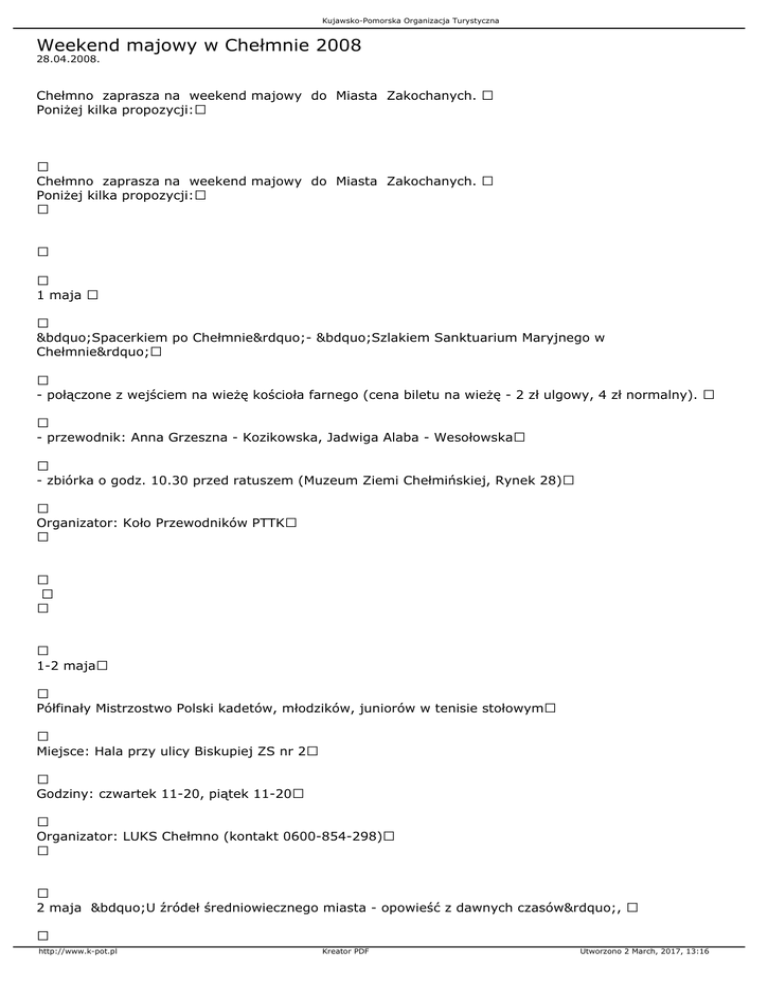 Kujawsko-Pomorska Organizacja Turystyczna Weekend majowy w Chełmnie 2008 28.04.2008. Chełmno zaprasza na weekend majowy do Miasta Zakochanych. Poniżej kilka propozycji: Chełmno zaprasza na weekend majowy do Miasta Zakochanych. Poniżej kilka propozycji: 1 maja „Spacerkiem po Chełmnie”- „Szlakiem Sanktuarium Maryjnego w Chełmnie” - połączone z wejściem na wieżę kościoła farnego (cena biletu na wieżę - 2 zł ulgowy, 4 zł normalny). - przewodnik: Anna Grzeszna - Kozikowska, Jadwiga Alaba - Wesołowska - zbiórka o godz. 10.30 przed ratuszem (Muzeum Ziemi Chełmińskiej, Rynek 28) Organizator: Koło Przewodników PTTK 1-2 maja Półfinały Mistrzostwo Polski kadetów, młodzików, juniorów w tenisie stołowym Miejsce: Hala przy ulicy Biskupiej ZS nr 2 Godziny: czwartek 11-20, piątek 11-20 Organizator: LUKS Chełmno (kontakt 0600-854-298) 2 maja „U źródeł średniowiecznego miasta - opowieść z dawnych czasów”, http://www.k-pot.pl Kreator PDF Utworzono 2 March, 2017, 13:16 Kujawsko-Pomorska Organizacja Turystyczna zorganizowane w roku jubileuszu 775-lecia nadania Chełmnu praw miejskich obchodzonego pod hasłem „Blaski średniowiecza". 2 maja 2008 r.- Nowe Planty /okolice Bramy Grudziądzkiej/ o godzinie 20.30. Współorganizatorzy: Chełmiński Dom Kultury, Chorągiew Ziemi Chełmińskiej, Stowarzyszenia Muzyczne "Chorus Culmensis" "Wojt - Studio" - firma usług muzycznych 3 maja Uroczystości związane z rocznicą UCHWALENIA KONSTYTUCJI 3 MAJA | godz. 11.00 - koncert orkiestry dętej Chełmińskiego Domu Kultury (przy Bramie Grudziądzkiej) godz. 12.00 - złożenie kwiatów przy pomniku Nieznanego Żołnierza Organizator: Urząd Miasta Chełmna, Chełmiński Dom Kultury, Muzeum Ziemi Chełmińskiej 3 maja Międzynarodowy Wyścig Kolarski o Puchar Prezydenta Miasta Grudziądza 3.05 - II etap Chełmno - Chełmno (100,5 km) godz. 15.00 (start i meta Rynek Chełmno) Organizator: ALKS Stal Grudziądz (kontakt tel/fax 0 56 4651331) Kościół farny pw. Wniebowzięcia NMP od 1 maja 2008 r. czynne będzie wejście na wieżę (cena biletu na wieżę - 2 zł ulgowy, 4 zł normalny) Muzeum Ziemi Chełmińskiej w ratuszu serdecznie zaprasza: 1 maja - 11.00 - 15.00 (czwartek) 2 maja - 10.00 - 16.00 (piątek) 3 maja - 11.00 - 15.00 (sobota) http://www.k-pot.pl Kreator PDF Utworzono 2 March, 2017, 13:16 Kujawsko-Pomorska Organizacja Turystyczna 4 maja - 11.00 - 14.00 (niedziela) http://www.k-pot.pl Kreator PDF Utworzono 2 March, 2017, 13:16