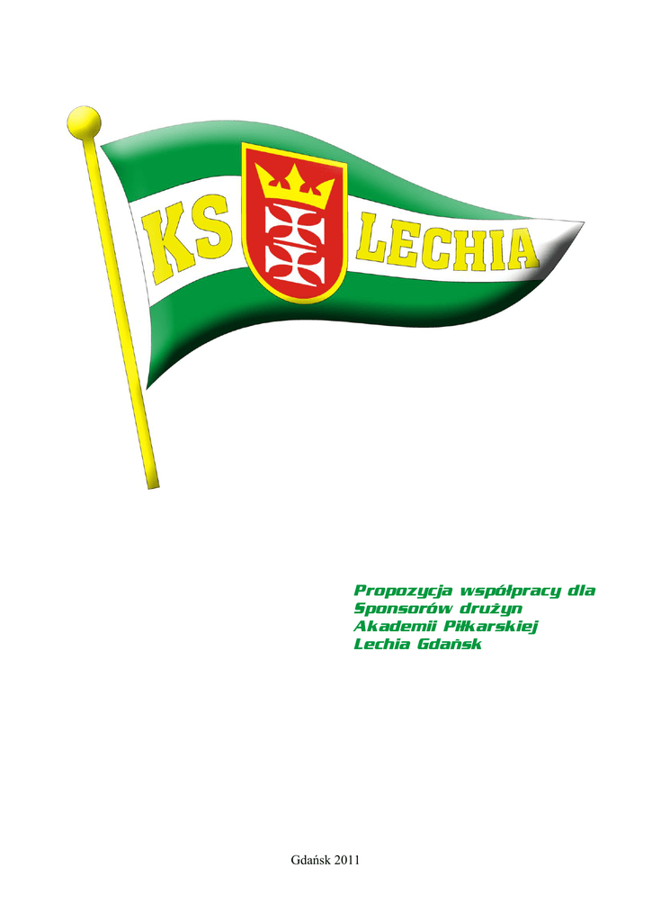 Propozycja współpracy dla Sponsorów drużyn Akademii Piłkarskiej Lechia Gdańsk Gdańsk 2011 Zawartość Wstęp ......................................................................................................................................................3 1. 1.1. Współpraca Akademia Piłkarska Lechia Gdańsk – Sponsor ..............................................................3 1.2. Szkolenie młodzieży w klubie ............................................................................................................3 1.3. Rozgrywki...........................................................................................................................................4 2. Prawa reklamowe dotyczące wybranych roczników młodzieżowych Akademii Piłkarskiej Lechia Gdańsk ...........................................................................................................................................................5 2.1. Tytuł i logo .........................................................................................................................................5 2.2. Stroje ...................................................................................................................................................5 2.3. Ekspozycje reklamowe .......................................................................................................................5 2.4. Ekspozycje logotypu ...........................................................................................................................6 2.5. Media ..................................................................................................................................................6 2.6. Działania PR .......................................................................................................................................7 Warunki współpracy...............................................................................................................................7 3. 3.1. Podsumowanie i warunki finansowe ..................................................................................................7 Akademia Piłkarska Lechia Gdańsk | Propozycja współpracy dla sponsorów drużyn APLG 1. Wstęp Akademia Piłkarska Lechia Gdańsk zajmuje się szkoleniem dzieci i młodzieży w wieku 7-16 lat. Naszym priorytetem jest wychowanie kolejnych piłkarskich pokoleń, które będą stanowić o sile pierwszego zespołu seniorów. Proces treningowy wszystkich drużyn odbywa się w oparciu o Wieloletni Plan Szkolenia. 1.1. Współpraca Akademia Piłkarska Lechia Gdańsk – Sponsor Proponujemy Państwu podjęcie współpracy na zasadzie Sponsora wybranej drużyny. Państwa firma może być promowana nie tylko w rejonie, ale również podczas wyjazdów danego zespołu na turnieje (w Polsce i za granicą) czy też obozy sportowe. 1.2. Szkolenie młodzieży w klubie Akademia za swój główny cel postawiła sobie szkolenie dzieci i młodzieży, przy założeniu, że w przyszłości będą oni stanowić wartość dodaną klubu – trzon pierwszej drużyny, a także przyczynią się do wzrostu poziomu polskiej piłki nożnej. Koncepcja Wieloletniego Planu Szkolenia młodych piłkarzy obejmuje okres od pierwszego kontaktu z piłką do momentu ukończenia wieku młodzieżowca (U-22). Szkolenie rozpoczynamy już w wieku 6 lat. Działamy dwutorowo – po pierwsze drużyny w Akademii, czyli chłopcy w wieku 7-15 lat. Po drugie Szkółka Piłkarska Lechista (5-12 lat), do której może zapisać się każde dziecko, i z której ma ułatwioną drogę do Akademii. Procesy szkolenia w obu podmiotach korelują ze sobą. Akademia Piłkarska Lechia Gdańsk | Propozycja współpracy dla sponsorów drużyn APLG Nabór najmłodszych chłopców prowadzony jest przez Szkółkę Piłkarską, gdzie mają szansę na pierwszy profesjonalny kontakt z piłką. W kolejnym etapie najzdolniejsi są przekazywani do Akademii, gdzie przechodzą poszczególne fazy szkolenia. Trzon kadry trenerskiej pracuje jednocześnie w Akademii oraz w Szkółce Piłkarskiej. Ułatwia to płynne przekazywanie zawodników między podmiotami. Ponadto praca w szkółce daje nam szansę na weryfikację umiejętności kandydatów na trenerów. Młodzież w Akademii trenuje zarówno w swoich grupach wiekowych, jak i uczestniczy w zajęciach indywidualnych, mających na celu podniesienie ich umiejętności na poszczególnych pozycjach na boisku. 1.3. Rozgrywki Zawodnicy uczestniczą w rozgrywkach piłkarskich organizowanych na różnych szczeblach (m.in. przez Pomorski Związek Piłki Nożnej czy Ekstraklasę SA). Nasze drużyny młodzieżowe: III Liga; MESA Juniorzy starsi (dwie drużyny); Juniorzy młodsi (dwie drużyny); Młodzicy starsi; Młodzicy młodsi; Trampkarze starsi; Trampkarze młodsi; Orliki; Żaki. Zawodnicy biorą udział w licznych turniejach piłkarskich w Polsce i za granicą. Staramy się aby były to turnieje o uznanej marce, podczas których nasze drużyny będą miały szansę sprawdzenia swoich umiejętności w rywalizacji z najlepszymi drużynami krajowymi i zagranicznymi w danej kategorii wiekowej. Akademia Piłkarska Lechia Gdańsk | Propozycja współpracy dla sponsorów drużyn APLG 2. Prawa reklamowe dotyczące wybranych roczników młodzieżowych Akademii Piłkarskiej Lechia Gdańsk 2.1. Tytuł i logo Prawo używania tytułu „Sponsor grup młodzieżowych Lechii Gdańsk z rocznika …” w działaniach reklamowych i PR (jako całości). 2.2. Stroje Prawo do umieszczania logotypu na strojach meczowych zawodników wybranego rocznika: oficjalne stroje meczowe (front koszulki); sprzęt sportowy (dresy, ortaliony, torby na sprzęt sportowy). 2.3. Ekspozycje reklamowe Baner lub banery reklamowe za bramką na terenie boiska treningowego i/lub boiska bocznego (banery zgodne z klubową standaryzacją nośników reklamowych). Baner lub banery reklamowe wzdłuż linii bocznej boiska, na kt